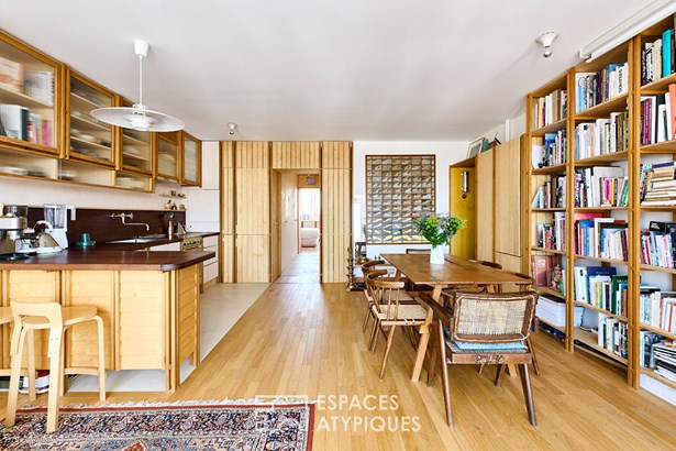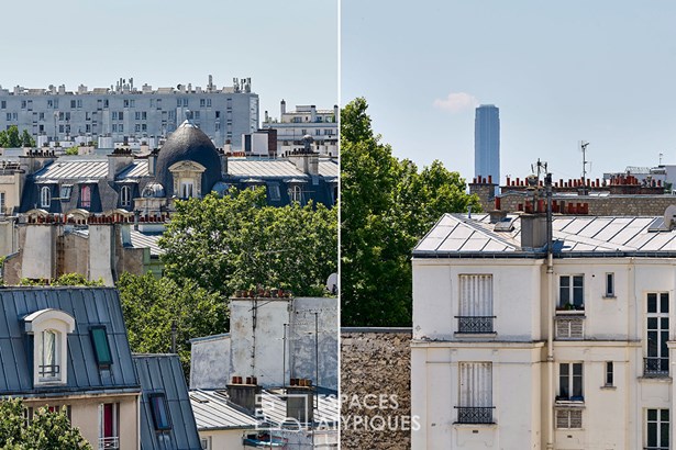 The 36 sqm living room, bathed in light, opens onto a west-facing balcony, offering an unobstructed view of the rooftops of Paris, without any vis-a-vis. It features a beautiful custom-made library, a convivial dining area, as well as an open L-shaped kitchen, which is part of a subtle play of contrasts: light wood, graphic lines and dark worktop, perfectly integrated into the whole.
