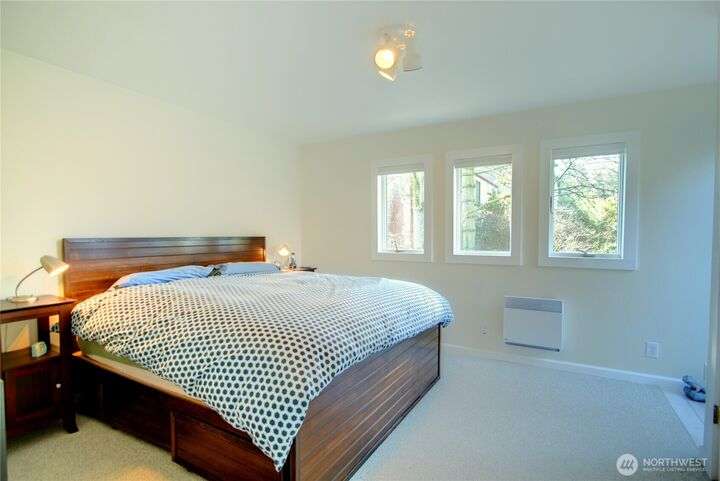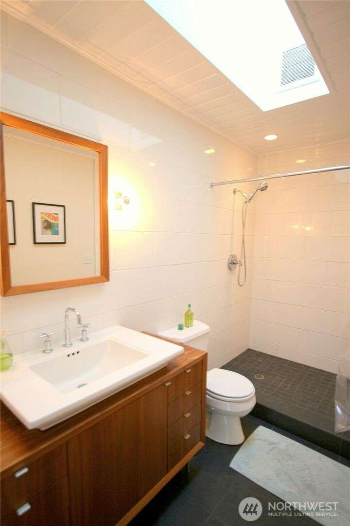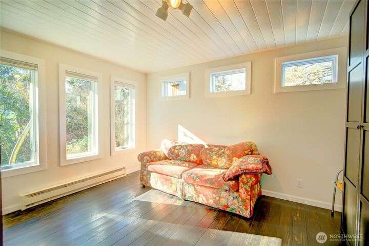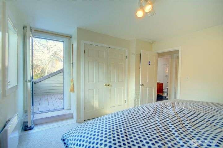 Montlake home with artistic details. Perched off the street to a dead-end road, arrive at this home nestled among the trees. Living room has large floor to ceiling windows for plentiful light and a gas burning stove. Vintage soda fountain stools line the kitchen counter, and French doors lead to the brick pathway from the separate dining room. A full bath, spacious laundry room and bonus niche complete the main level. Upstairs there’s 3 bedrooms, a skylit office, ¾ bath & sun deck. Low maintenance yard & two uncovered parking spaces. Minutes away to the UW, Hospital, University Village, The Arboretum, and some of the best cafes and restaurants in the area. No need to fight traffic for Husky games!1 dog under 25 lbs w/pet deposit