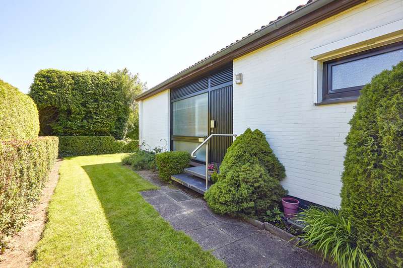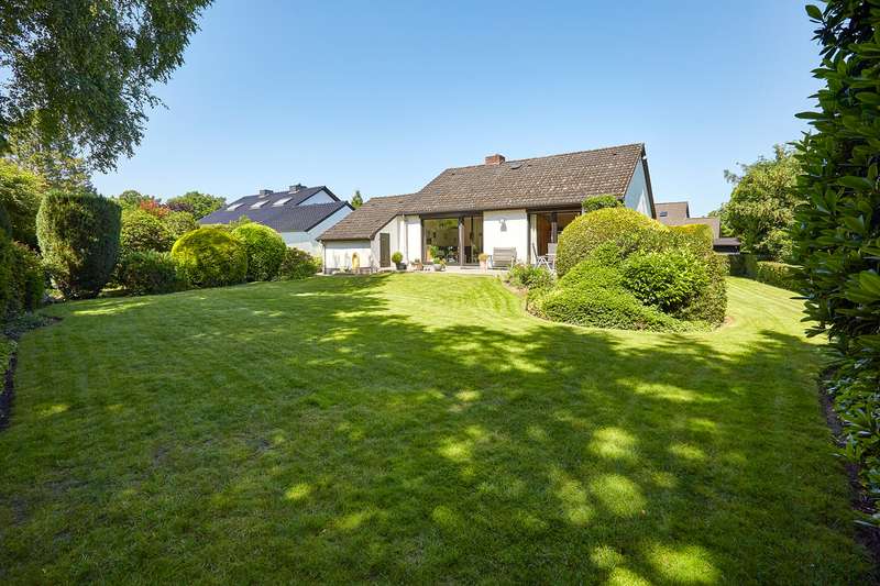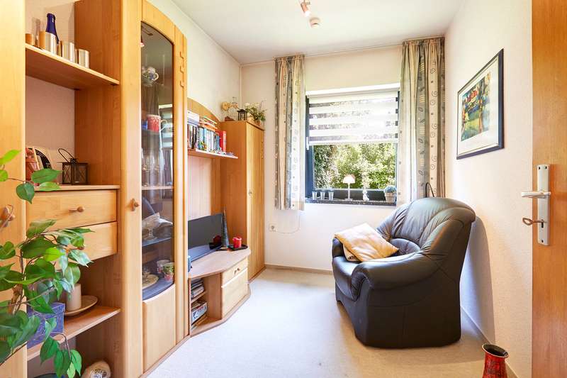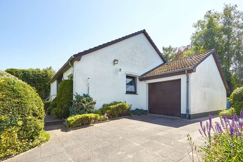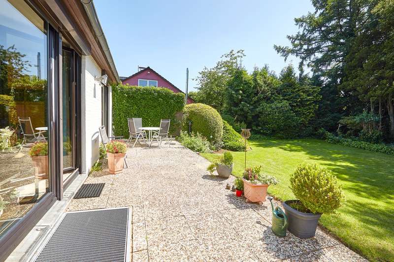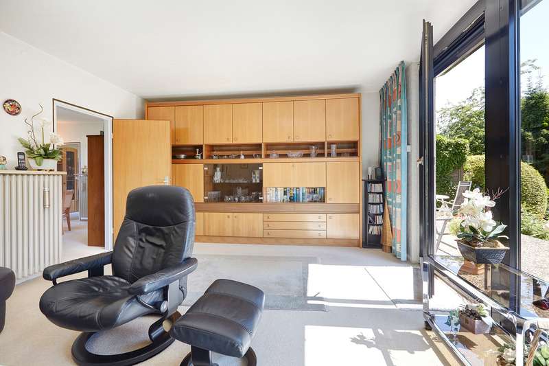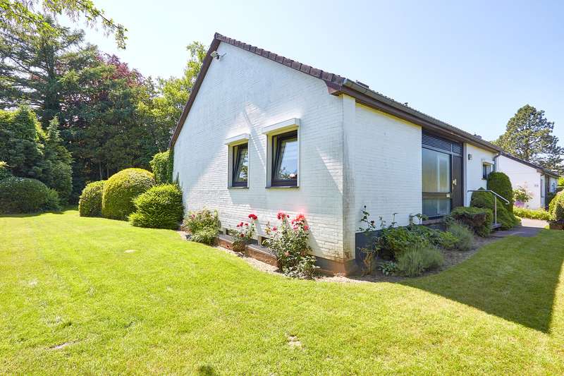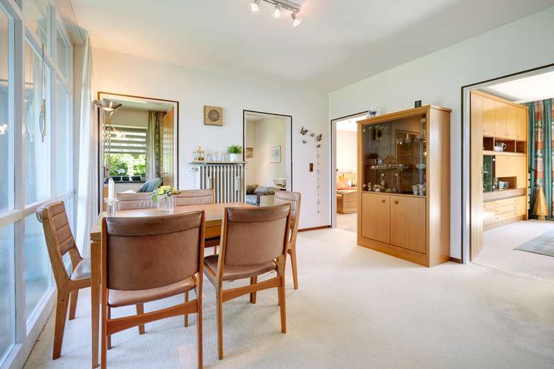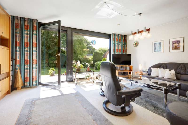 This attractive bungalow is situated on a plot of approx. 773 m² with an optimal south/west orientation and offers a living space of approx. 87 m². A vestibule with cellar access is followed by a spacious dining hall, which is very well lit by the glass partition and forms the heart of the property, from which all rooms lead off. A practical wardrobe niche allows you to store your jackets and shoes and leads to the full bathroom with window, which dates from the year of construction. The kitchen offers ample work surface and storage space with built-in cupboards on both sides. The large living area has a floor-to-ceiling window front and offers access to the sheltered south/west-facing terrace with a beautiful view of the private garden. The bedroom also has floor-to-ceiling windows and access to the terrace. The south/west-facing terrace extends across the entire width of the house and is bordered and sheltered from view by a storage room in the extension of the garage. Two further rooms, each with an area of approx. 7 m², are available for individual use as children's rooms, study rooms or guest rooms. They could be combined into one larger room if required. All living areas are currently carpeted. The detached house has a full basement. In addition to a large basement hallway, a boiler room, which also houses the oil tanks, and a shower room in the basement, there is also a spacious hobby cellar. A further cellar room and a storage room provide additional valuable storage space. Discover this tranquil property with potential!