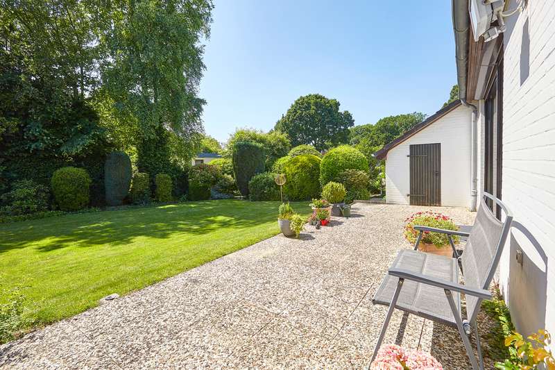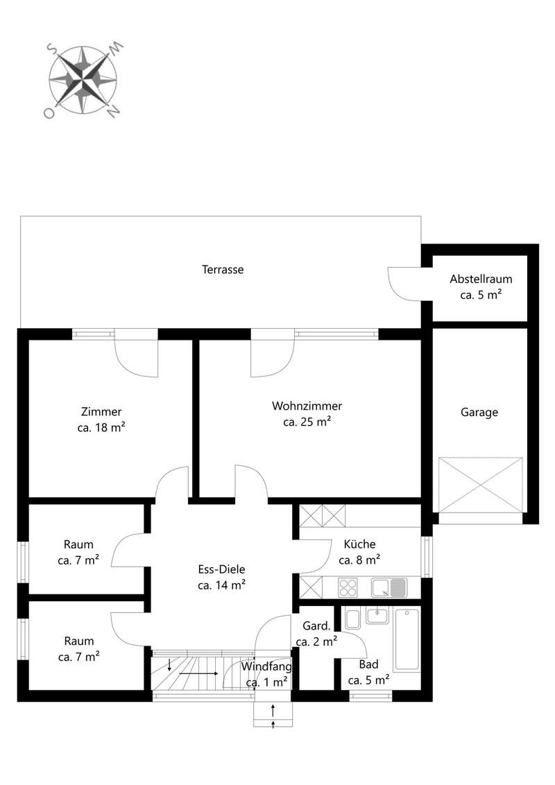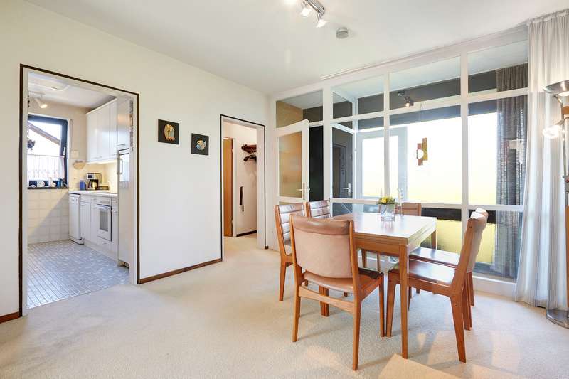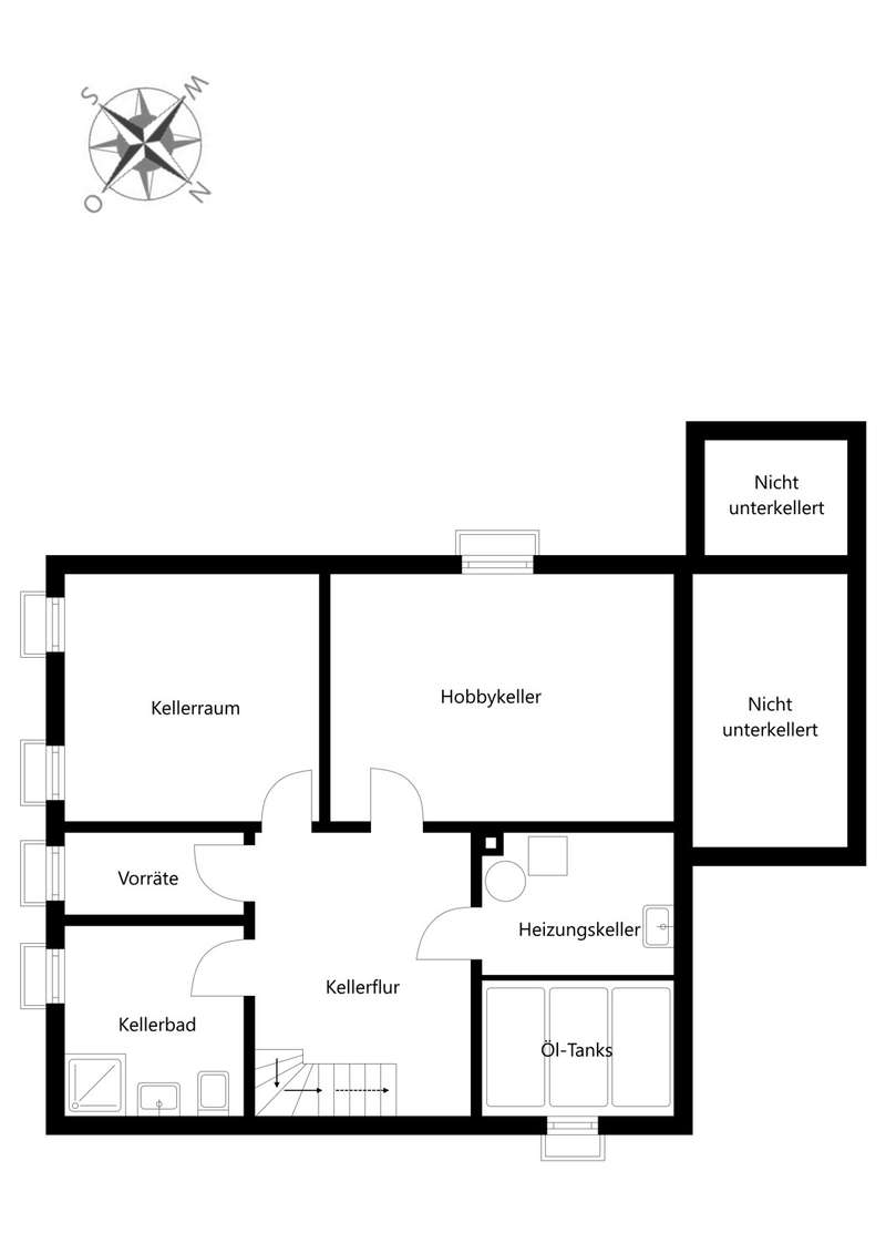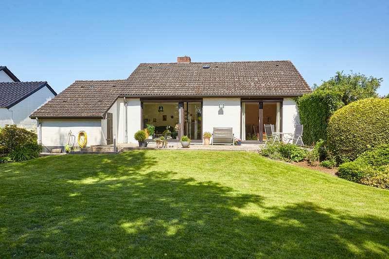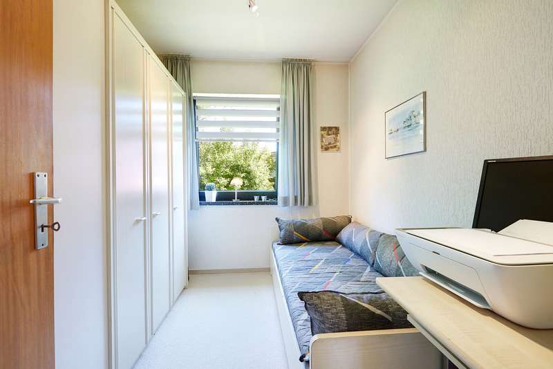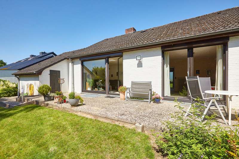 This attractive bungalow is situated on a plot of approx. 773 m² with an optimal south/west orientation and offers a living space of approx. 87 m². A vestibule with cellar access is followed by a spacious dining hall, which is very well lit by the glass partition and forms the heart of the property, from which all rooms lead off. A practical wardrobe niche allows you to store your jackets and shoes and leads to the full bathroom with window, which dates from the year of construction. The kitchen offers ample work surface and storage space with built-in cupboards on both sides. The large living area has a floor-to-ceiling window front and offers access to the sheltered south/west-facing terrace with a beautiful view of the private garden. The bedroom also has floor-to-ceiling windows and access to the terrace. The south/west-facing terrace extends across the entire width of the house and is bordered and sheltered from view by a storage room in the extension of the garage. Two further rooms, each with an area of approx. 7 m², are available for individual use as children's rooms, study rooms or guest rooms. They could be combined into one larger room if required. All living areas are currently carpeted. The detached house has a full basement. In addition to a large basement hallway, a boiler room, which also houses the oil tanks, and a shower room in the basement, there is also a spacious hobby cellar. A further cellar room and a storage room provide additional valuable storage space. Discover this tranquil property with potential!