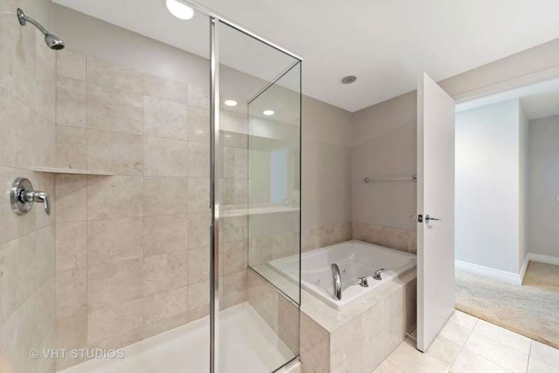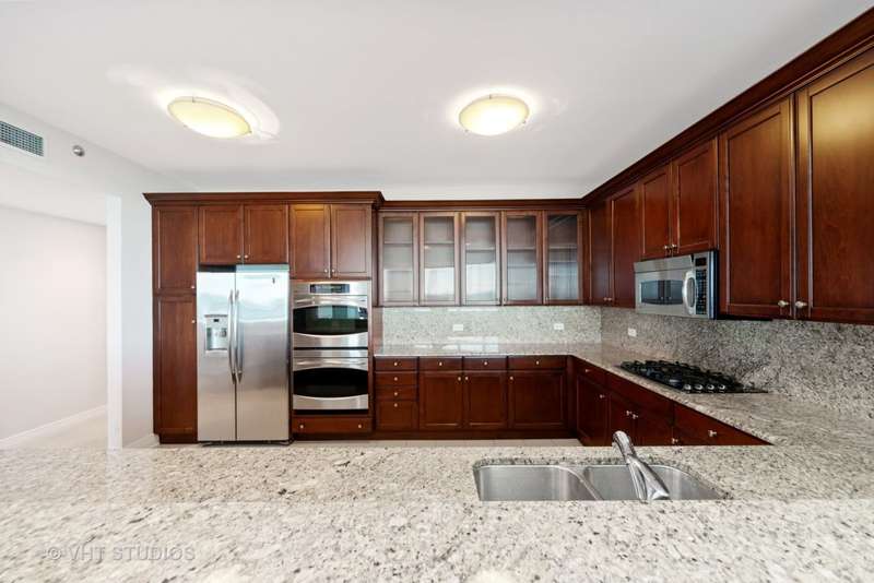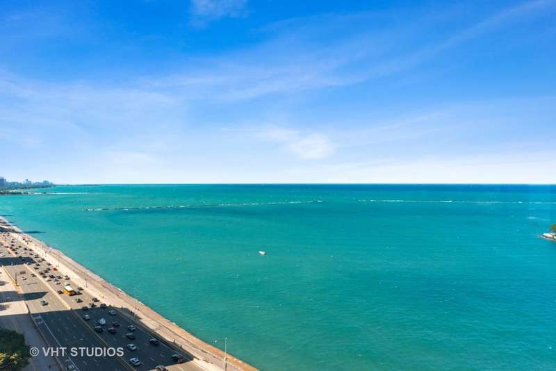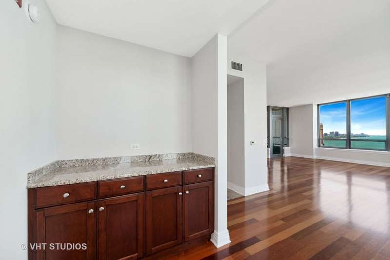 Greeted by a large open foyer dressed in travertine, with wonderful unobstructed views of Lake Michigan, the boats and ever popular Playpen. 4 natural cherry hardwood floors, Signature Belgravia tiered baseboards and moldings. Enormous walk in closet for bulk kitchen storage. Side by side LG Tromm Steam front load washer and dryer. A four person + kitchen with plenty of counter space for food prep and food display at holiday time. Raised bar for seating. Open kitchen to living and dining areas,. Upgraded GE Profile stainless steel appliances, Refrigerator with ice/water dispenser. Double oven. Overhead microwave and cooktop. Brookhaven Mahogany cabinetry with elegant crown and tumbled glass panes, rounded edge granite counters. Dry bar off living room with rounded granite. 2540 square foot true three bedroom split floor plan with 3.1 bathrooms. Third bedroom with views of Oak Street Beach, Olive Park and Navy Pier. Third bath dressed in consistent travertine, raised vanity, honed travertine counter All Kohler plumbing fixtures and large shower. Second full bath in travertine. Large balcony for at least a four top comfortably accessible from living room and second bedroom looking north up LSD, Lake Michigan and North Avenue Beach. Master suite with his and hers walk in closets, separate soaking tub and large shower. Bathroom is dressed in natural marble all light wood vanities and honed travertine counters. Roller shades throughout. Full amenities include 24 hour doorstaff, onsite management and maintenance, two roof top decks, party/lounge rooms and full kitchens. State of the art gym WITH NEW PILATES REFORMER AND GOLF SIMULATOR. Dry cleaners. Two garage side by side parking spaces (P536, P537) are $50,000 each. A third parking space can be purchased. Asking price is $50,000. FOUR PIPE HEATING AND COOLING SYSTEM.
