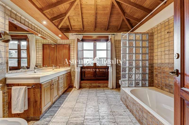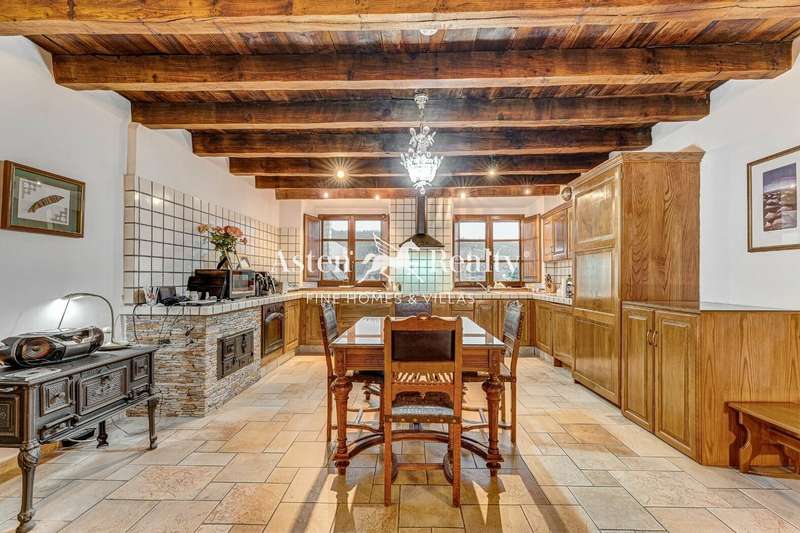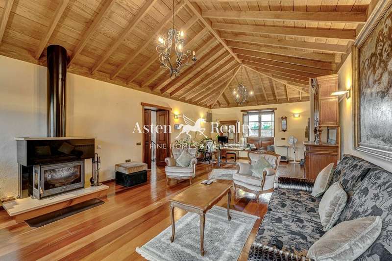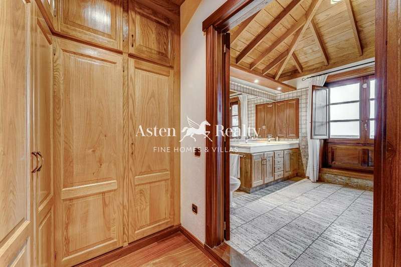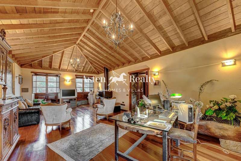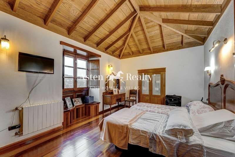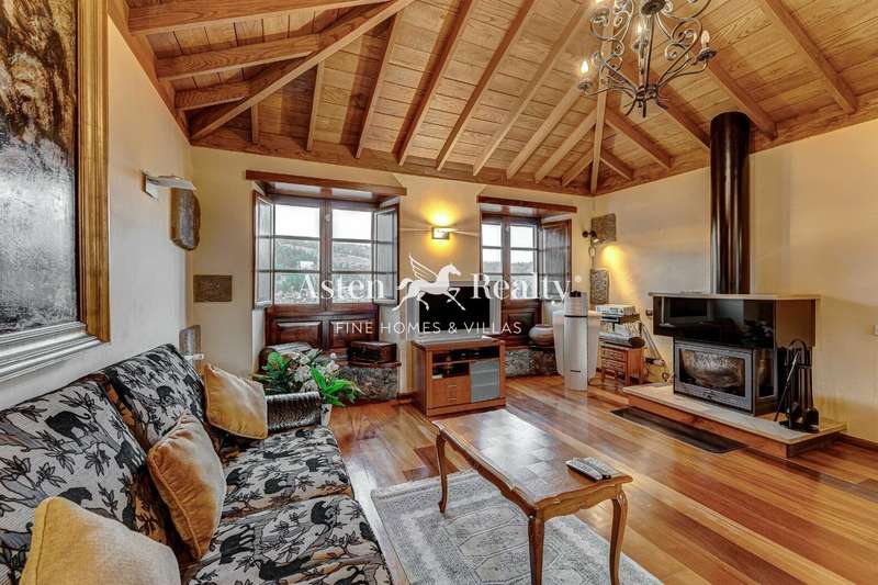 Entering the house, the visitor finds a high hall made of stone and wood where a warm and welcoming atmosphere is breathed. From there, we can see the rooms on the ground floor and on the left, following the wooden and wrought iron staircase, the rest on the upper floor with its majestic solid wood ceiling. The upper floor has a large open-plan living room with a fireplace, with the office area on one side facing the street and the living area on the other, with views of the fields and mountains in the distance. On this floor there is a master bedroom with the same views, a large bathroom and a dressing room.