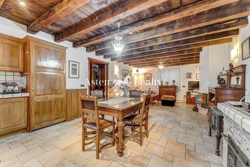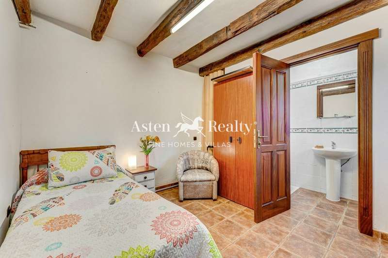 Going down from the hall we find on the right hand side a bedroom with a full bathroom and on the left, another large living room with a dining room, fireplace and a modern kitchen that maintains its rustic appearance and includes the antique oven.