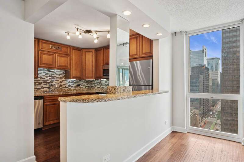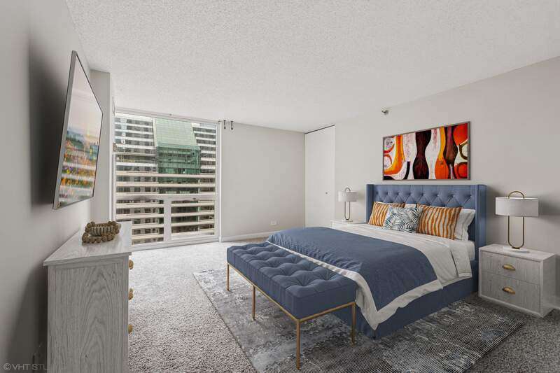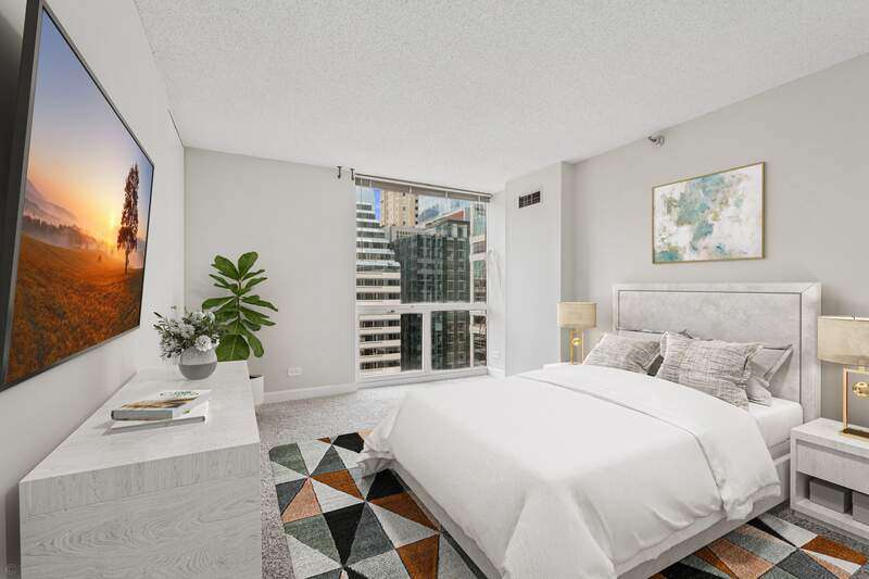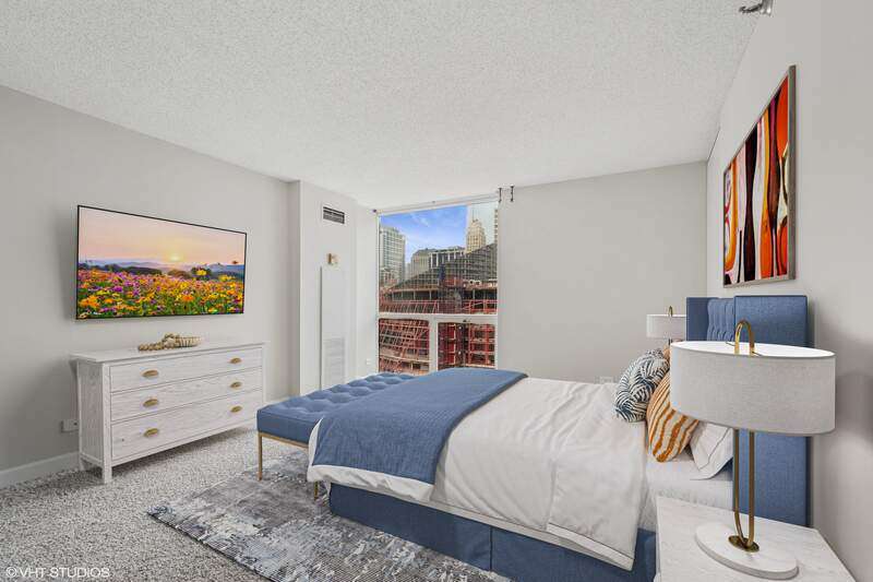 **Stunning Southwest Corner Residence in the Heart of Chicago's Iconic Theater District** Welcome to an exceptional residence perfectly situated in the vibrant Chicago Loop. This expansive, sun-drenched southwest corner unit offers dramatic floor-to-ceiling windows framing panoramic city and sunset views, visible from nearly every room and your private balcony. Designed for modern living and effortless entertaining, the open-concept living and formal dining area flows seamlessly into a sleek, contemporary kitchen featuring crisp white cabinetry, stainless steel appliances, quartz countertops, and a convenient breakfast bar. The home features hardwood floors, brand-new carpet in bedrooms, and is Newly Painted. The spacious primary suite is a tranquil retreat, complete with generous closet space and a beautifully appointed bathroom. Additional highlights include wide-plank wood laminate flooring throughout, custom upgrades, and dedicated storage. Set within a full-amenity building, residents enjoy 24-hour door staff, an indoor pool, sundeck, state-of-the-art fitness center, bike storage, laundry room, and direct access to Chicago's famed Pedway system, connecting you to shopping, dining, and cultural landmarks. A+ location just steps from Michigan Avenue, Millennium Park, the Riverwalk, premier dining, transportation, and entertainment venues. **Investor friendly-no rental cap. Monthly assessments include all utilities except electric.** Don't miss this rare opportunity to own a spectacular corner unit in one of downtown Chicago's most coveted addresses! NOTE: There is NO IN unit washer and dryer however building allows installation for an in unit washer and dryer.