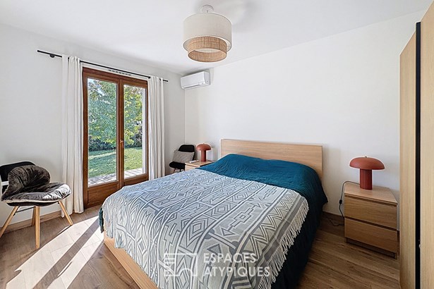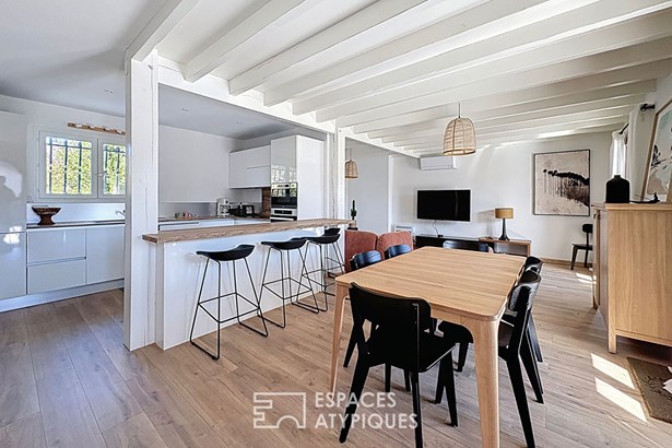 The entrance opens onto a spacious, light-filled living area, where a wood-burning stove and reversible air conditioning ensure year-round comfort.