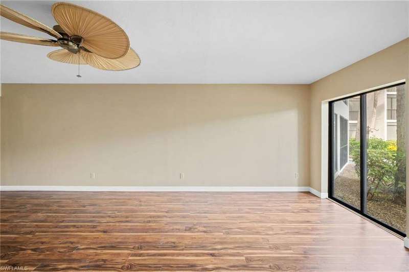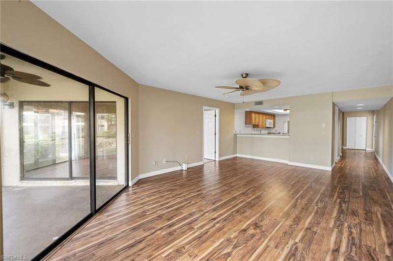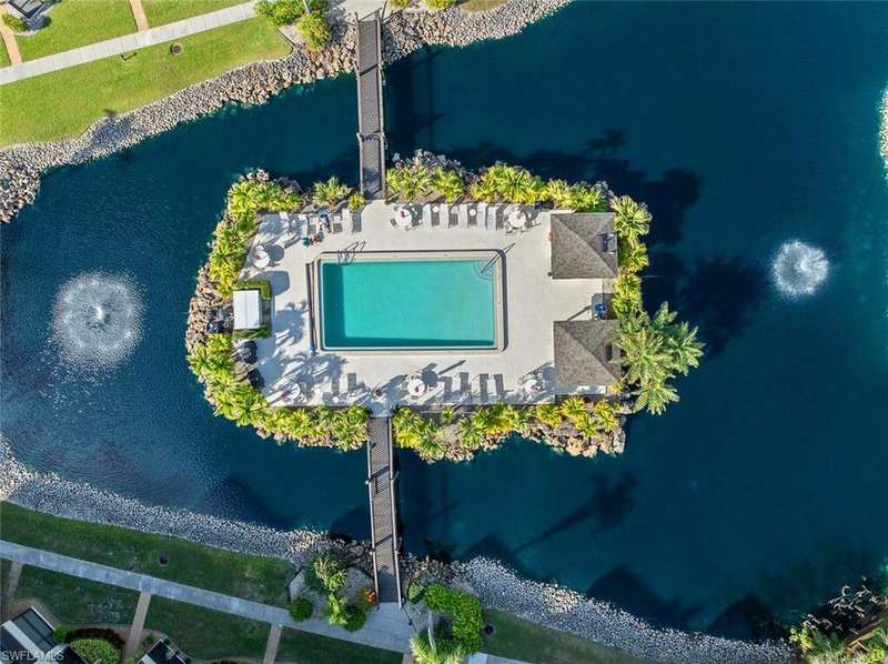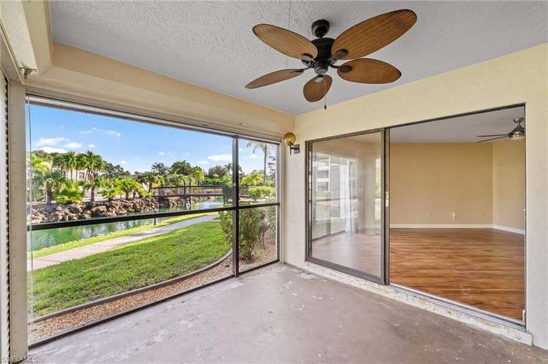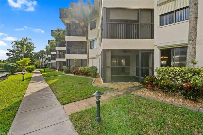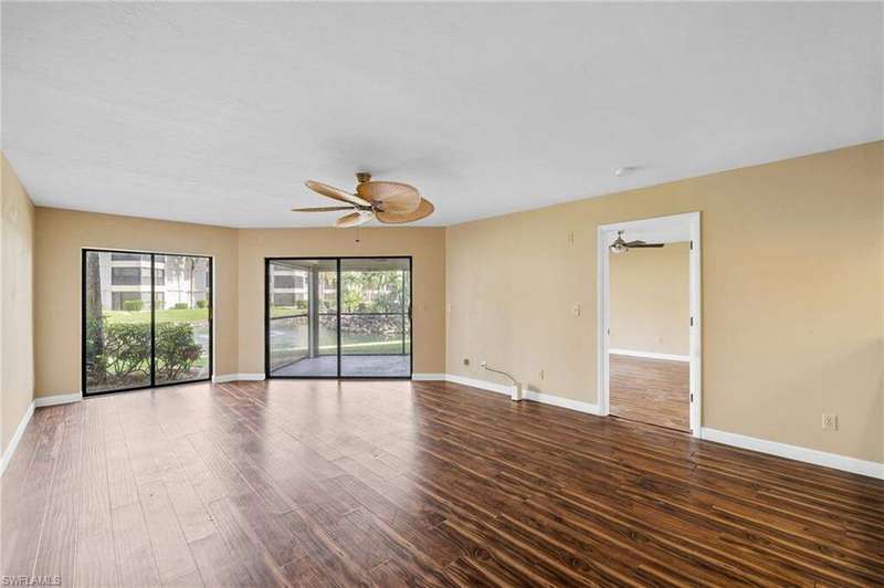 Welcome to this beautifully appointed first-floor unit featuring 2 bedrooms plus a den - perfect for a home office or easily convertible into a third bedroom. With granite countertops and laminate flooring throughout, this home offers both style and durability. The open-concept layout flows seamlessly into the master suite, which boasts dual sinks and a walk-in shower for a spa-like experience. Enjoy serene views of the water feature and direct access to the community pool, making relaxation effortless. Don't miss this opportunity for flexible living in a resort-style setting! Please note...the quarterly condo fees include Water, Sewer, Internet and Basic Cable as noted in the listing details.