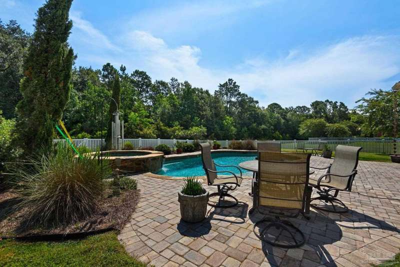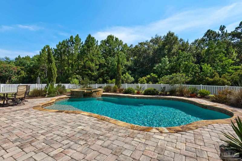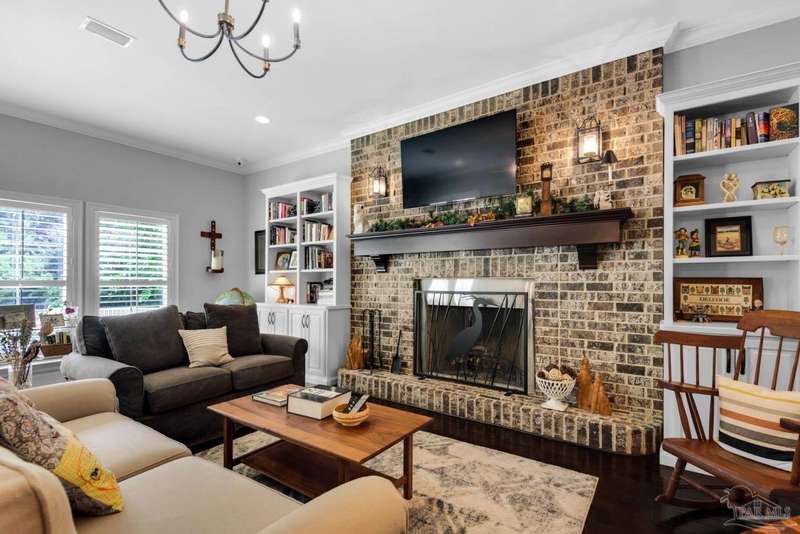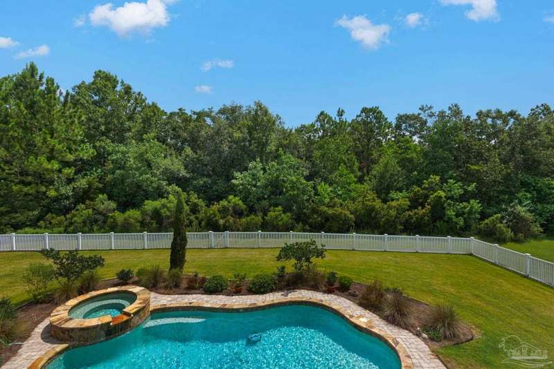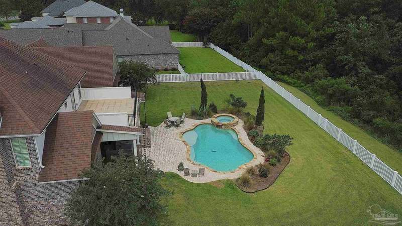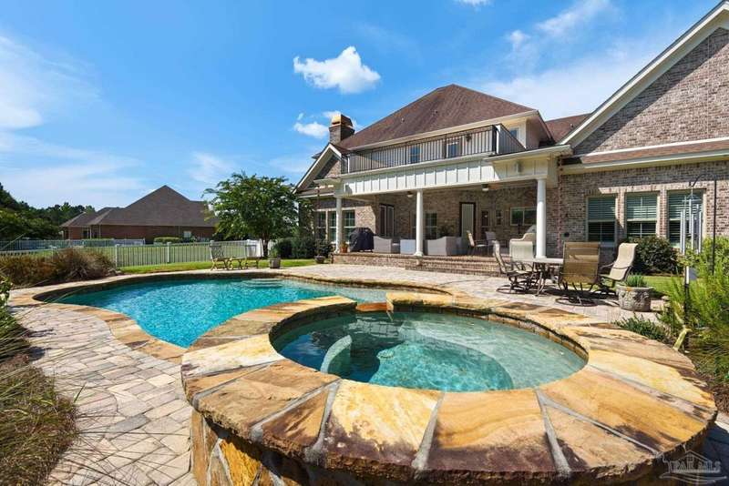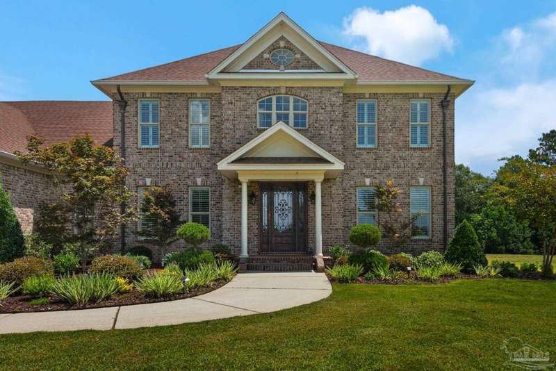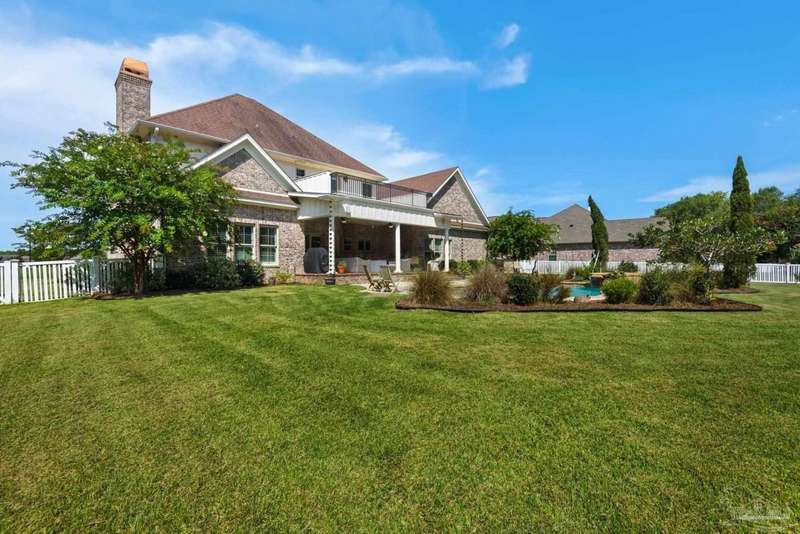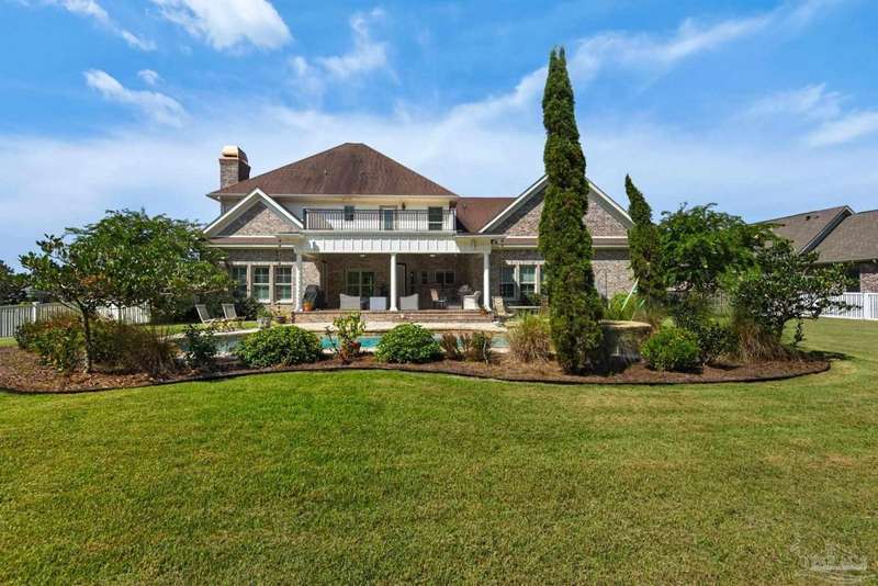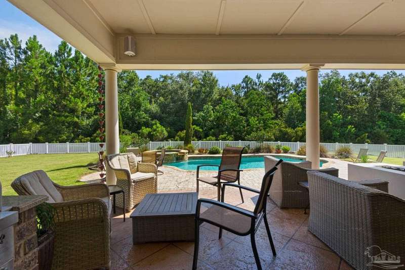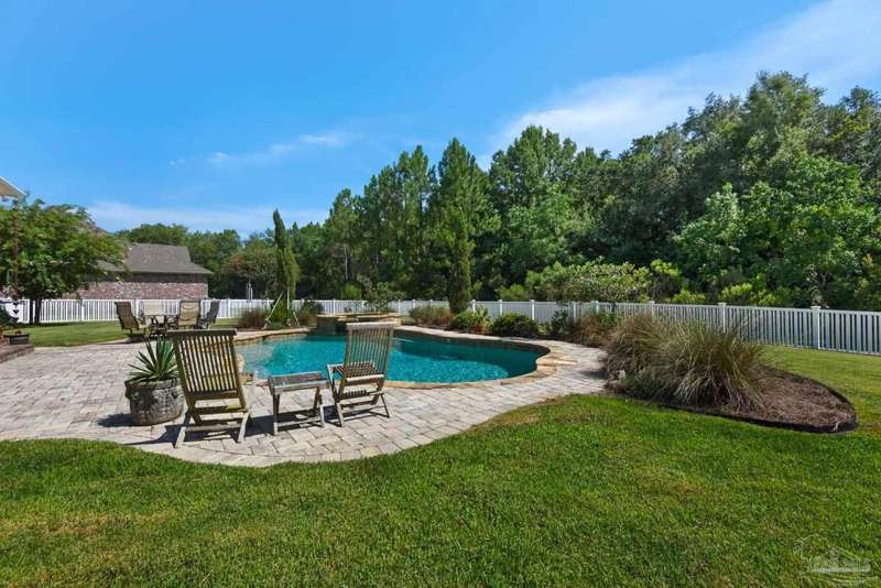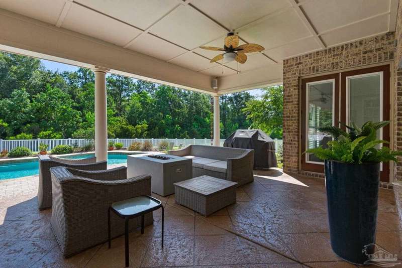 Nestled on an oversized lot in the gated Highlands section of The Moors, this elegant home offers unrivaled privacy and serenity. Boarded by a lush green space and spanning approximately 4,719 sqft, the thoughtfully designed layout combines comfort and style. The home features 6 bedrooms, 5 with walk-in closets, and 4 1/2 bathrooms, a dedicated office space, along with 2 versatile bonus rooms ideal for hobbies, media, or a private gym. The foyer welcomes you with soaring ceilings and a grand staircase. The open and airy atmosphere is enhanced by ten-foot ceilings on the first level. Through the foyer you are greeted by distinct yet open spaces that flow seamlessly by design. A room adjacent to the foyer is perfect for media or a private office. The expansive family room has an oversized fireplace and built-in bookcases, creating a warm gathering space. The gourmet kitchen features bar seating and flows seamlessly into the dining area - perfect for entertaining. The primary suite is a retreat, complete with built-in cabinetry and an electric fireplace. The spa-like bathroom includes a walk-in shower, soaking tub, double vanity, and two walk-in closets. On the first floor, you'll also find a guest bedroom with an attached bath, a spacious laundry room, and a second staircase. Upstairs there are 4 bedrooms, 2 baths, a dedicated office space with built-in desk and hutch, a bonus room, and a sun deck overlooking the backyard -ideal for relaxation. The backyard is an entertainer's dream: a covered lanai with an outdoor kitchen, ample spade for al fresco dining, and a paver patio leading to a heated sparkling quartz gunite pool with an attached spa. Professionally landscaped gardens and flagstone edging complete this outdoor paradise. Additional features include a Sonos sound system, oversized 3-car garage, irrigation well, security system, impact windows, underground propane tank, 2 gas lanterns, and proximity to The Moors Fitness Center and Clubhouse - just minutes away.
