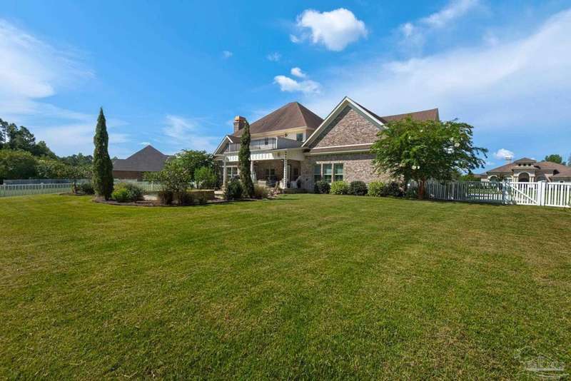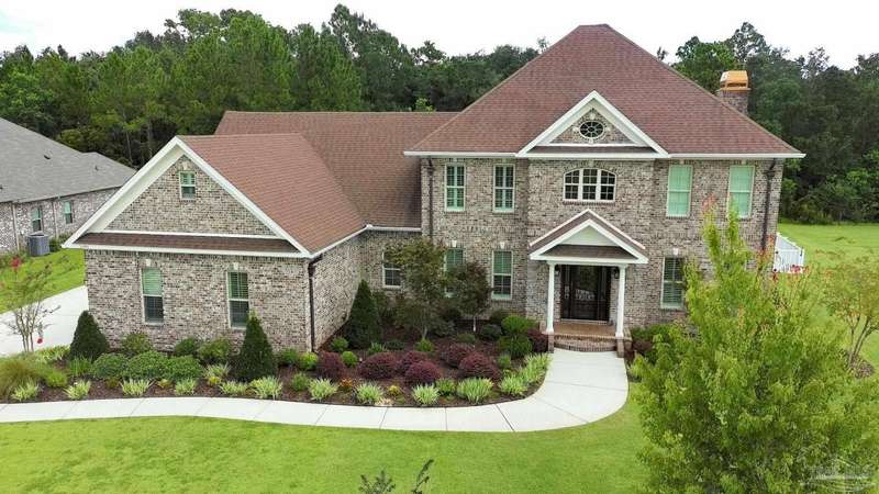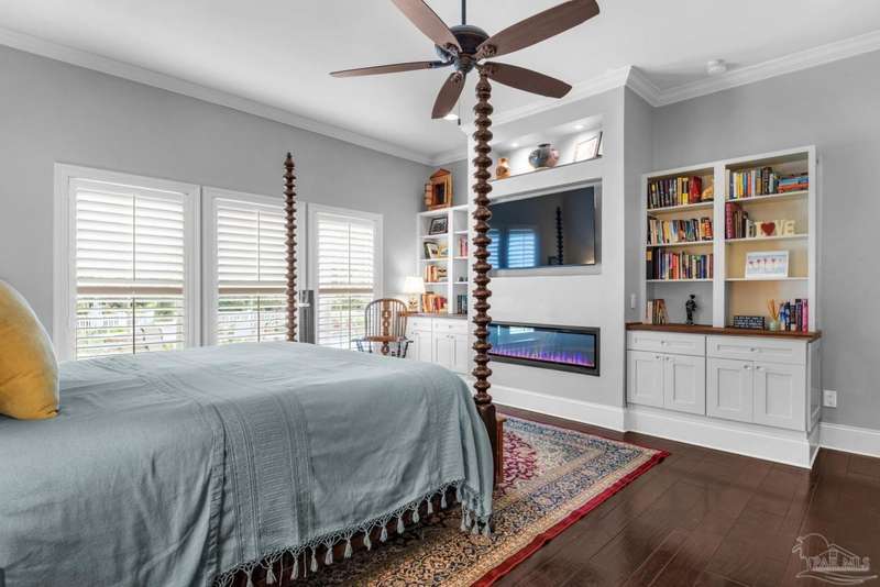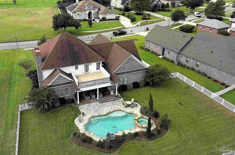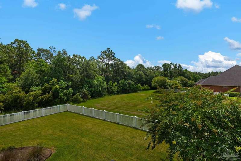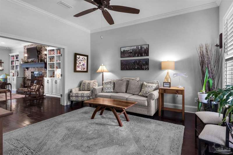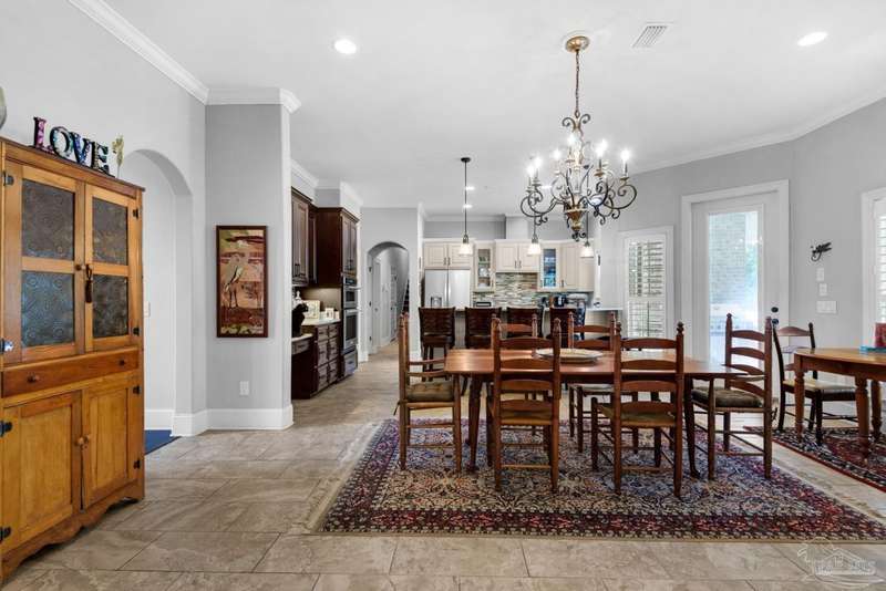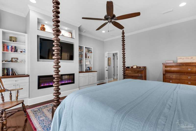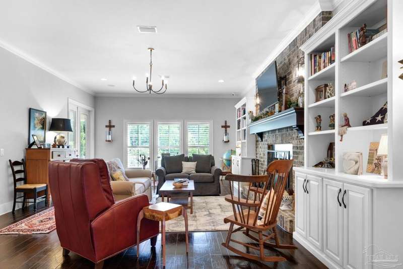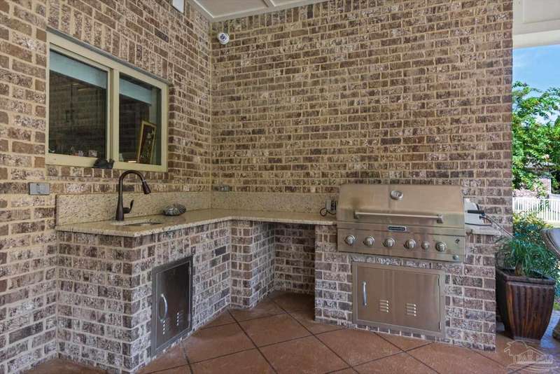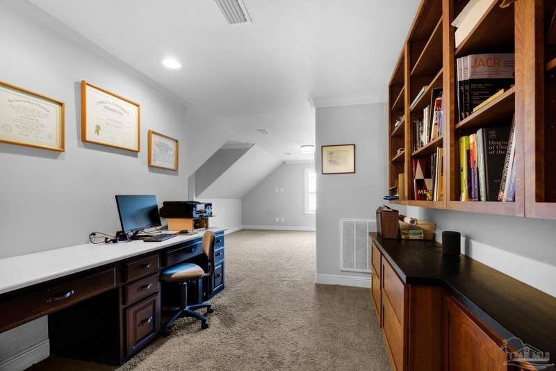 Nestled on an oversized lot in the gated Highlands section of The Moors, this elegant home offers unrivaled privacy and serenity. Boarded by a lush green space and spanning approximately 4,719 sqft, the thoughtfully designed layout combines comfort and style. The home features 6 bedrooms, 5 with walk-in closets, and 4 1/2 bathrooms, a dedicated office space, along with 2 versatile bonus rooms ideal for hobbies, media, or a private gym. The foyer welcomes you with soaring ceilings and a grand staircase. The open and airy atmosphere is enhanced by ten-foot ceilings on the first level. Through the foyer you are greeted by distinct yet open spaces that flow seamlessly by design. A room adjacent to the foyer is perfect for media or a private office. The expansive family room has an oversized fireplace and built-in bookcases, creating a warm gathering space. The gourmet kitchen features bar seating and flows seamlessly into the dining area - perfect for entertaining. The primary suite is a retreat, complete with built-in cabinetry and an electric fireplace. The spa-like bathroom includes a walk-in shower, soaking tub, double vanity, and two walk-in closets. On the first floor, you'll also find a guest bedroom with an attached bath, a spacious laundry room, and a second staircase. Upstairs there are 4 bedrooms, 2 baths, a dedicated office space with built-in desk and hutch, a bonus room, and a sun deck overlooking the backyard -ideal for relaxation. The backyard is an entertainer's dream: a covered lanai with an outdoor kitchen, ample spade for al fresco dining, and a paver patio leading to a heated sparkling quartz gunite pool with an attached spa. Professionally landscaped gardens and flagstone edging complete this outdoor paradise. Additional features include a Sonos sound system, oversized 3-car garage, irrigation well, security system, impact windows, underground propane tank, 2 gas lanterns, and proximity to The Moors Fitness Center and Clubhouse - just minutes away.