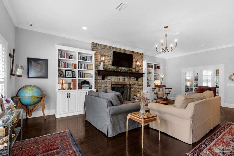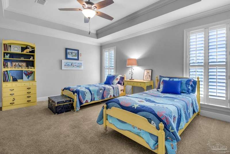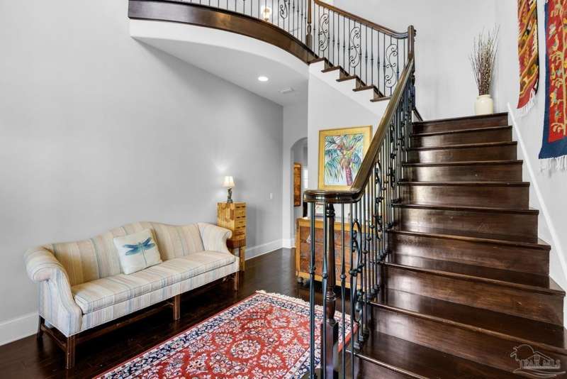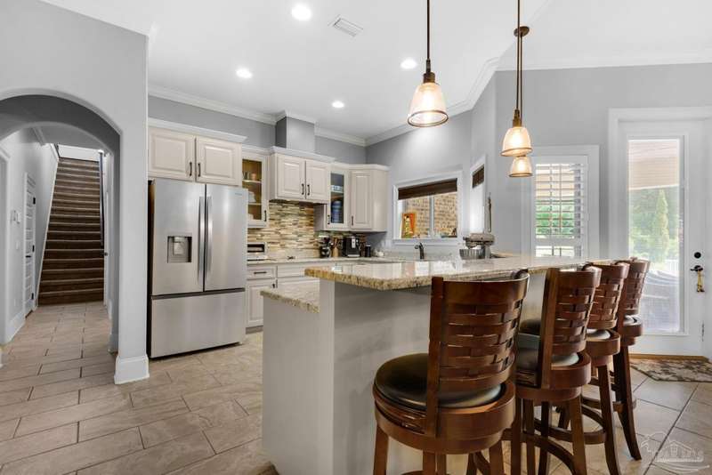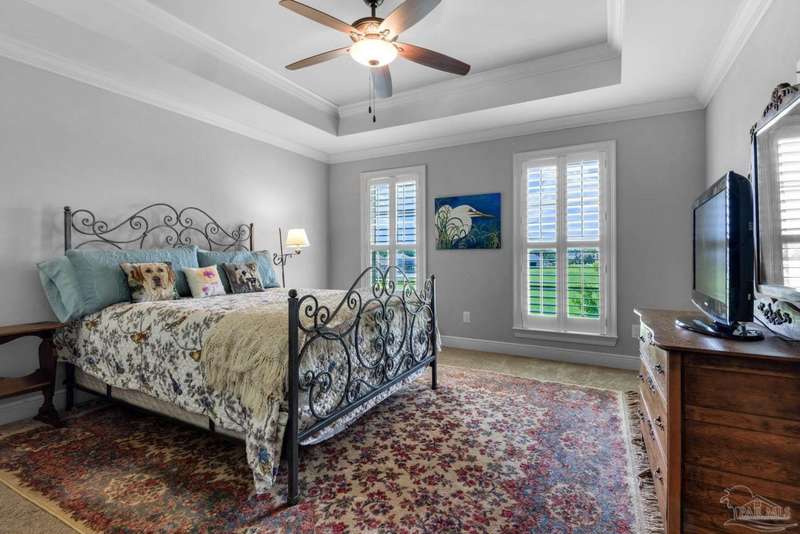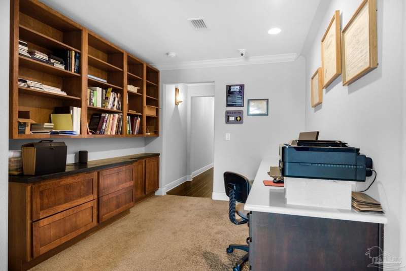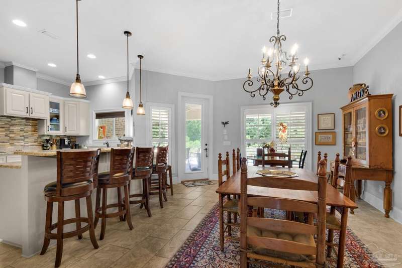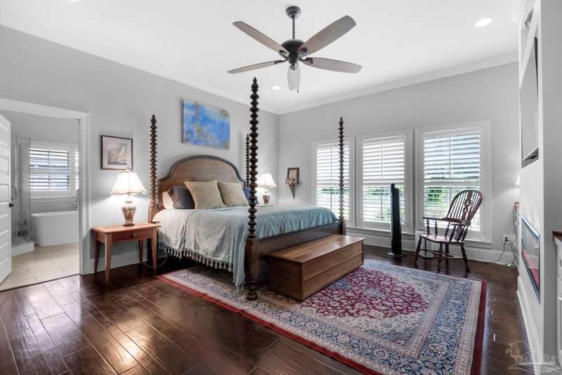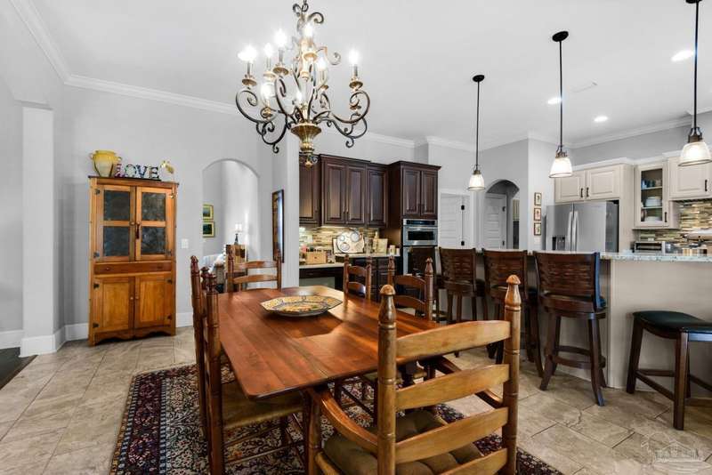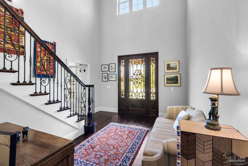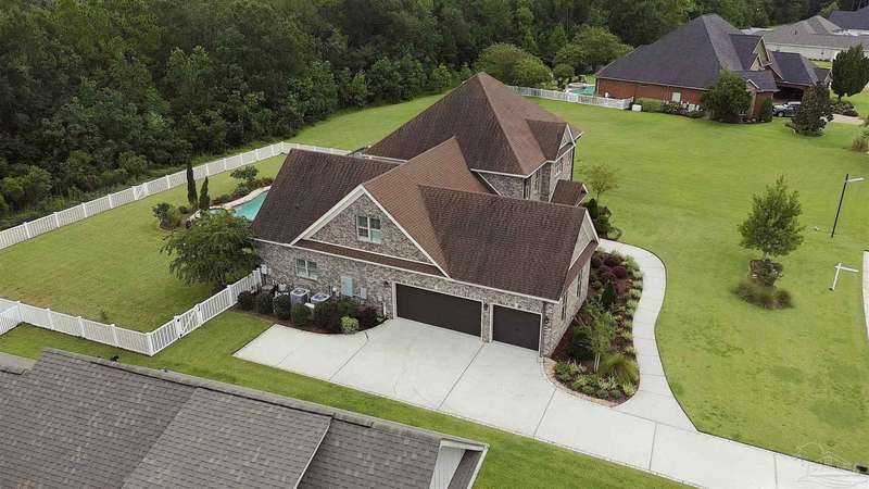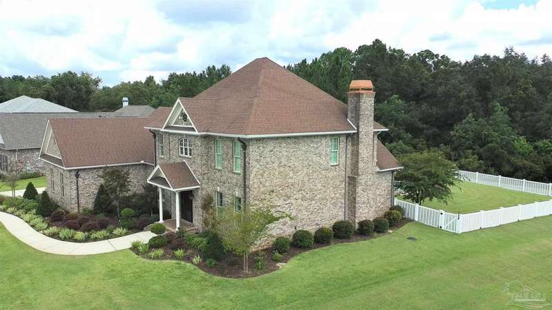 Nestled on an oversized lot in the gated Highlands section of The Moors, this elegant home offers unrivaled privacy and serenity. Boarded by a lush green space and spanning approximately 4,719 sqft, the thoughtfully designed layout combines comfort and style. The home features 6 bedrooms, 5 with walk-in closets, and 4 1/2 bathrooms, a dedicated office space, along with 2 versatile bonus rooms ideal for hobbies, media, or a private gym. The foyer welcomes you with soaring ceilings and a grand staircase. The open and airy atmosphere is enhanced by ten-foot ceilings on the first level. Through the foyer you are greeted by distinct yet open spaces that flow seamlessly by design. A room adjacent to the foyer is perfect for media or a private office. The expansive family room has an oversized fireplace and built-in bookcases, creating a warm gathering space. The gourmet kitchen features bar seating and flows seamlessly into the dining area - perfect for entertaining. The primary suite is a retreat, complete with built-in cabinetry and an electric fireplace. The spa-like bathroom includes a walk-in shower, soaking tub, double vanity, and two walk-in closets. On the first floor, you'll also find a guest bedroom with an attached bath, a spacious laundry room, and a second staircase. Upstairs there are 4 bedrooms, 2 baths, a dedicated office space with built-in desk and hutch, a bonus room, and a sun deck overlooking the backyard -ideal for relaxation. The backyard is an entertainer's dream: a covered lanai with an outdoor kitchen, ample spade for al fresco dining, and a paver patio leading to a heated sparkling quartz gunite pool with an attached spa. Professionally landscaped gardens and flagstone edging complete this outdoor paradise. Additional features include a Sonos sound system, oversized 3-car garage, irrigation well, security system, impact windows, underground propane tank, 2 gas lanterns, and proximity to The Moors Fitness Center and Clubhouse - just minutes away.