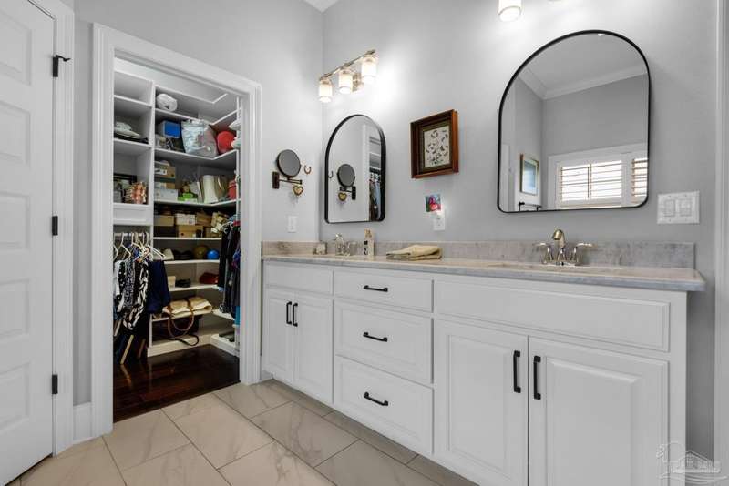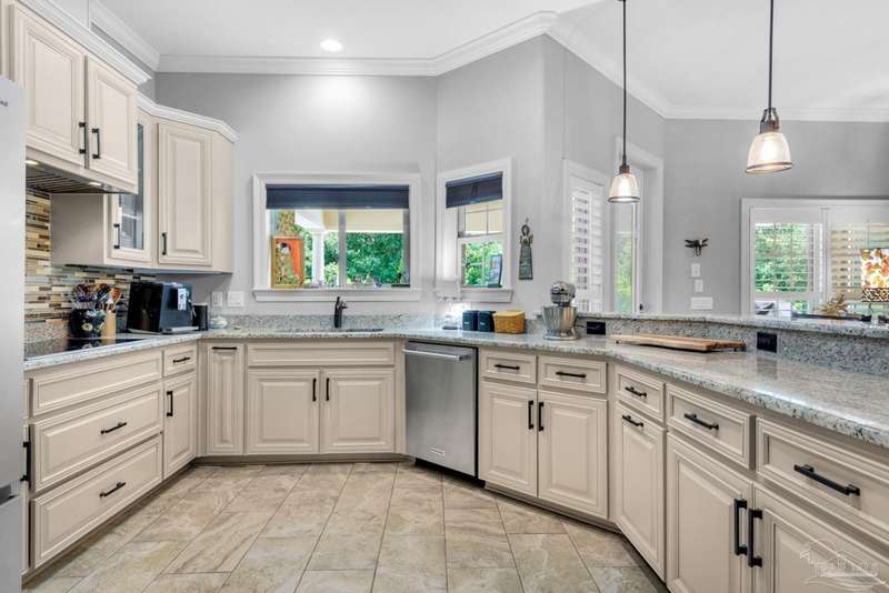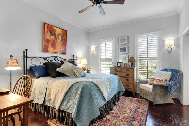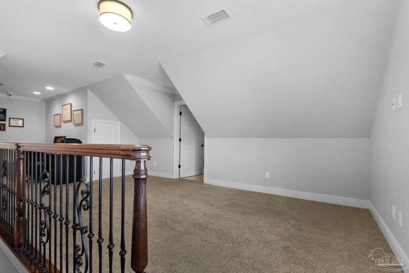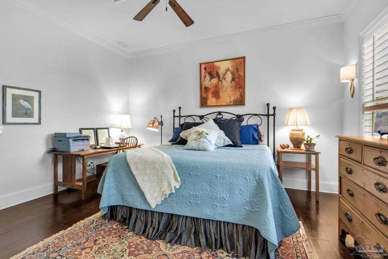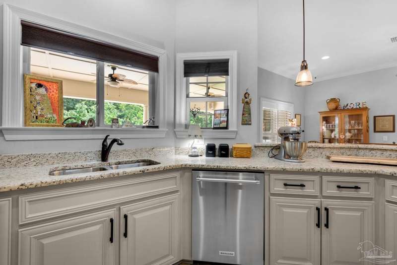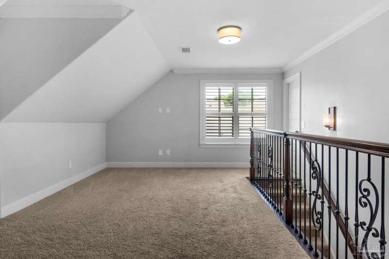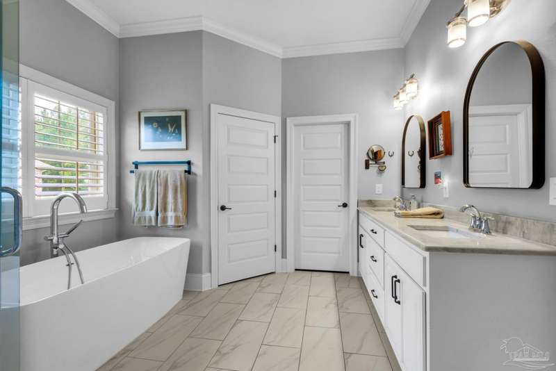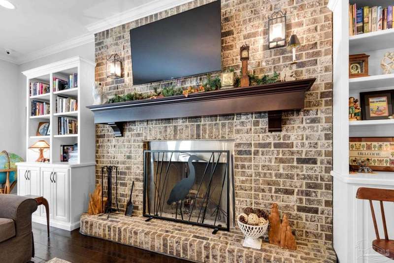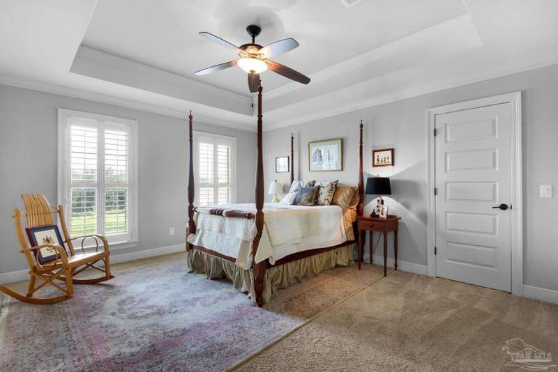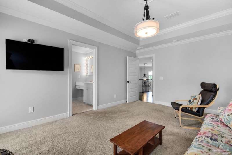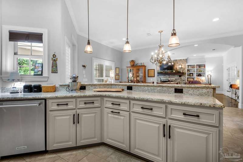 Nestled on an oversized lot in the gated Highlands section of The Moors, this elegant home offers unrivaled privacy and serenity. Boarded by a lush green space and spanning approximately 4,719 sqft, the thoughtfully designed layout combines comfort and style. The home features 6 bedrooms, 5 with walk-in closets, and 4 1/2 bathrooms, a dedicated office space, along with 2 versatile bonus rooms ideal for hobbies, media, or a private gym. The foyer welcomes you with soaring ceilings and a grand staircase. The open and airy atmosphere is enhanced by ten-foot ceilings on the first level. Through the foyer you are greeted by distinct yet open spaces that flow seamlessly by design. A room adjacent to the foyer is perfect for media or a private office. The expansive family room has an oversized fireplace and built-in bookcases, creating a warm gathering space. The gourmet kitchen features bar seating and flows seamlessly into the dining area - perfect for entertaining. The primary suite is a retreat, complete with built-in cabinetry and an electric fireplace. The spa-like bathroom includes a walk-in shower, soaking tub, double vanity, and two walk-in closets. On the first floor, you'll also find a guest bedroom with an attached bath, a spacious laundry room, and a second staircase. Upstairs there are 4 bedrooms, 2 baths, a dedicated office space with built-in desk and hutch, a bonus room, and a sun deck overlooking the backyard -ideal for relaxation. The backyard is an entertainer's dream: a covered lanai with an outdoor kitchen, ample spade for al fresco dining, and a paver patio leading to a heated sparkling quartz gunite pool with an attached spa. Professionally landscaped gardens and flagstone edging complete this outdoor paradise. Additional features include a Sonos sound system, oversized 3-car garage, irrigation well, security system, impact windows, underground propane tank, 2 gas lanterns, and proximity to The Moors Fitness Center and Clubhouse - just minutes away.