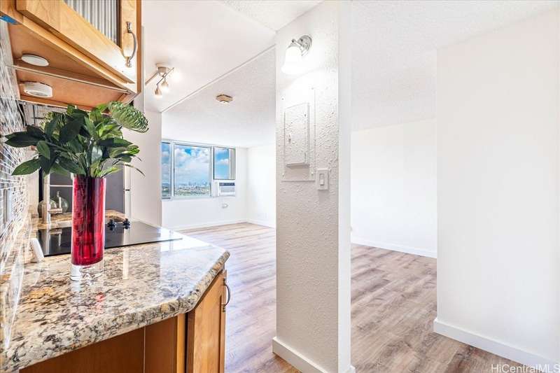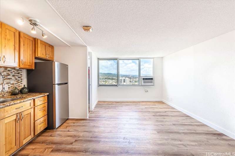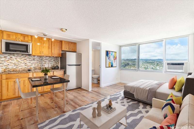 High floor! Beautiful and well-maintained studio at Pearlridge Square with 1 covered parking stall. Enjoy stunning views of the ocean, golf course, Diamond Head, Pearl Harbor, mountains, city, and sunrise. Recent upgrades include: brand-new high-quality vinyl plank flooring installed in June 2025, fresh paint, new refrigerator, refinished kitchen, bathroom cabinetry and walk-in shower. Amenities include: pool, sauna, tennis courts, fitness center, tennis courts, library, recreation area, community laundry, on-site resident manager's office in the lobby and ample guest parking. Conveniently located in the heart of Aiea, near Pearlridge Mall, shopping, and dining, Pearlridge Skyline Station, Pali Momi Medical Center, Pearl Country Club, Pearl Harbor, Hickam Air Force Base, HNL airport, and on/off ramps to the H-1 freeway.