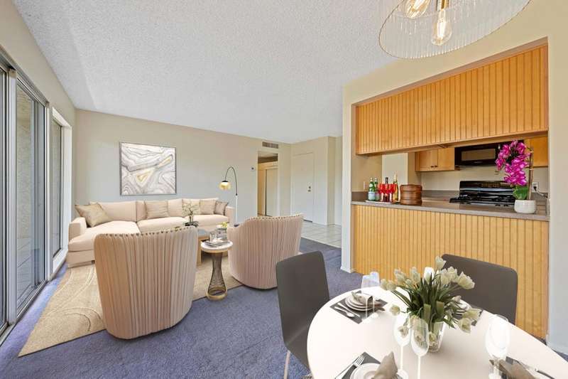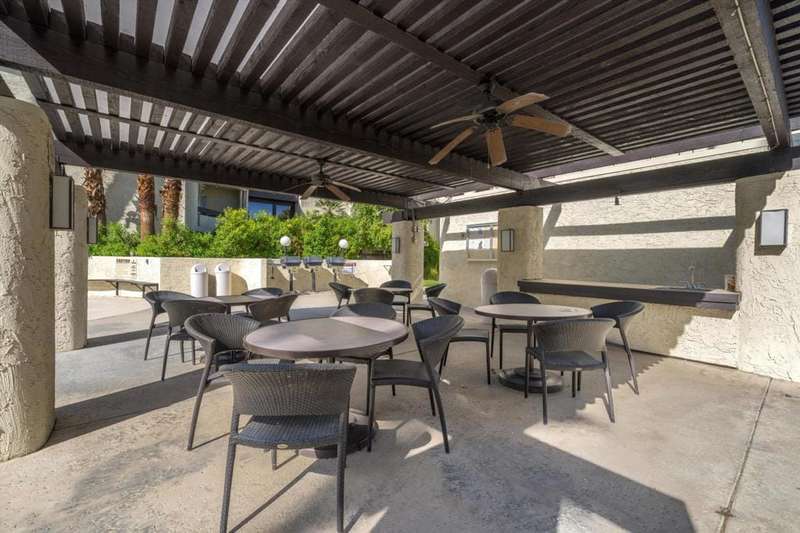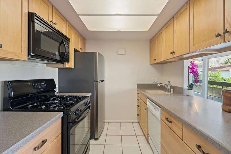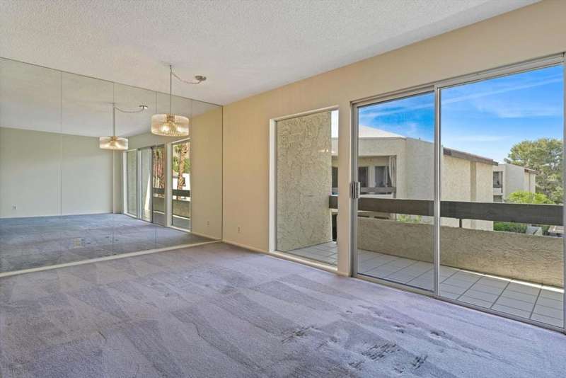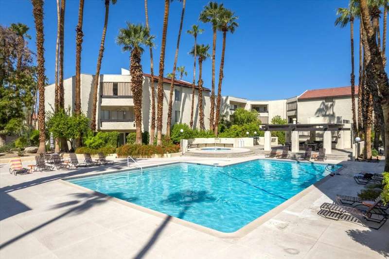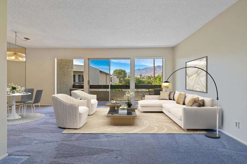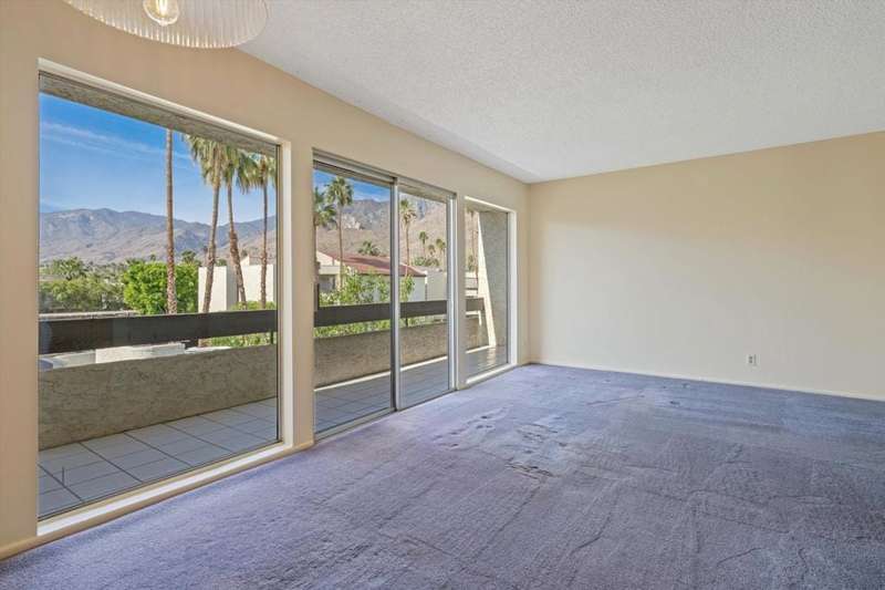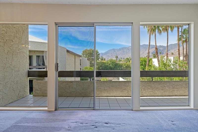 Views Views Views of Indian Canyons from your living room, bedroom and balcony in this top floor condo at the Biltmore Phase III in beautiful South Palm Springs. The carpeted living area and bedroom both have sliders to access the balcony. The large bedroom features a wall of reach-in closets with sliding mirror doors with additional closet storage in the hallway. The bathroom accessible from both the hallway and the bedroom has a bathtub/shower.Updated galley style kitchen with tile flooring with a pass thru for entertaining to the dining area. Entire condo refreshed with new paint throughout and new vertical window blinds. HVAC system was replaced. Perfect for full-time, second home or investment/vacation rental (30-day rental or longer allowed). One pet allowed. Features: one assigned carport, storage locker, community laundry rooms on each floor, building intercom access and lots of guest parking. The HOA has recently completed several major projects: resurfaced the roofs, replaced the elevators, new fire alarm system, new common area AC chillers and fans and resurfaced the spa. Starting 9/30/25 HOA fee will include Frontier high speed internet for 1-year.Relax in the inviting and refreshing pool and spa with mountain views. Enjoy entertaining and outdoor dining in the HOA cabana with misters and BBQs.Close to downtown Palm Springs, near Del Rey at the Villa Royale, Koffi, Kings Highway, The Reef Bar, Sancho's Mexican, Elmers, El Mirasol, Mr. Lyons, Kreem Ice Cream. Palm Springs living at its Best! Photos with furniture are virtually staged.