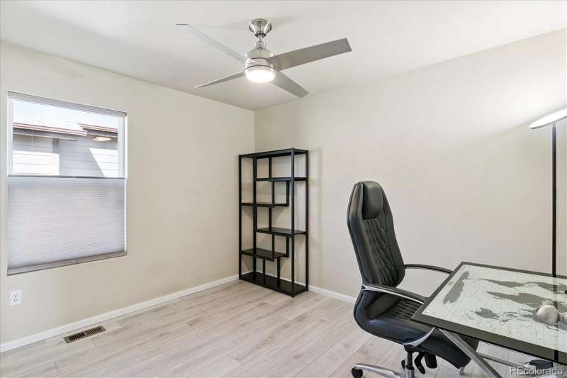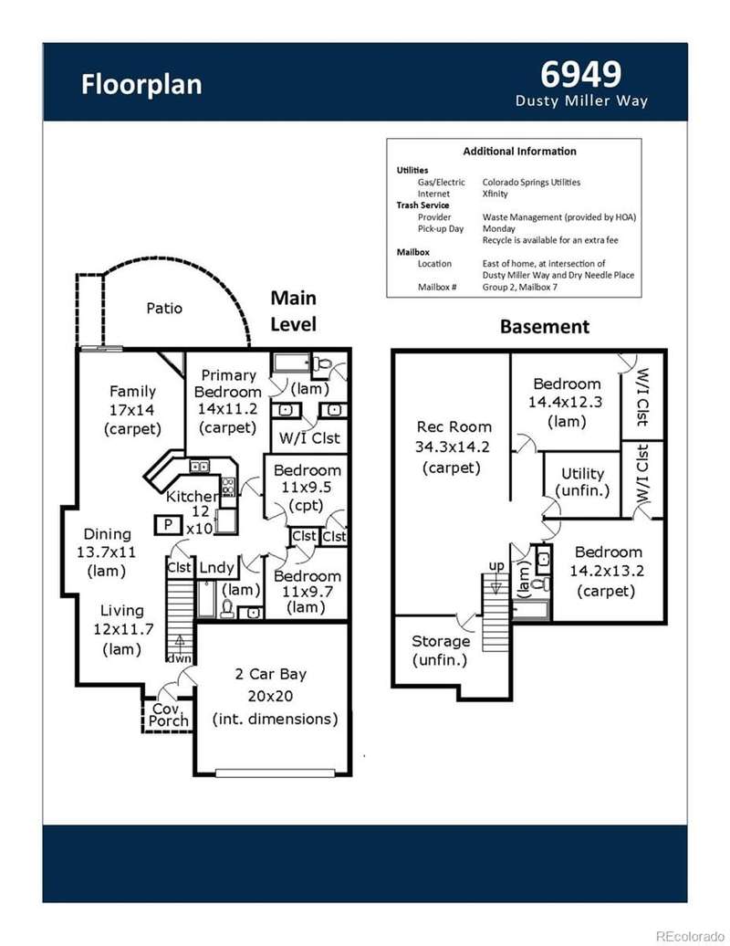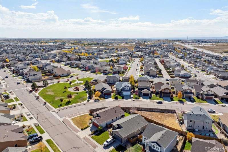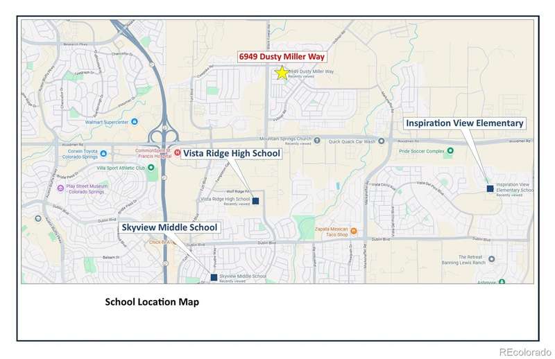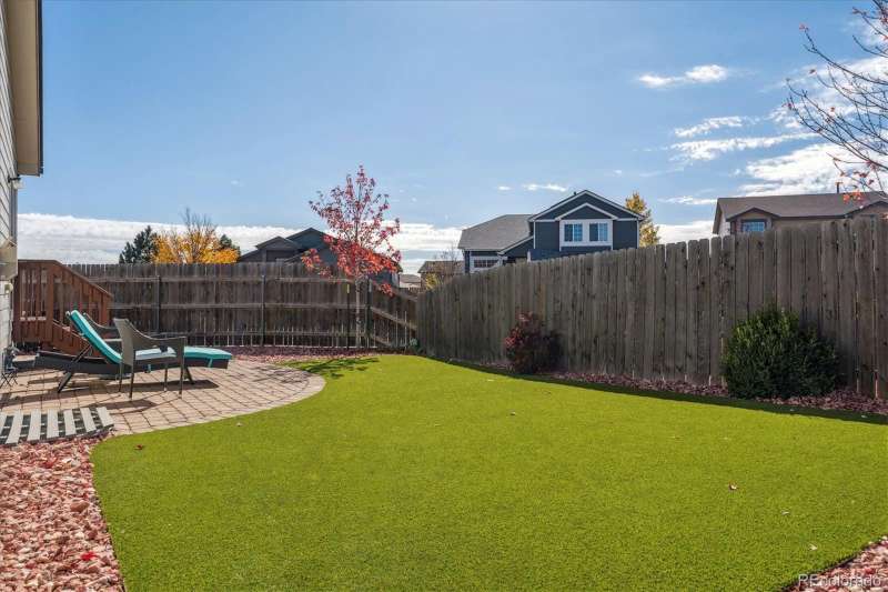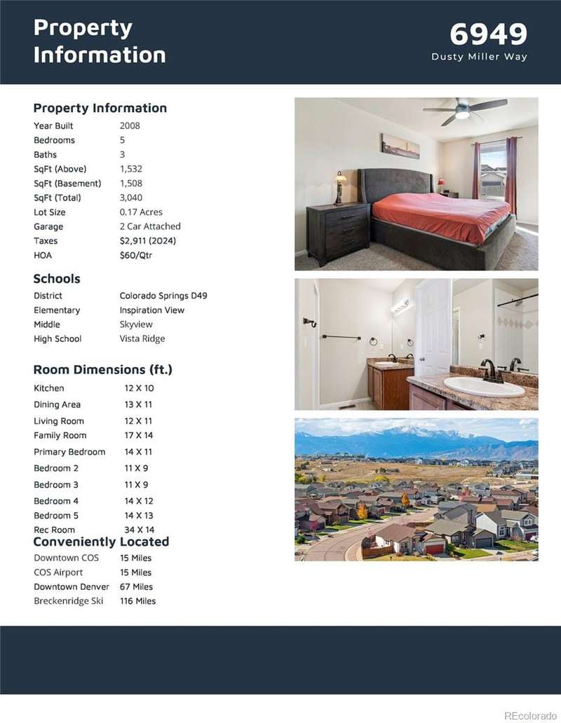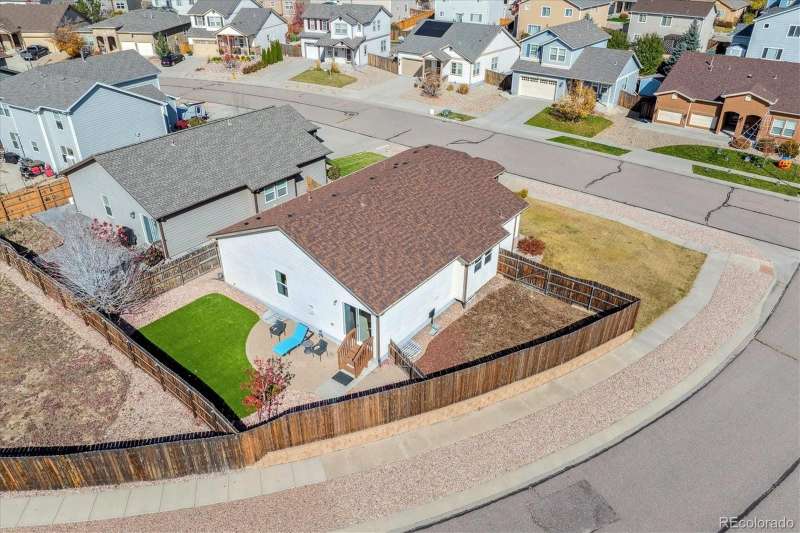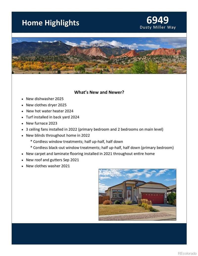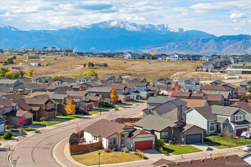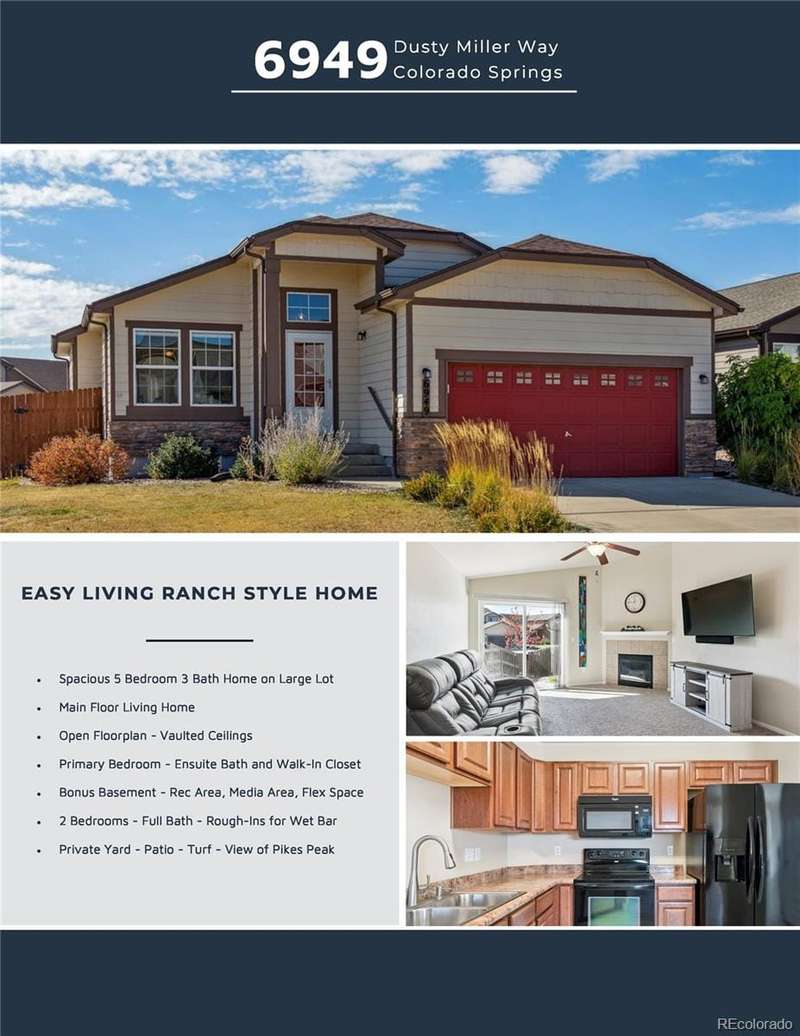 Situated on a corner lot across from a neighborhood park, this spacious 5-bedroom, 3-bathroom home offers easy main-floor living with a view of Pikes Peak. The inviting open floor plan enhanced by vaulted ceilings create an airy atmosphere throughout the main level. The thoughtfully designed kitchen layout with a pantry is perfect for everyday living. The primary suite serves as your private retreat, complete with an ensuite bathroom and walk-in closet for ultimate comfort and convenience. With all essential living spaces on one level, this home truly embodies the ease of ranch-style living. The finished basement adds versatility to this home, featuring two additional bedrooms, a full bathroom, and abundant space ideal for a recreation room or media area. The basement also includes rough-ins for a wet bar and ample storage area. A new furnace was installed in 2023 and new hot water heater in 2024. Outside, your private backyard awaits with a patio and a low-maintenance turf area, perfect for outdoor enjoyment.