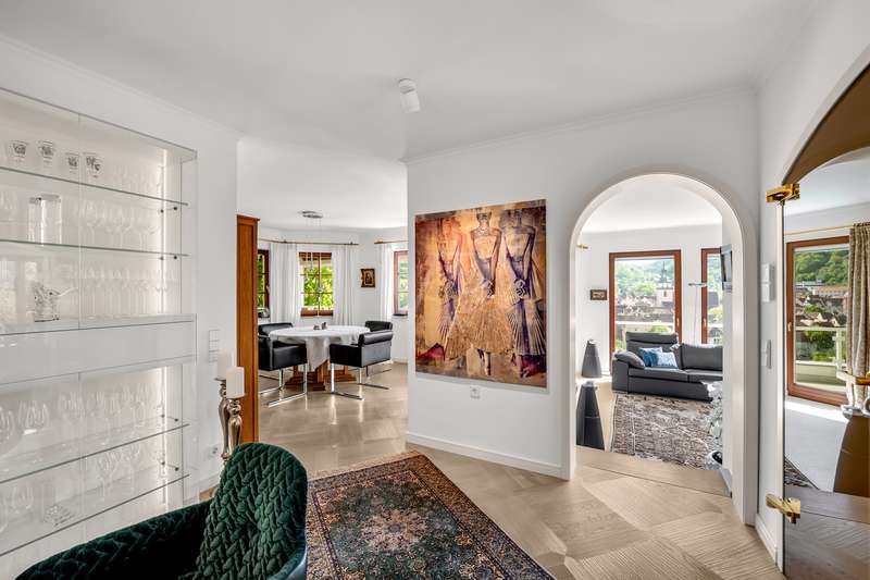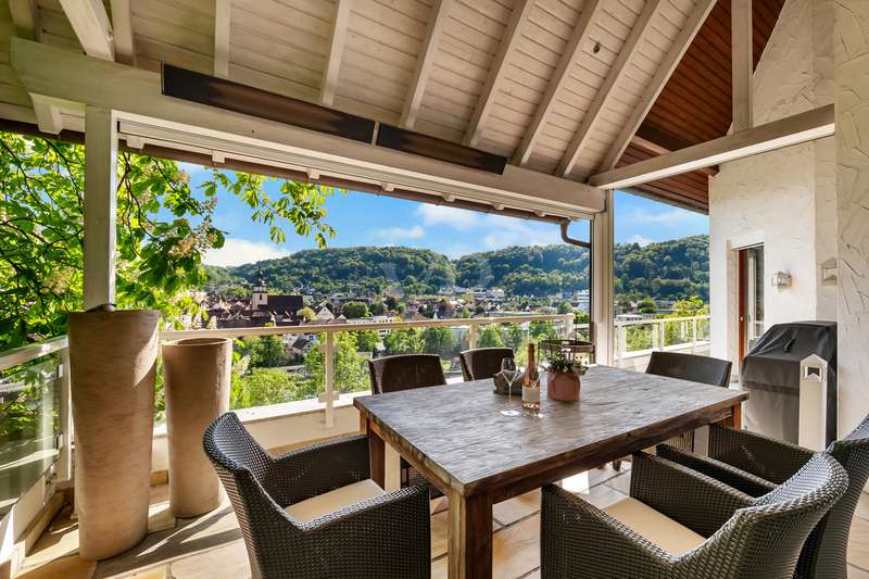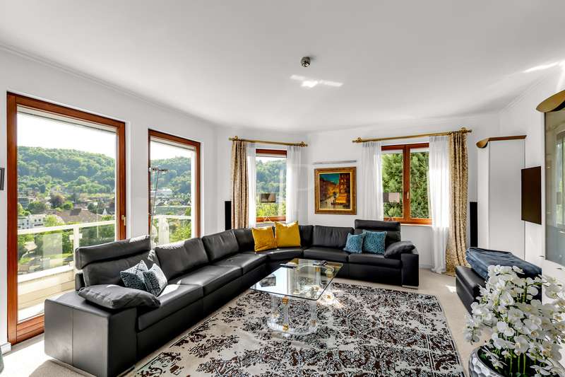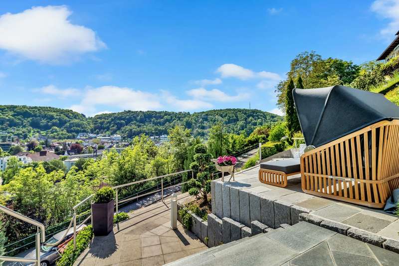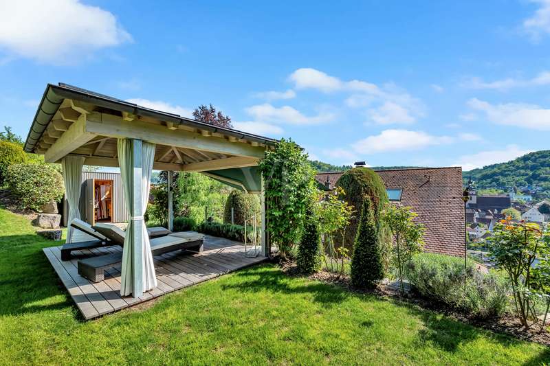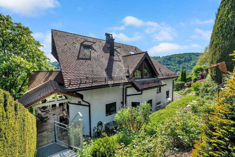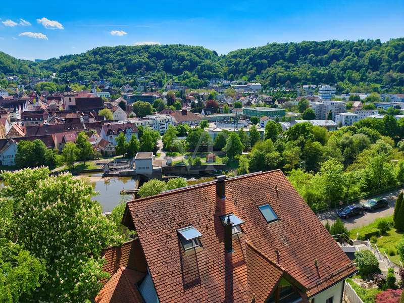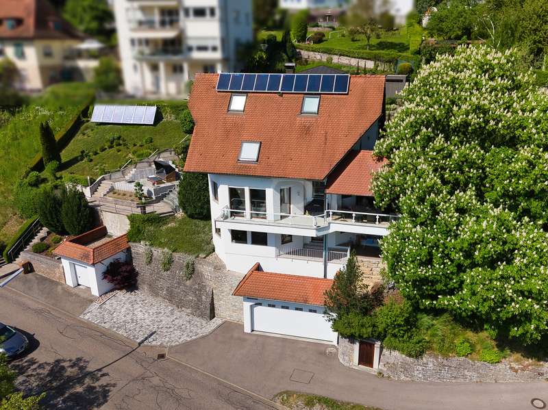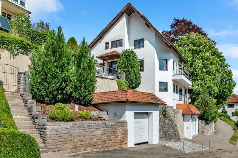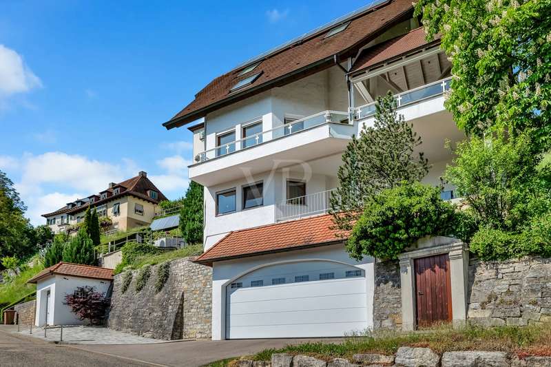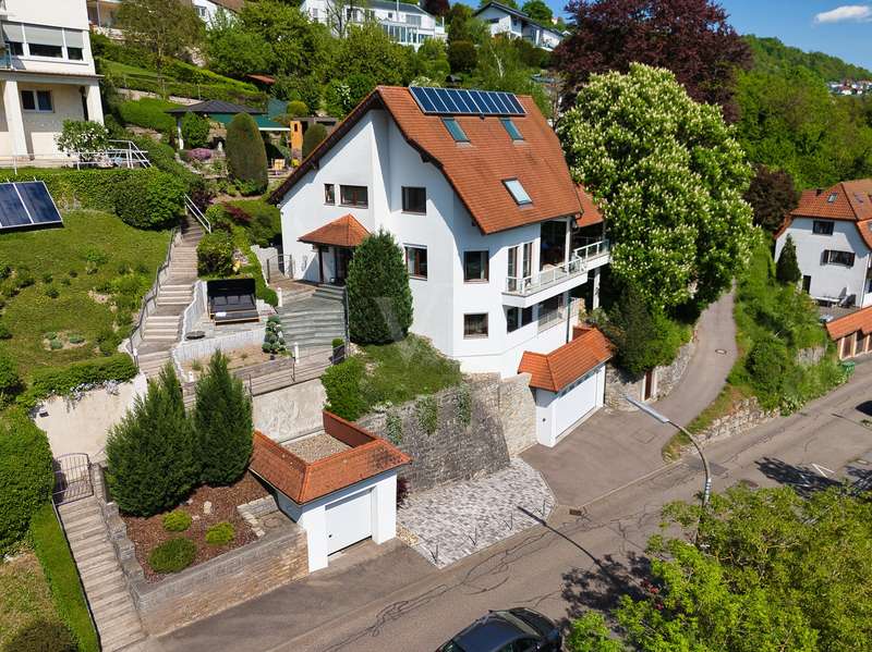 For sale is an exceptionally well-kept detached house that was built in 1990 and has been continuously modernized since then. Nestled in one of the most sought-after residential areas of Künzelsau, this property is situated on a generous plot of approx. 786 m² with an impressive living space of approx. 392 m² - an ideal home for families with high demands on space, comfort and quality. You can feel the special atmosphere as soon as you enter the house: high-quality materials, a well thought-out room layout and a light-flooded living ambience characterize the overall picture. The spacious living and dining area on the first floor forms the heart of the house - complemented by a cozy fireplace and direct access to the large, heated terrace with incomparable views over the Kocher river and the town of Künzelsau. The high-quality fitted kitchen from 2014 impresses with appliances from the premium brands Gaggenau and Miele and makes the heart of every cooking enthusiast beat faster. Separate guest WCs on all floors and elegant "Axor" fittings in all bathrooms underline the high standard of fittings. Spacious bedrooms, some with walk-in dressing rooms, await you on the upper floor. The master bathroom is equipped with underfloor heating - for maximum comfort. The top floor boasts an impressive, maisonette-style teenage bedroom - a very special retreat for the next generation. The basement offers additional utility and living space: A fully-fledged granny apartment, which can alternatively be used as an office for your business, a wellness area with KLAFS sauna, a bathroom, a further terrace as well as practical cellar rooms and the boiler and utility room complete the space on offer. Thanks to separate staircase access (stairwell), the areas remain clearly separated if desired. Nothing has been spared in the outdoor area either: the modernized gardens with garden shed, automatic irrigation system and outdoor shower are perfectly maintained and create an idyllic living environment. Surrounding balconies and terraces as well as a recently built outdoor seating area provide sunny spots at any time of day. A single garage, a double garage and an outdoor parking space are available for your vehicles. An existing elevator shaft also offers the option of a freight or "stamp elevator" - a practical investment for the future. Conclusion: This property is much more than a home - it is a well thought-out lifestyle concept for discerning buyers who value quality, comfort, location and long-term prospects. The VON POLL IMMOBILIEN team looks forward to hearing from you and welcomes you to a personal viewing on site.