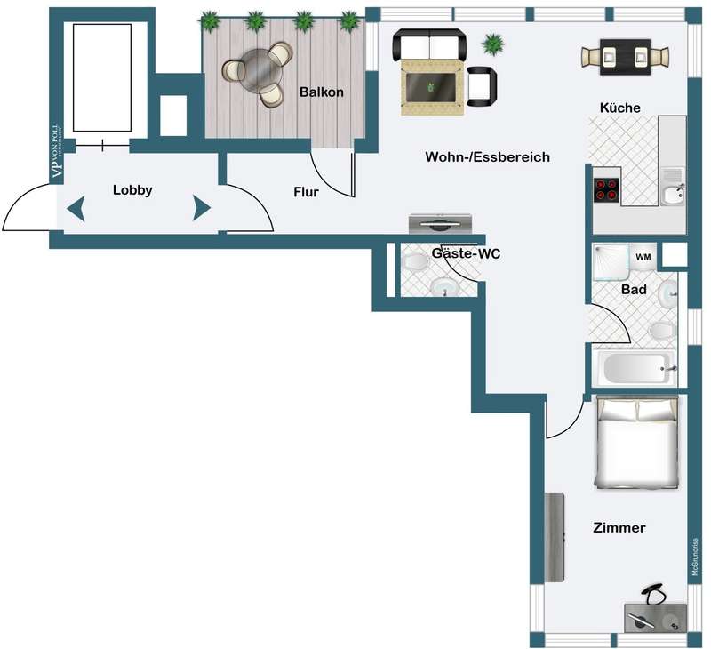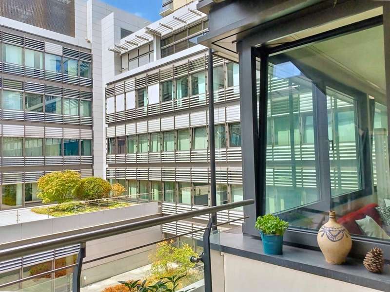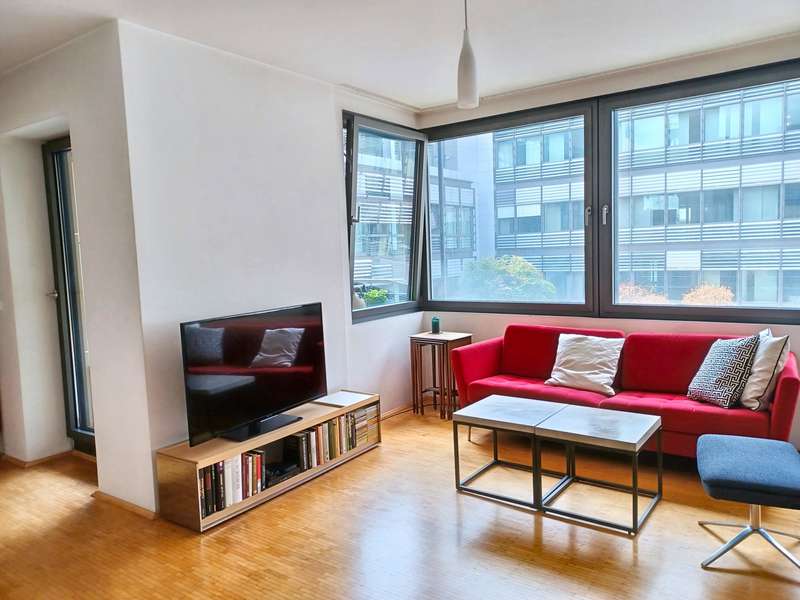 The business apartment with cosmopolitan flair is located on the 5th floor of an architecturally interesting post-modern building complex. The luxurious apartment building with elevator, underground car park, doorman and communal roof terrace is located in the heart of the city. The well-designed two-room apartment is equipped with underfloor heating, a daylight bathroom, guest WC and balcony. The open-plan living/dining area has a complete, corner window front and is very bright. The apartment is currently rented for € 1,532 per month including underground parking space and utilities.