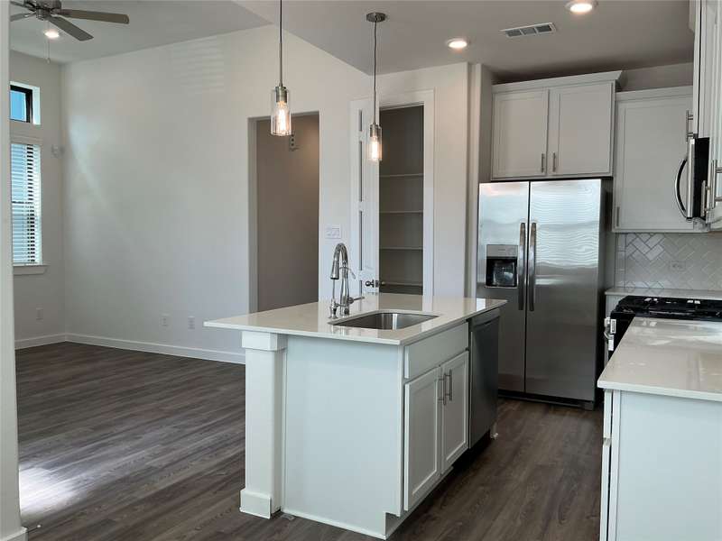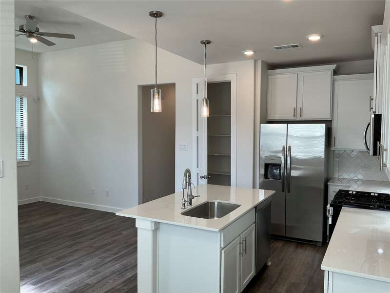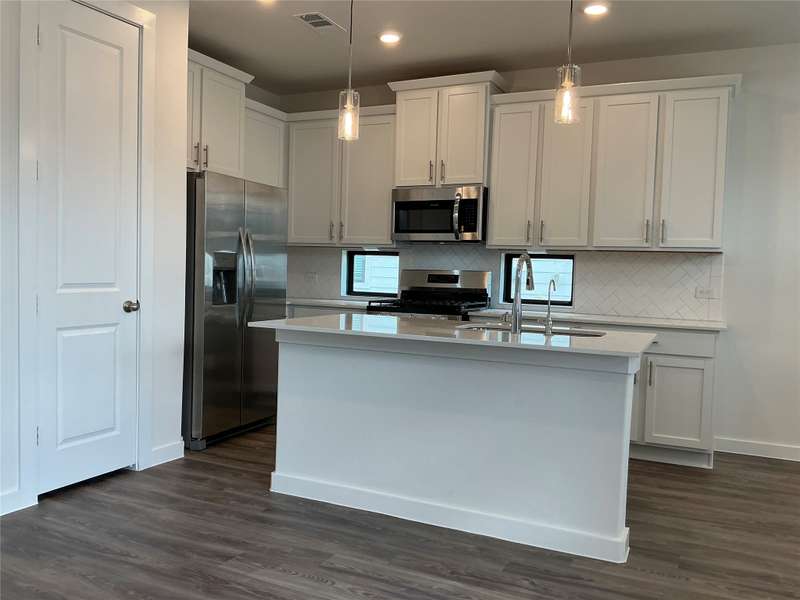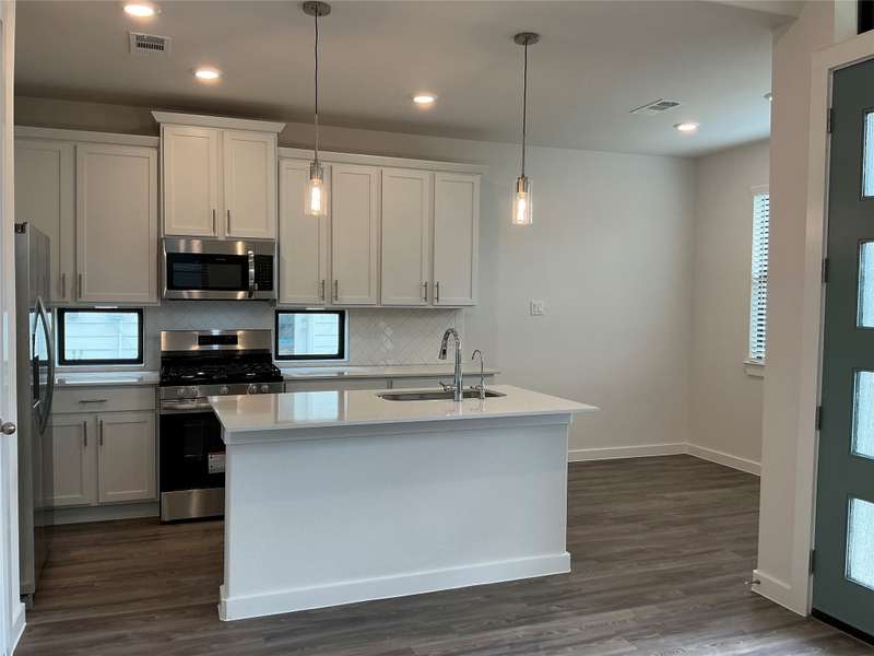 Charming cottage in the new subdivision of Indigo. Conveniently located, near Grand Parkway and Westpark Tollway. One story beauty with 2 bedrooms and 2 baths. Front living area with high ceiling which overlooks the smart style of this kitchen with quartz counters, a 'belly up to the bar' feature for additional seating, a generous pantry and stainless-steel appliances, including a refrigerator. Dining area sits just off of the kitchen area. Both bedrooms sit at the rear of the house, with primary bedroom containing a walk-in closet and an en-suite bath. Washer and dryer included with the lease for your convenience. Enjoy sitting on your covered front porch and enjoying a morning beverage while you observe the sunrise! And, as a bonus, all of your yard maintenance is covered with your lease. The Indigo Cottages include Indigo Commons, Indigo Farm and Orchard, a dog park, and multiple other parks, including a lake w/kayak launch. Come on HOME and enjoy this thriving community of Indigo!