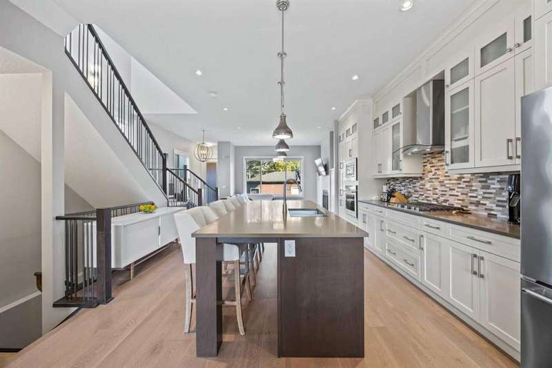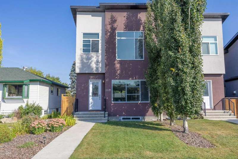 *Open House Saturday Sept 27th 2-4PM* Welcome to this luxurious 4-bedroom, 3.5-bath semi-detached home in the highly sought-after community of Banff Trail, ideally located directly across from two schools. Step inside and be greeted by soaring 10’ ceilings and rich hardwood floors that flow throughout the main level. The open-concept layout is designed for both everyday living and entertaining, featuring a spacious dining area perfect for large gatherings. The chef-inspired kitchen offers upgraded white custom cabinetry, a massive quartz island, and premium finishes that overlook the inviting living room complete with a tile-surround gas fireplace. A stylish 2-piece powder room completes the main floor. Upstairs, skylights flood the stairwell with natural light. The primary retreat boasts dramatic vaulted ceilings, a custom walk-in closet with built-ins, and a spa-like 5-piece ensuite with jetted tub and dual vanities. Two additional bedrooms also feature vaulted ceilings and custom built-in closets, alongside a 4-piece bath and full-size laundry room. The fully developed basement is designed for relaxation and entertainment, showcasing a spacious rec room with built-in speakers, a wet bar, and plenty of room for movie nights. A fourth bedroom with its own built-in closet and a 4-piece bathroom complete the lower level. Additional highlights include central air conditioning, a spacious backyard, and a double detached garage, along with custom built-ins throughout the home for premium storage and organization. Unbeatable location: directly across from St. Pius (catholic) and Capitol Hill schools, with Branton Jr. High just a 5-minute walk and Aberhart High within 15 minutes. You’re also minutes away from North Hill Shopping Centre, SAIT, restaurants, West Confederation Park, splash parks, bike trails, and LRT stations for an easy commute. This home combines luxury, functionality, and an exceptional location — a true gem in Banff Trail.
