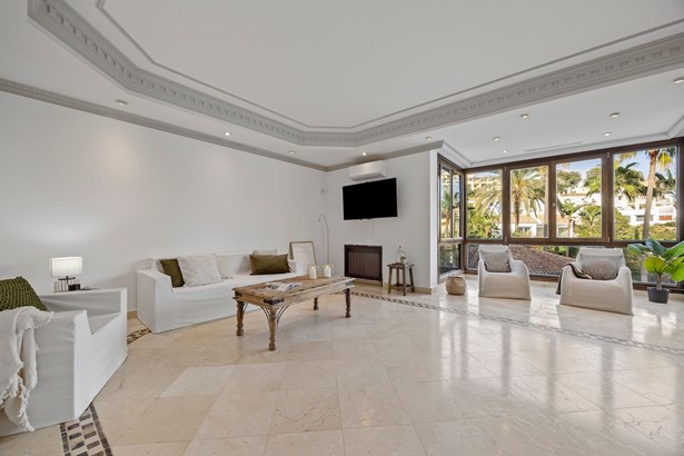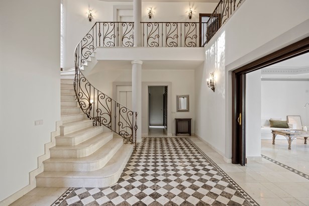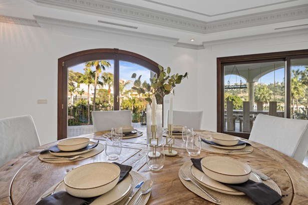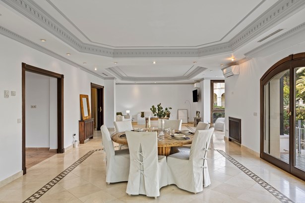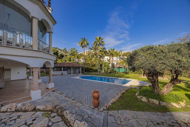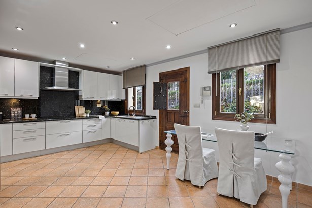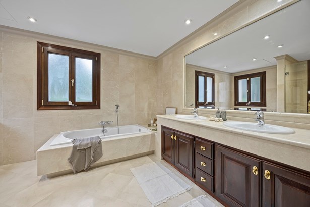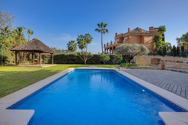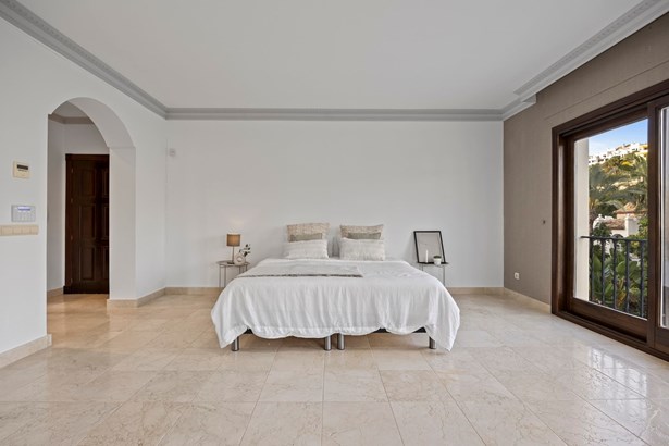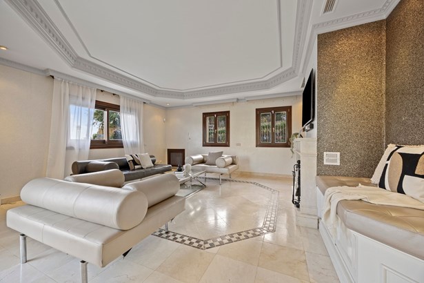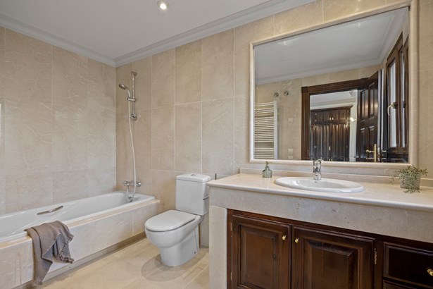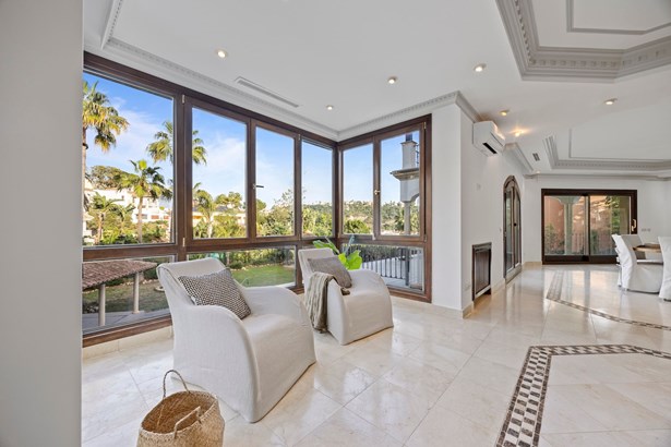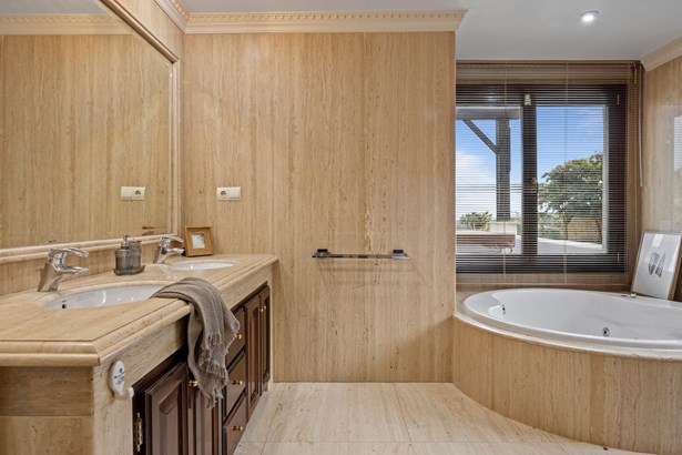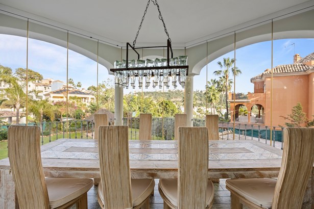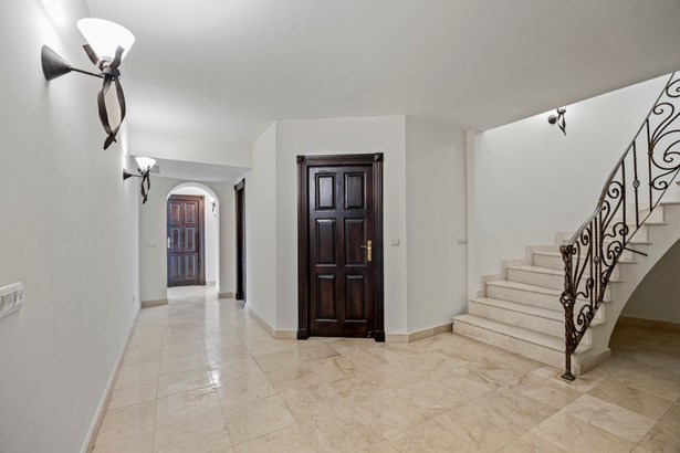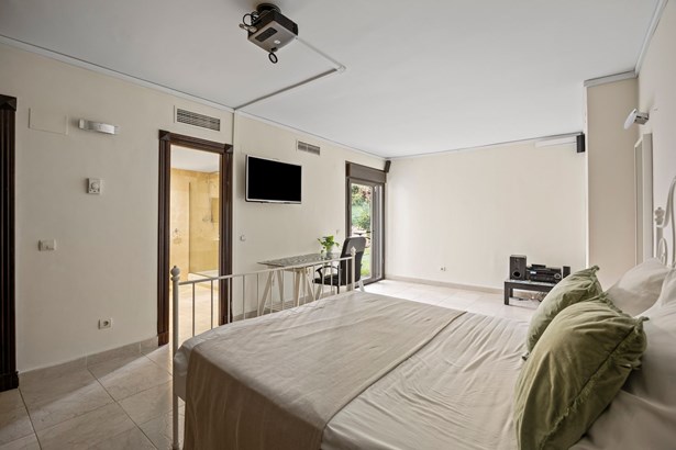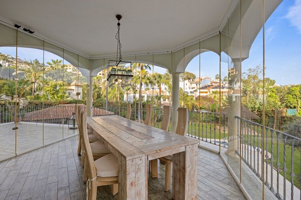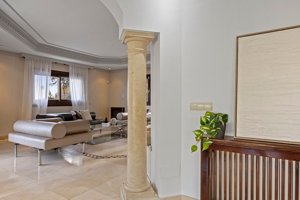 An architectural gem with character and investment potentialStep into this remarkable family villa nestled within the prestigious Los Arqueros Golf & Country Club. Boasting a unique architectural design and generous living spaces, this property offers limitless potential—whether for comfortable living or as a high-return investment.The entrance level welcomes you with a grand double-height foyer featuring soaring ceilings and a striking marble staircase. The open layout flows seamlessly into a bright living area comprising a spacious lounge, dining space, and an enclosed terrace ideal as a winter garden. A cozy corner with a fireplace adds warmth and charm. This floor also includes a fully equipped kitchen, a guest toilet, and a bedroom with an en-suite bathroom and direct access to the terrace.Upstairs, the master suite stands out with its private terrace, sunbathing area, and jacuzzi. Two additional en-suite bedrooms each enjoy their own private terraces and ample built-in ward