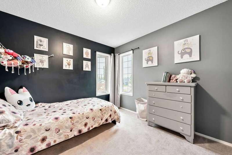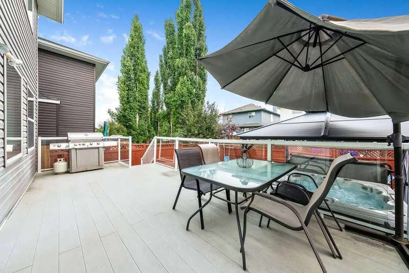 OPEN HOUSE- Sunday, November 23rd, from 1:00-3:00 pm- Perfectly positioned on a tranquil street, this home delivers a fresh blend of modern updates and timeless comfort. Fresh BRAND-NEW CARPET THROUGHOUT, sets the tone the moment you step inside, enhancing the warm natural light and thoughtful architectural details that make each room feel inviting. The bright white kitchen features stainless steel appliances and strikes the perfect balance between open flow and subtle separation thanks to its elegant archway design. The adjoining dining area easily hosts family gatherings, while the cozy living room—anchored by a gas fireplace—creates an ideal space to unwind. Step outside to a private backyard retreat designed for every season. A large composite deck, a lower deck with a hot tub (2021), and a fire pit area offer endless options for relaxation and entertaining. Mature crabapple and pear trees frame the yard with natural beauty and privacy. Upstairs, open railings and an airy landing lead to a spacious primary bedroom with a walk-in closet and private ensuite featuring both a soaking tub and separate shower. Two additional bedrooms provide versatility for children, guests, or office space, and the upper-level laundry adds everyday convenience. The lower level is drywalled and ready for your finishing touches, giving you the freedom to create additional living space tailored to your needs. A double attached garage ensures comfort during the winter months. Major updates—including new siding (2022) and new shingles (2022)—offer peace of mind for years ahead. Close to schools, shopping, parks, playgrounds, walking paths, Spruce Meadows, and even a nearby pond where kids can feed the ducks, this location is hard to beat. With quick access to Stoney Trail, commuting is simple and stress-free. This one truly checks all the boxes for family living!