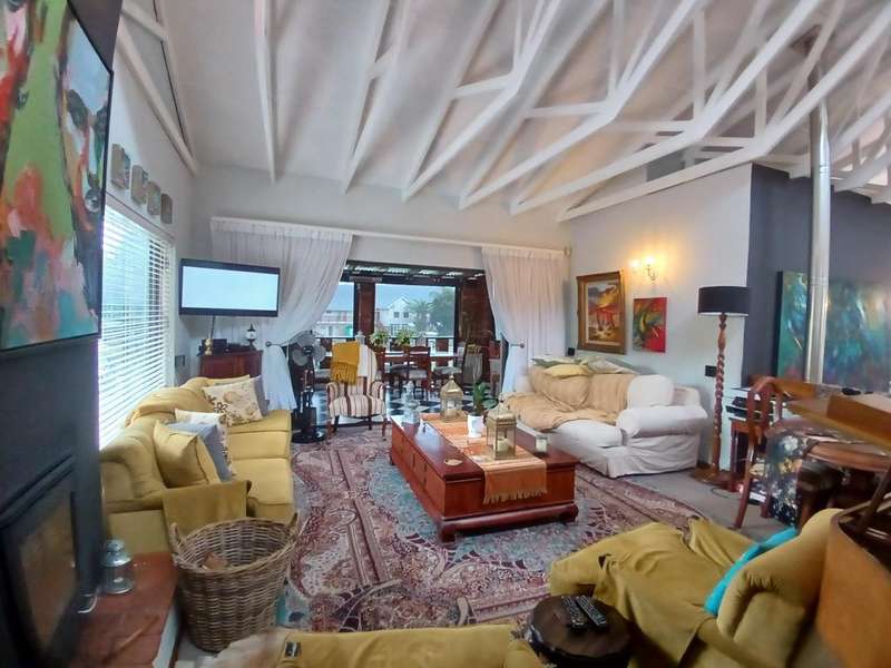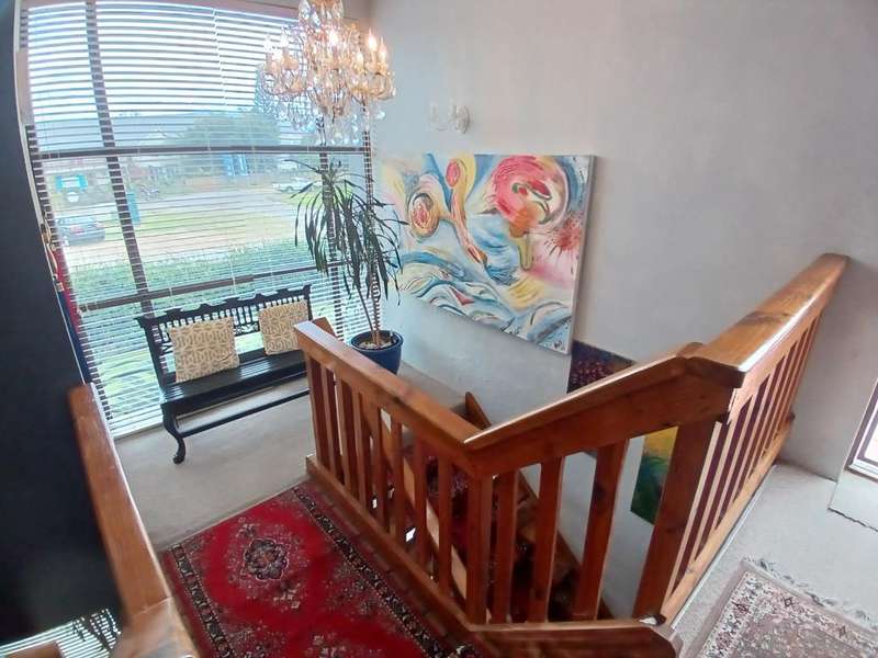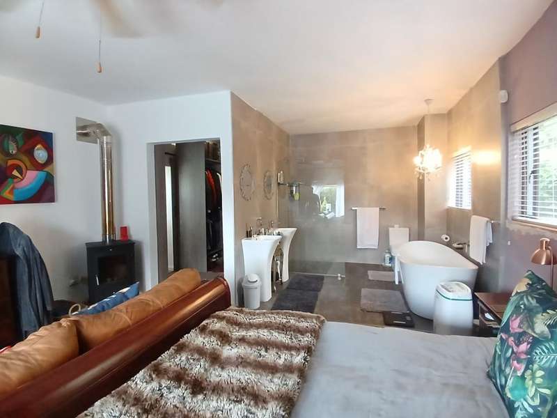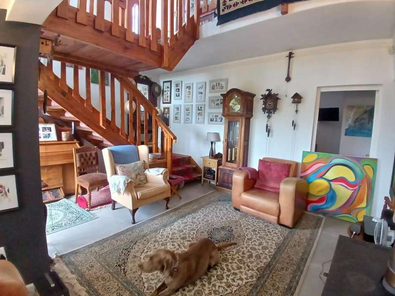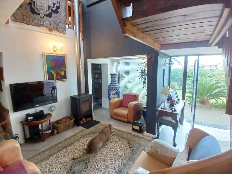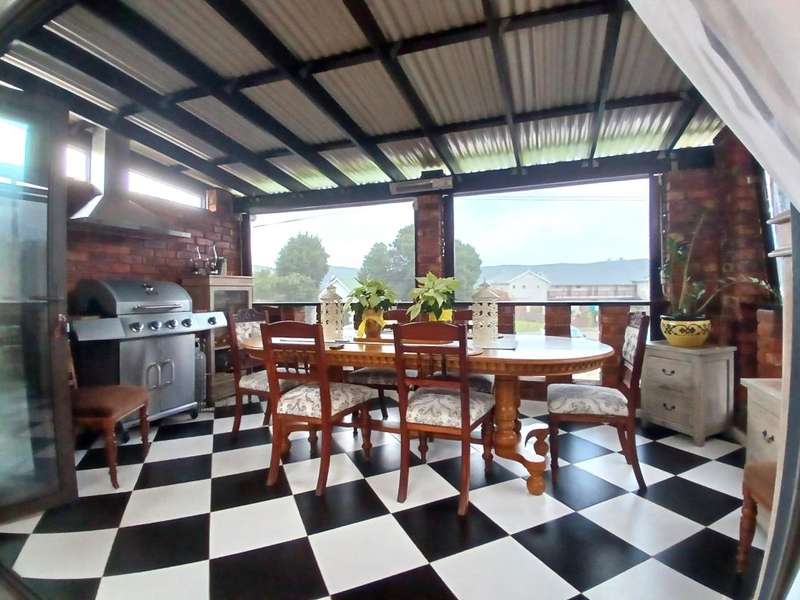 This property is a must-see with the possibility to turn this into a B&B or your permanent home. The home offers three bedrooms with en suite bathrooms downstairs. The main bedroom has a full bathroom, dressing area, and doors leading out to the splash pool. The other two bedrooms have en suite bathrooms both with showers, toilets, and basin. The cozy sitting room downstairs has a fireplace to warm those cold evenings. As you take the comfortable wooden stairs upstairs you have your large living area and guest toilet. The stoop is enclosed and offers you an additional room with a braai area. Towards the back, you have a comfortable-sized kitchen. The property is fully enclosed and pets are welcome. Double garage with shaded carport for additional parking. There is enough space on the property for your boat as well. It is a must-visit, to appreciate this unique home. Building plan approved for a fourth bedroom.