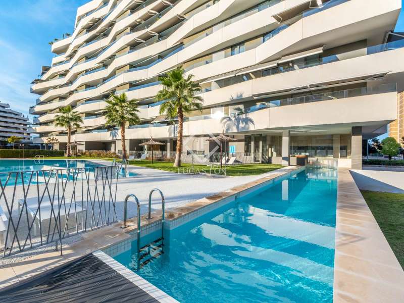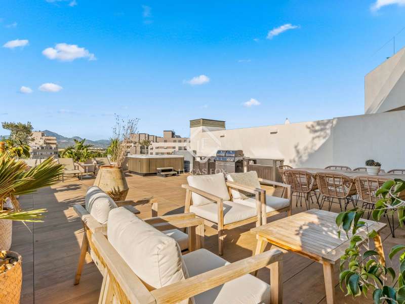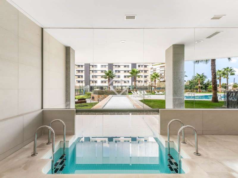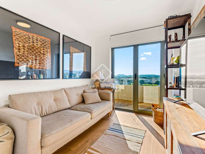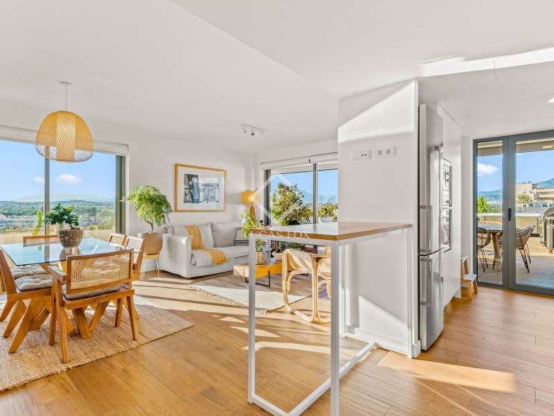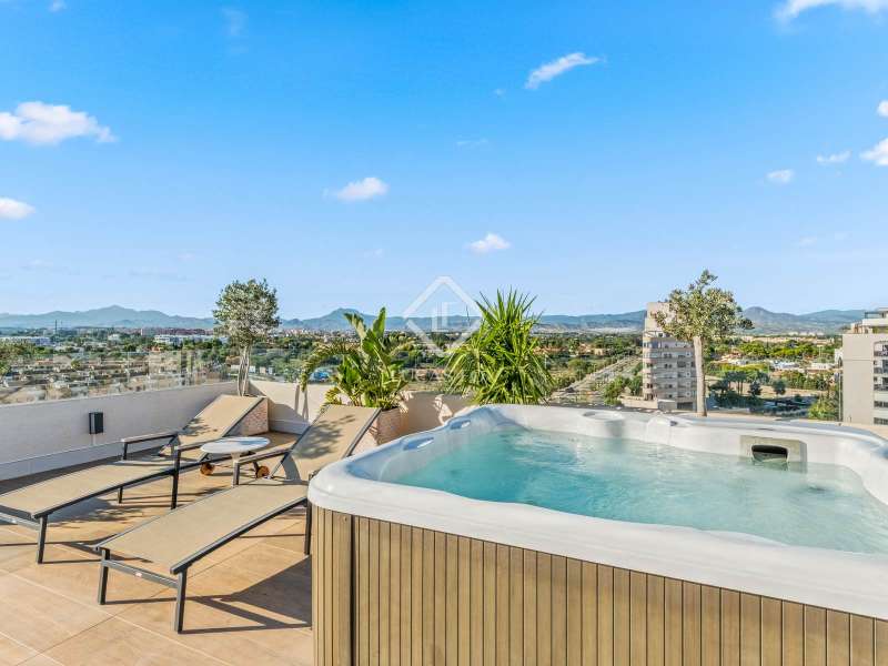 Lucas Fox presents this spectacular penthouse with a 100 m² terrace in the best development of Pau 5 in Alicante, the most in-demand area of the city just 10 minutes walk from San Juan beach. This development built in 2021 is surrounded by green areas and all kinds of amenities, such as several supermarkets, international schools, a hospital, restaurants and cafes. The location is very pleasant and offers a lot of tranquility, without giving up proximity to entertainment venues. For athletes, you will find within walking distance several sports clubs such as Alicante golf, different gyms and clubs (volleyball, sailing), as well as several cycling routes. Finally, the area is very well connected by public transport (tram, bus) and by road (N-332). As for the development, it is known for being the best in all of Playa San Juan. In addition to its beautiful design, it is designed to offer maximum comfort, with several amenities to enjoy the wonderful climate of the Costa Blanca without having to go outside. The development offers two swimming pools for adults, a children's pool, a heated swimming lane, a jacuzzi, a sauna, a gym and various sports facilities. In addition, it has a social club to organize all types of family or friends gatherings, as well as a play center and a children's play area. The layout of the property has been designed with the greatest possible privacy in mind. Upon entering the apartment on the right, there is the living room and the semi-open kitchen, the two rooms with access to the beautiful 100 m² terrace with jacuzzi and barbecue, to sunbathe and enjoy beautiful views of the mountains and to Alicante golf. To the left of the entrance is the night area with three bedrooms, including the main bedroom with a private bathroom. The two secondary bedrooms share another additional bathroom . In addition, it has access to another 10 m2 terrace with views of the golf, with a perfect orientation to enjoy magnificent sunsets. For greater comfort, the apartment has hot/cold air conditioning with heat pump, an exterior thermal insulation system, imitation wood porcelain stoneware floors, modern designer furniture and wardrobes in each room. The kitchen comes fully equipped with high-end appliances , such as an induction hob, stainless steel extractor hood, built-in column oven and microwave, as well as a stainless steel sink and compact quartz countertop. A refrigerator, dishwasher and washing machine are also available. Both the development and the class A energy-rated property have been designed to minimize energy consumption, with the possibility of reducing it by up to 62%. The objective is to improve your quality of life, with a property that respects your health and the environment, while obtaining significant savings on electricity and water bills. If you want to live in the best development of Pau 5, in one of the most exclusive apartments with a terrace and views, contact us for more information and to arrange a visit.