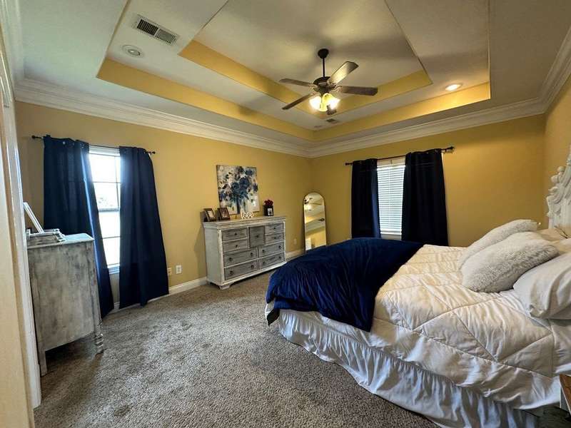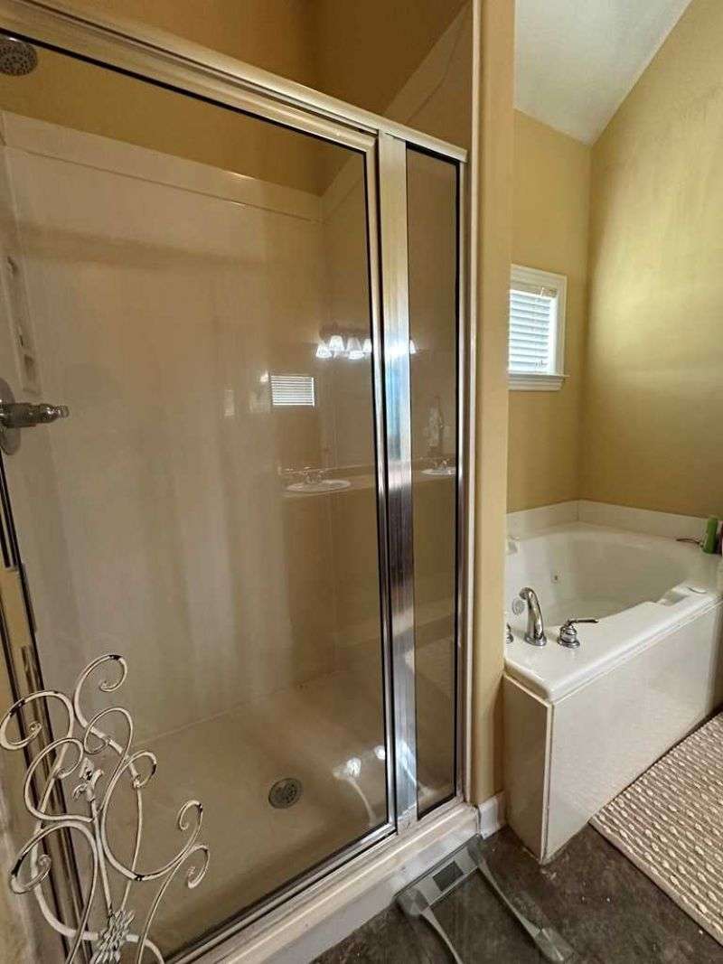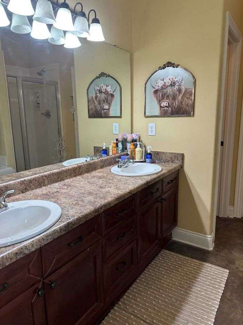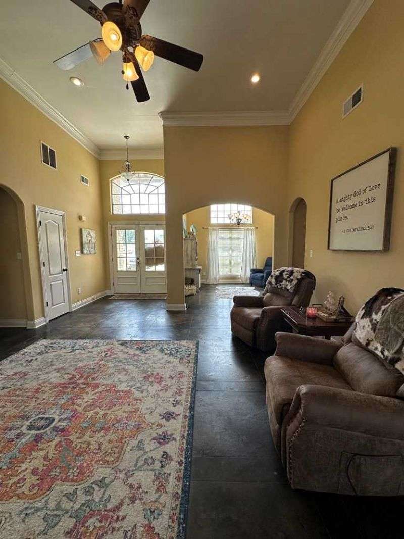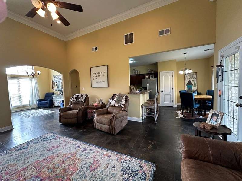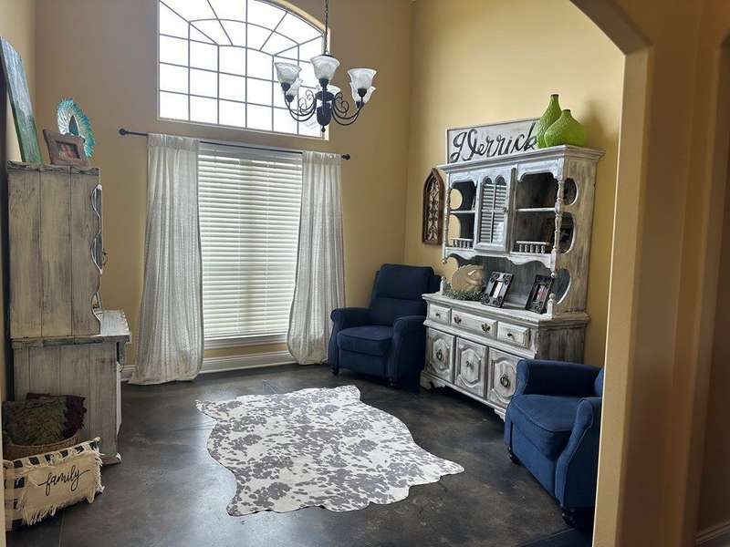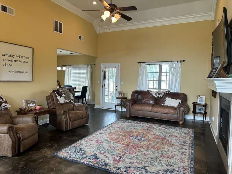 This home boasts a stunning layout highlighting grand entrance double doors that lead into a spacious area with 14-foot ceilings, seamlessly connecting the living and dining spaces while keeping them visually distinct. The well-appointed kitchen features an eat-in area and a bar, ideal for casual dining. Stained concrete floors add a modern touch, complemented by ample natural light throughout. The split floor plan includes two bedrooms shared by a Jack and Jill bath, while the primary suite offers luxury with a separate shower, jetted tub, double sinks, a water closet, and a walk-in closet. A convenient half bath is located in the hallway for guests. Upstairs, a large bedroom suite with an attached bath serves perfectly as a guest room or home office. Outdoors, enjoy a screened porch and the expansive 2.78-acre corner lot, complete with a double drive and double carport. This home truly features an impressive floor plan designed for comfort , elegance and entertaining. New A/C Newer roof