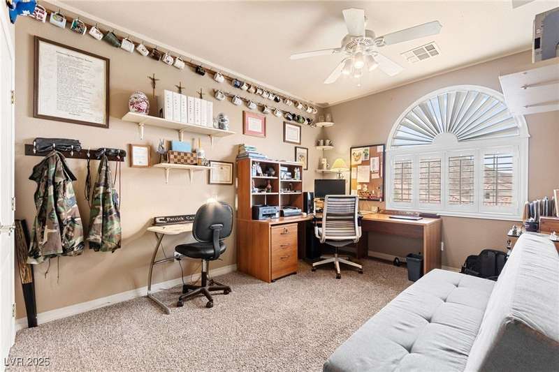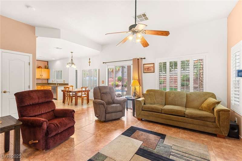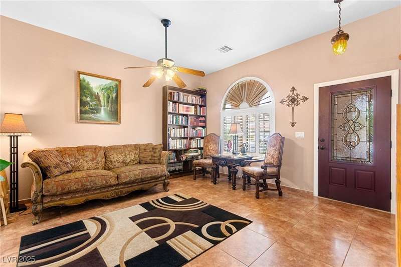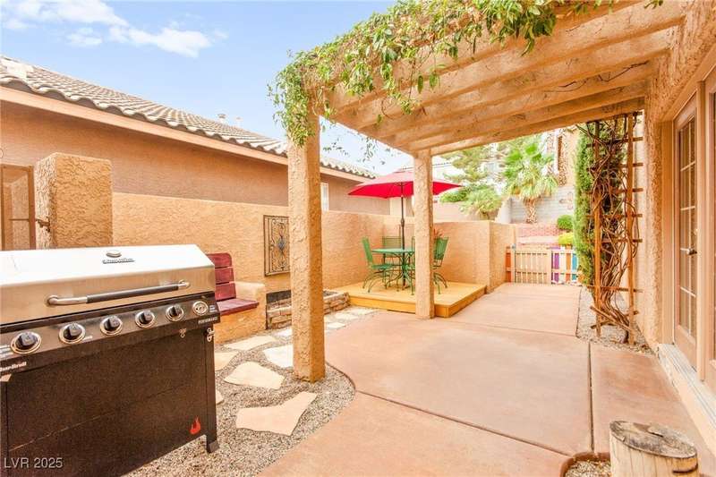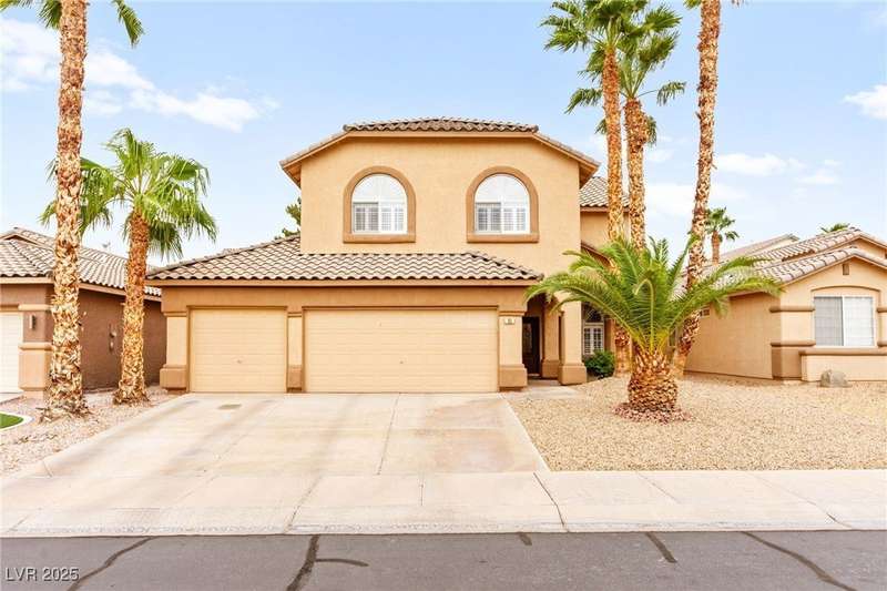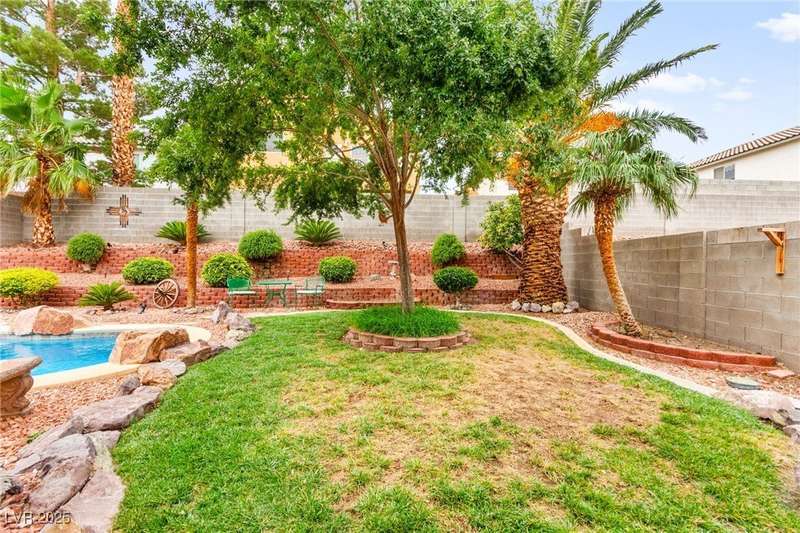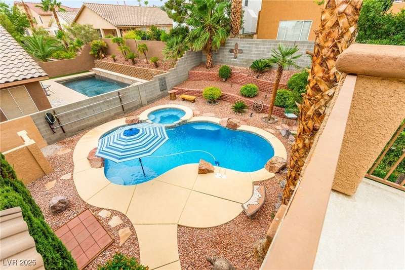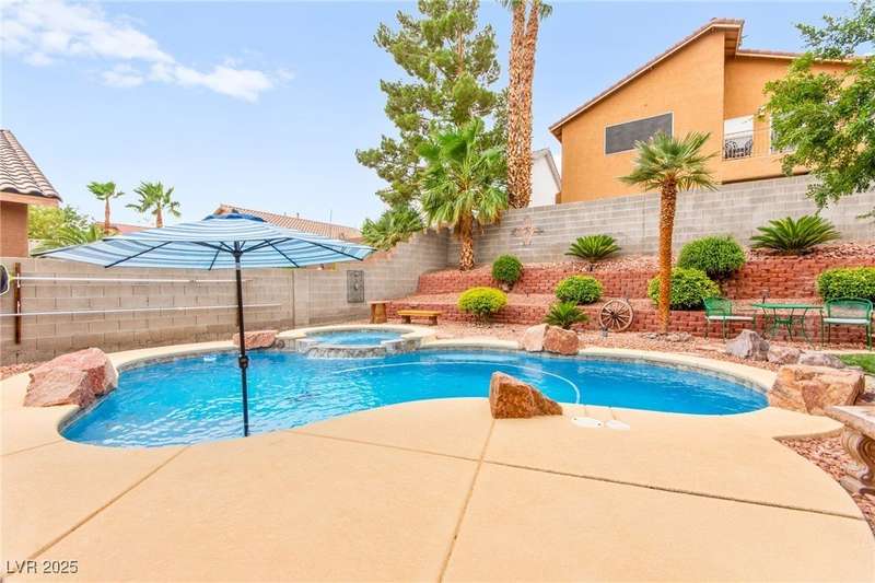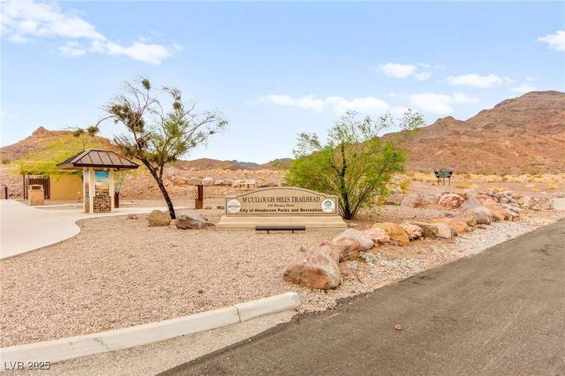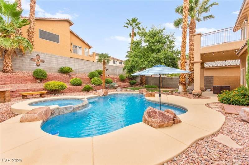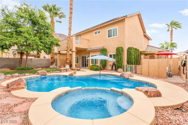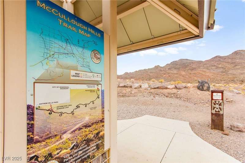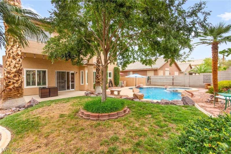 Located in the desirable guard-gated community of Palm Hills with its own park and just steps from the popular McCullough Hills Trailhead, this 4-bedroom, 2.5-bathroom home blends comfort, efficiency, and lifestyle. Inside, soaring 10-foot ceilings and vaulted details upstairs create an open, airy feel. The floor plan features separate living and family rooms, a dining room, and a kitchen with a breakfast nook—perfect for both everyday living and entertaining. The spacious primary suite includes vaulted ceilings and a private balcony with automated dropped down shade, offering a relaxing retreat. Additional highlights include a workshop area in the garage, newer windows (within 5 years), an HVAC system replaced in the last 7 years, and solar panels for energy efficiency. Step outside to a beautifully landscaped backyard with a sparkling pool and spa, surrounded by stonework and mature shrubs, creating a private oasis for year-round enjoyment.