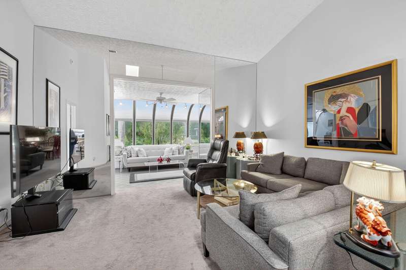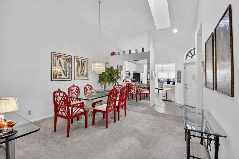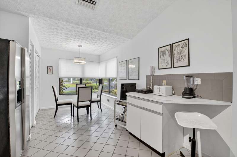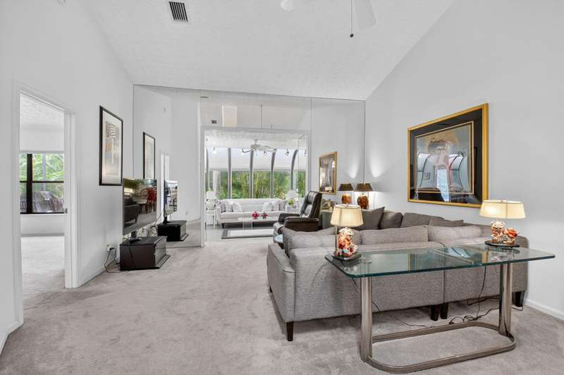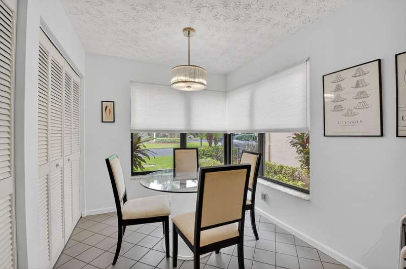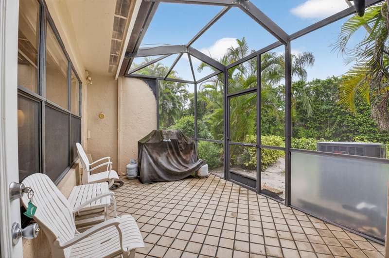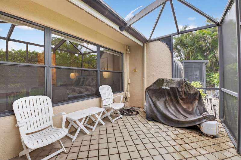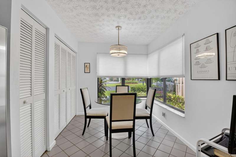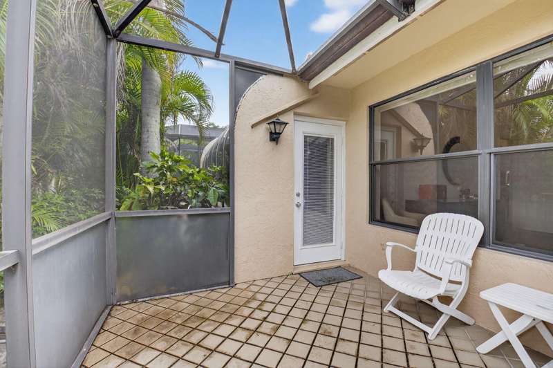Spacious and inviting 2 bedroom, 2 bath villa with 1-car garage located in the highly sought-after Meridiana at Boca Pointe. This home offers vaulted ceilings with a skylight that fills the main living areas with natural light, creating an open and airy feel. Living and dining room provide plenty of space for entertaining or relaxing. The eat-in kitchen is ideal for casual meals and morning coffee. Versatile enclosed sunroom features pocket doors, closets, and a window, making it perfect as a 3rd bedroom, private office, or den. Additional highlights include a screened patio, garden views, A/C replaced in 2018 and water heater in 2016. Furniture can remain for added convenience, making this villa move-in ready. Meridiana has a subdivision pool and small clubhouse for residents to enjoy.