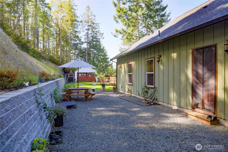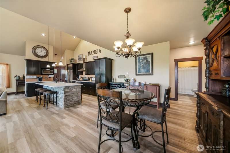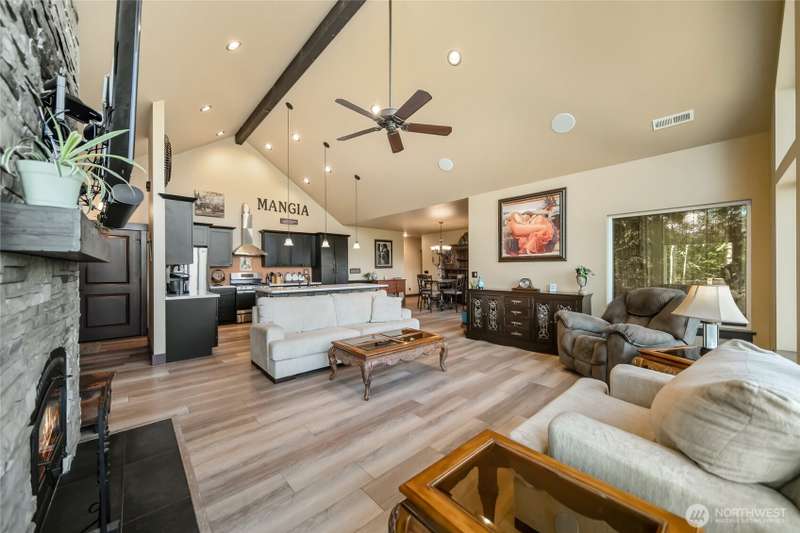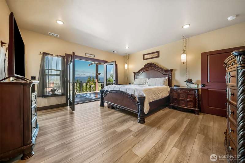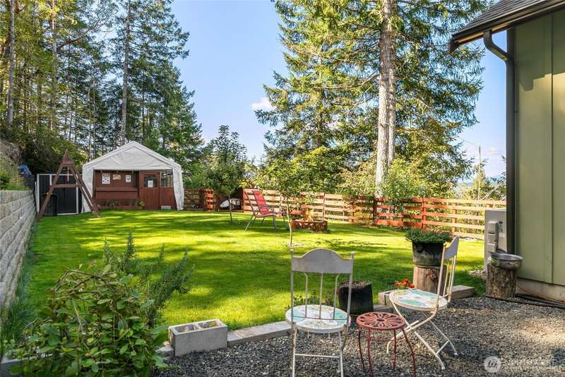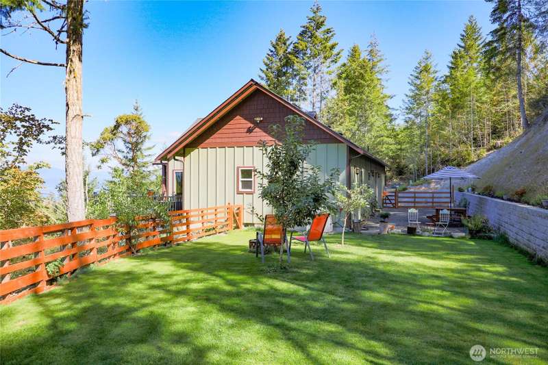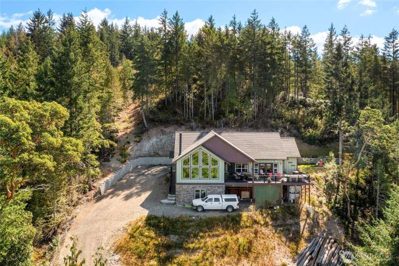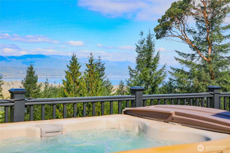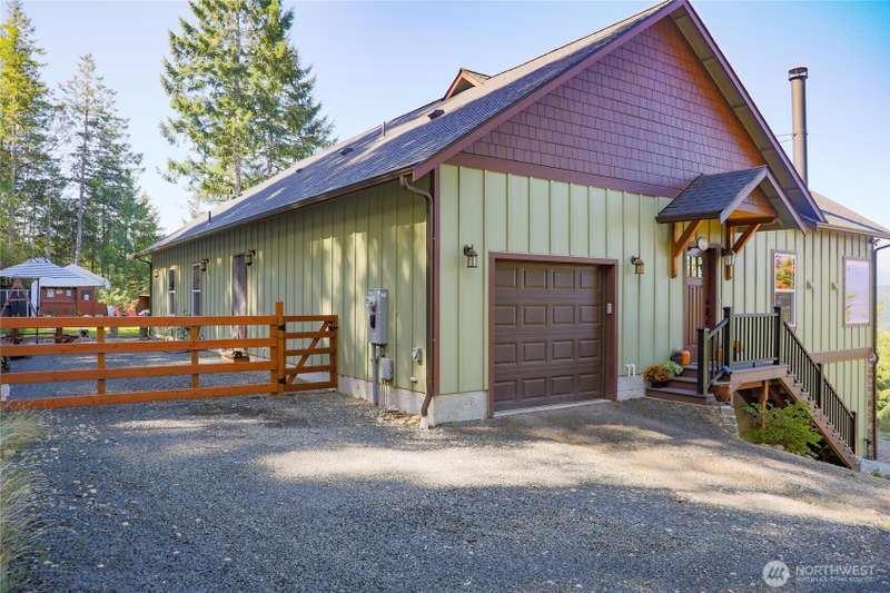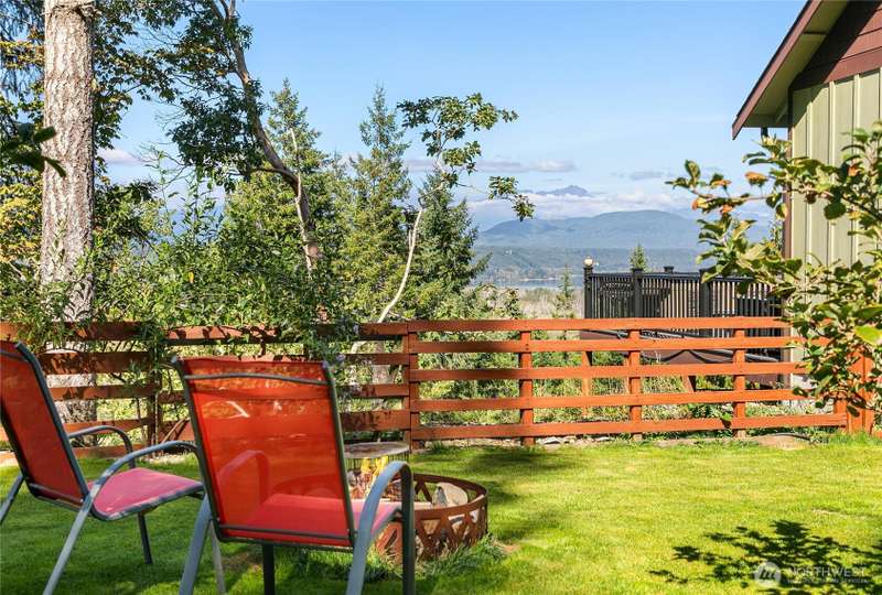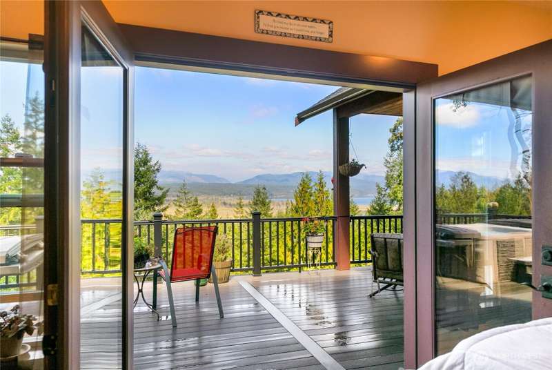 Enjoy an amazing 180-degree view of the mountains & canal from this 1-acre hillside estate. This warm villa features tall windows that illuminate the great room, with a cozy wood-burning fireplace. Kitchen boasts beautiful quartz countertops, farm sink & high-end appliances. Dining area features French doors leading to an expansive, partially covered deck & hot tub. Primary suite opens to the deck & includes a lrg shower & walk-in closet. Laundry/mud is equipped with a dog bath. Half bath & custom cabinets & insulated floor in the lower-level entrance basement. Level fenced backyard features fruit trees, greenhouse & hobby farmer's shelter & chicken coop. The ever-changing views are a year-round delight in this 3-yr-old custom-built home.