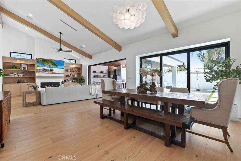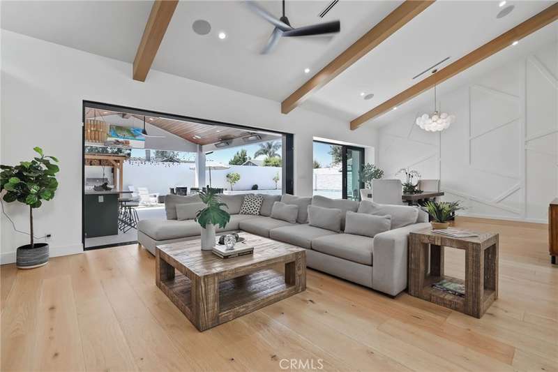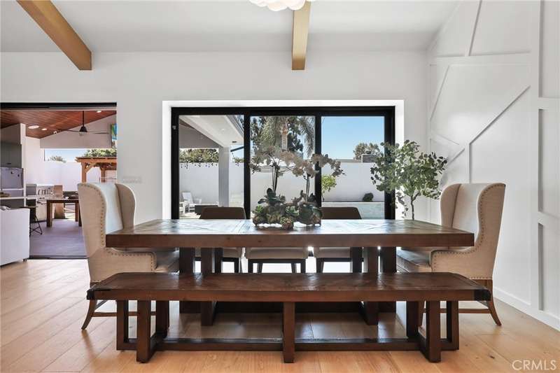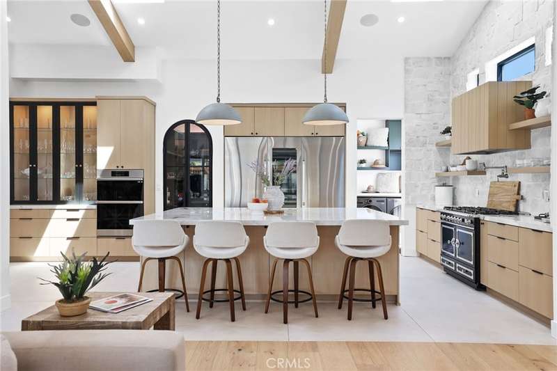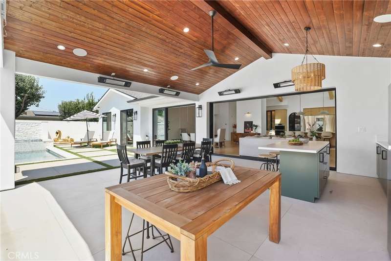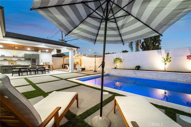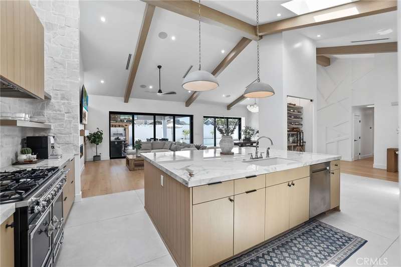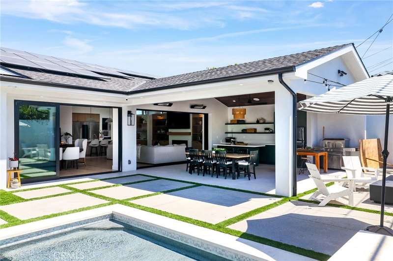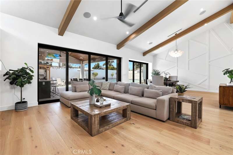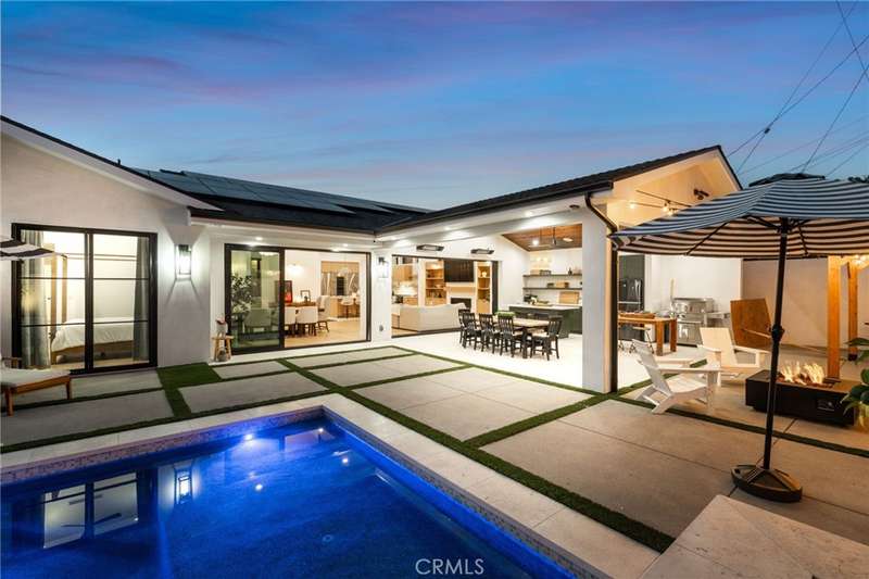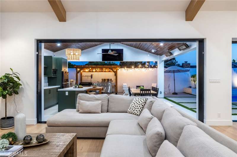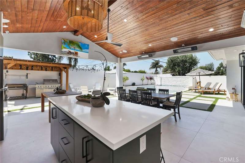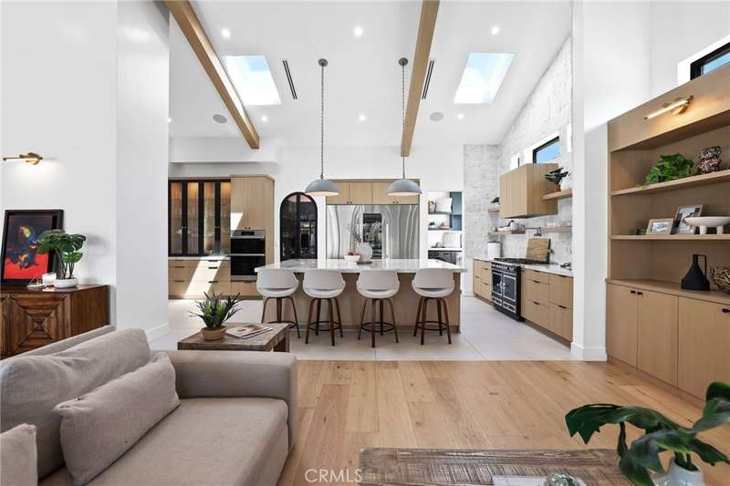 Sophistication Meets Relaxation in this expanded & professionally remodeled 2024 Rossmoor Estate. Set on a large lot with sparkling pool/spa in an A+ tract location, this 4-bed, 5-bath plus office offers 2,965 sq ft of refined interiors, 479 sq ft of seamless indoor-outdoor living (total 3,444) and an oversized 2-car garage. Excellent curb appeal welcomes you with a solid oak wood entry and garage door. Step into a high-ceiling foyer with skylights, iron-glass doors to a private office or formal dining room, direct garage access, and a 3/4 guest bath. At the heart, a show stopping gourmet kitchen features custom oak cabinetry, 6-burner range, double ovens, porcelain island, Mediterranean backsplash, Dacor appliances, La Cornue French range, and walk-in pantry. The kitchen flows to a daily dining area and living room with high faux-beam ceiling, oak built-ins with LED lighting, and fireplace. Dual 16-ft sliders open to the landscaped yard with covered patio, outdoor kitchen, BBQ, pizza oven, bar, and fruit trees. The primary suite offers a walk-in closet, dual-sink vanity, plus three additional bedrooms--two with en-suites and pool views. Throughout: engineered European white oak floors, custom-stained Hemlock ceilings, skylights, and solar tubes. Upgrades include owned solar, two new AC/heating units, updated electrical, new windows/doors, and built-in surround speakers integrated with phone controls. In the award-winning Los Alamitos School District, this 2024 remodel blends modern luxury, smart tech, and timeless craftsmanship.