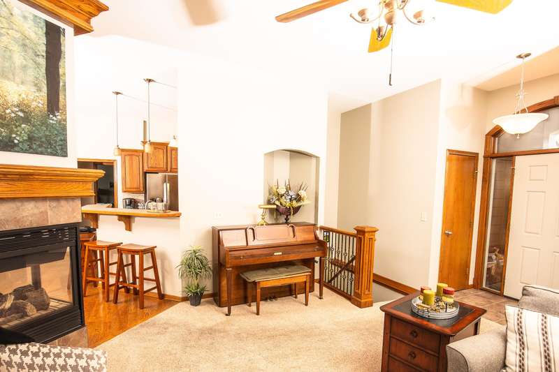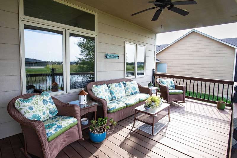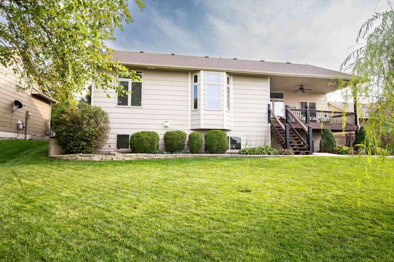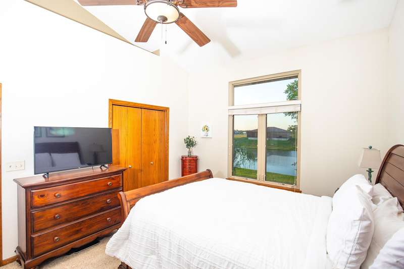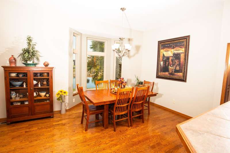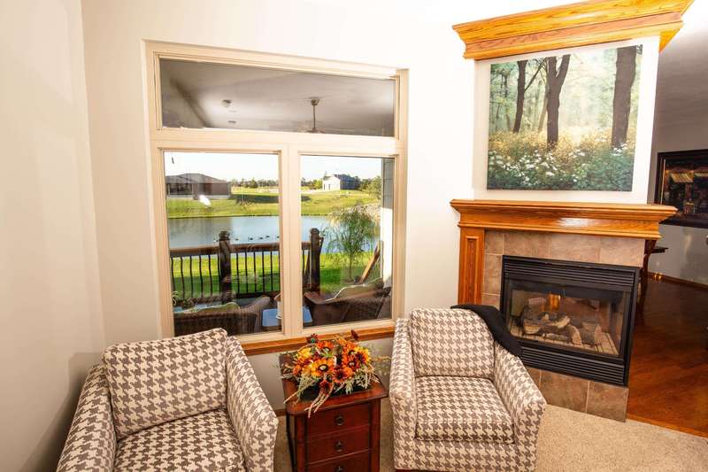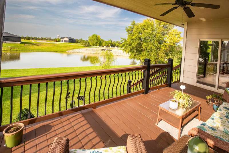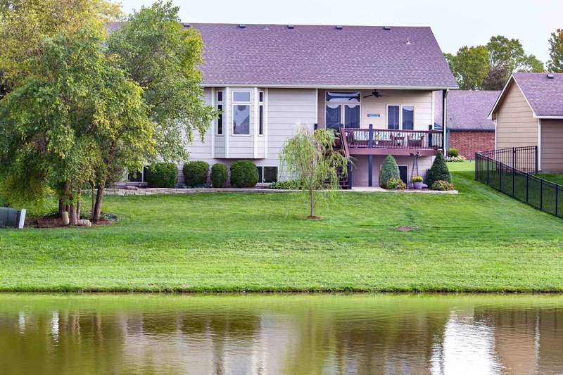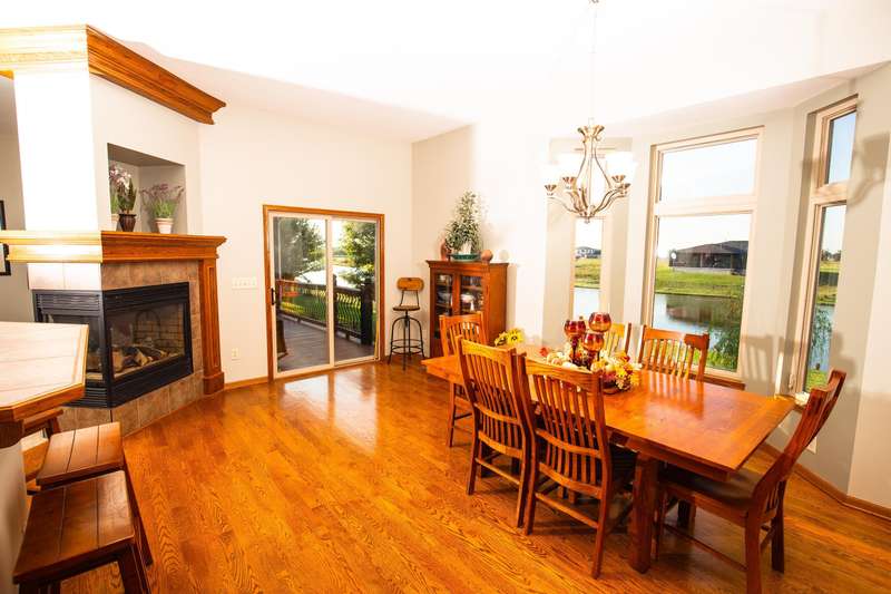 Nestled in the highly sought after Bel Aire neighborhood of Sawmill creek addition. This beautifully appointed residence offers 4 bedrooms and 3 full bathrooms across 2771 square feet of living space on a 9,148 lake lot. The main level impresses with an open concept living room showcasing a two way fireplace, gleaming hardwood floors and vaulted ceilings, seamlessly flowing into the kitchen and dining area. The kitchen features stainless steel appliances and a convenient eating bar, all enhanced by panoramic views of the tranquil lake. Retreat to the luxurious master suite, complete with vaulted ceilings, his and her vanities, a shower, walk in closet and a corner tub. Two additional bedrooms, another full bath, and a main floor laundry room complete this level. The finished walk out basement elevates entertainment with a spacious rec/game room anchored by a stack-stone fireplace and a wet bar with a stone island. Perfect for gathering. An additional bedroom and full bath make this level as practical as it is inviting. Positioned directly on a spring-fed lake, the home offers breathtaking sunset views glistening off the water, natural prairie landscape that is beyond ideal for relaxation and outdoor gatherings. Elevated outdoor living with a covered deck and patio.