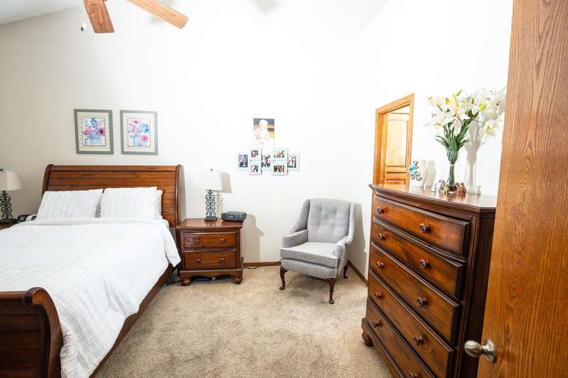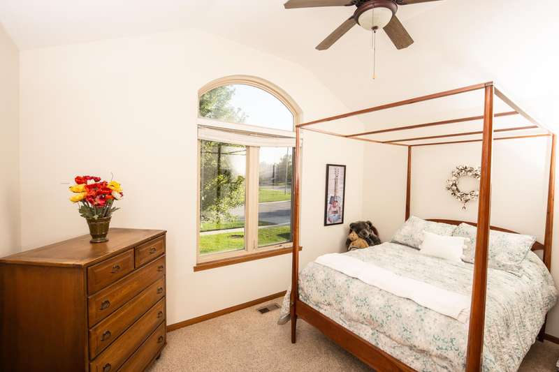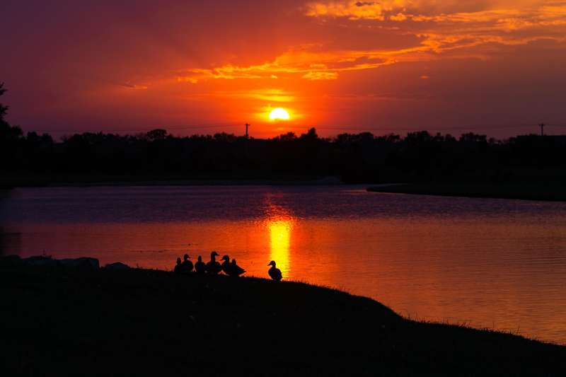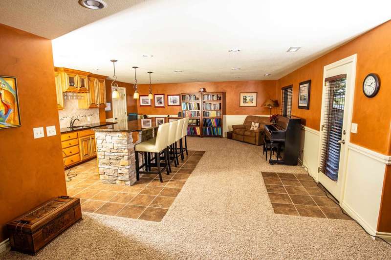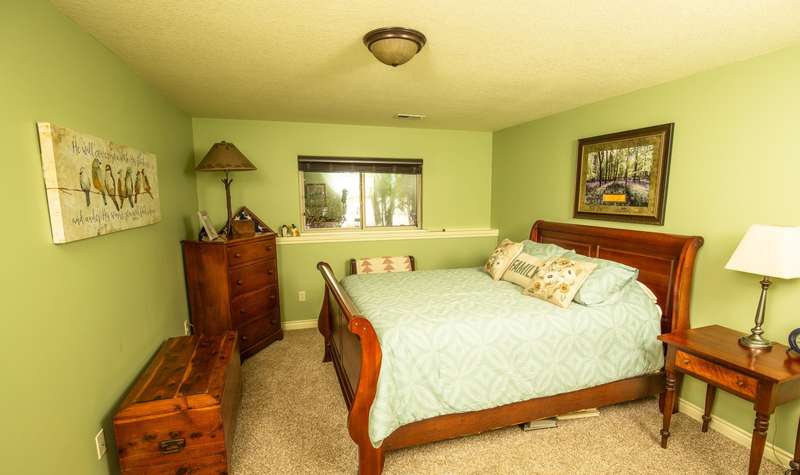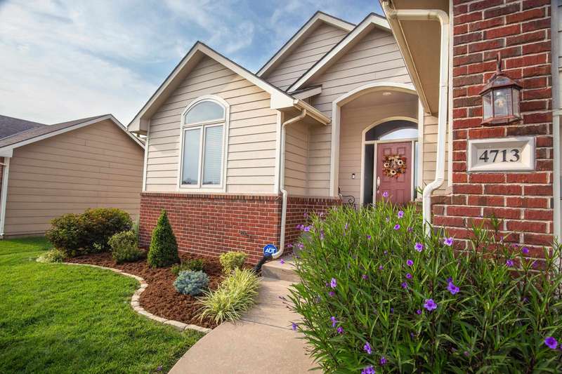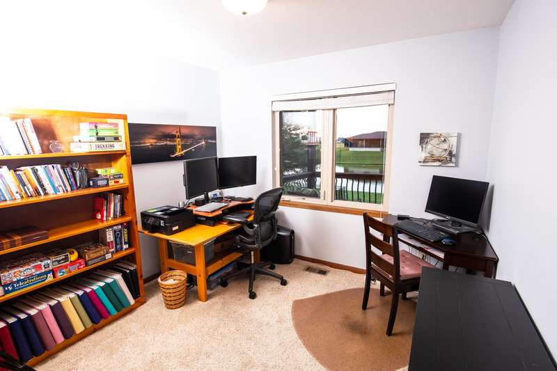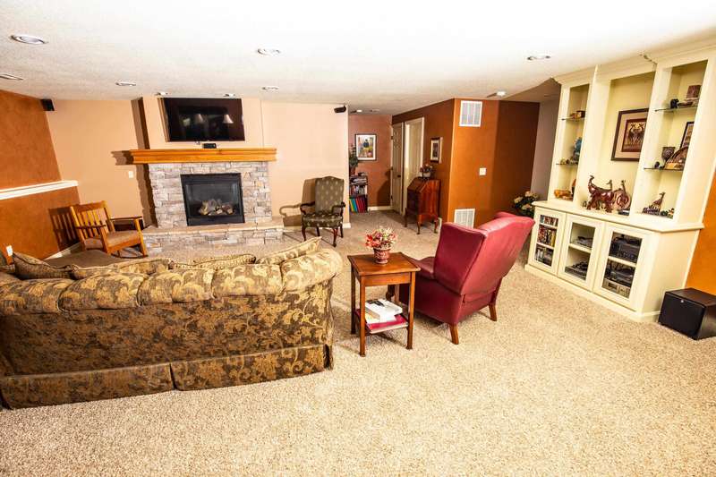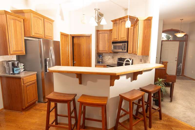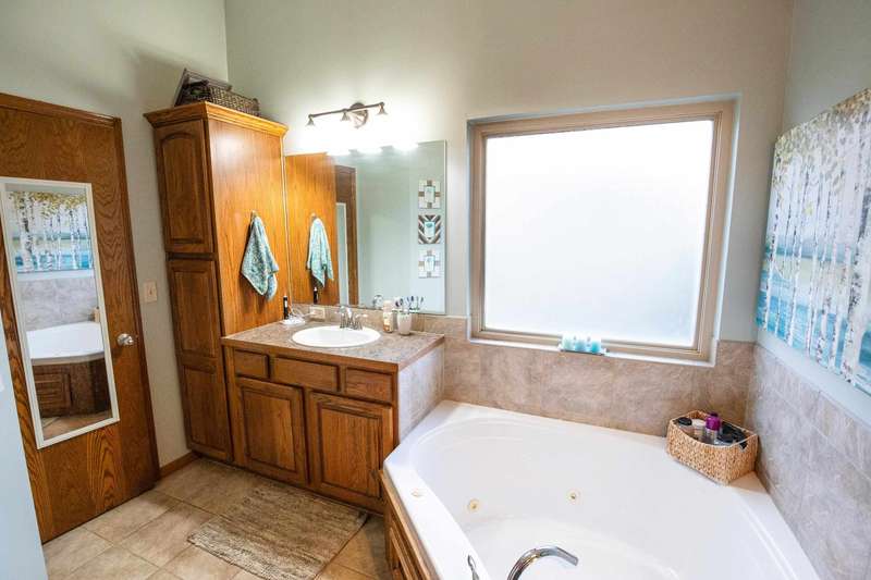 Nestled in the highly sought after Bel Aire neighborhood of Sawmill creek addition. This beautifully appointed residence offers 4 bedrooms and 3 full bathrooms across 2771 square feet of living space on a 9,148 lake lot. The main level impresses with an open concept living room showcasing a two way fireplace, gleaming hardwood floors and vaulted ceilings, seamlessly flowing into the kitchen and dining area. The kitchen features stainless steel appliances and a convenient eating bar, all enhanced by panoramic views of the tranquil lake. Retreat to the luxurious master suite, complete with vaulted ceilings, his and her vanities, a shower, walk in closet and a corner tub. Two additional bedrooms, another full bath, and a main floor laundry room complete this level. The finished walk out basement elevates entertainment with a spacious rec/game room anchored by a stack-stone fireplace and a wet bar with a stone island. Perfect for gathering. An additional bedroom and full bath make this level as practical as it is inviting. Positioned directly on a spring-fed lake, the home offers breathtaking sunset views glistening off the water, natural prairie landscape that is beyond ideal for relaxation and outdoor gatherings. Elevated outdoor living with a covered deck and patio.