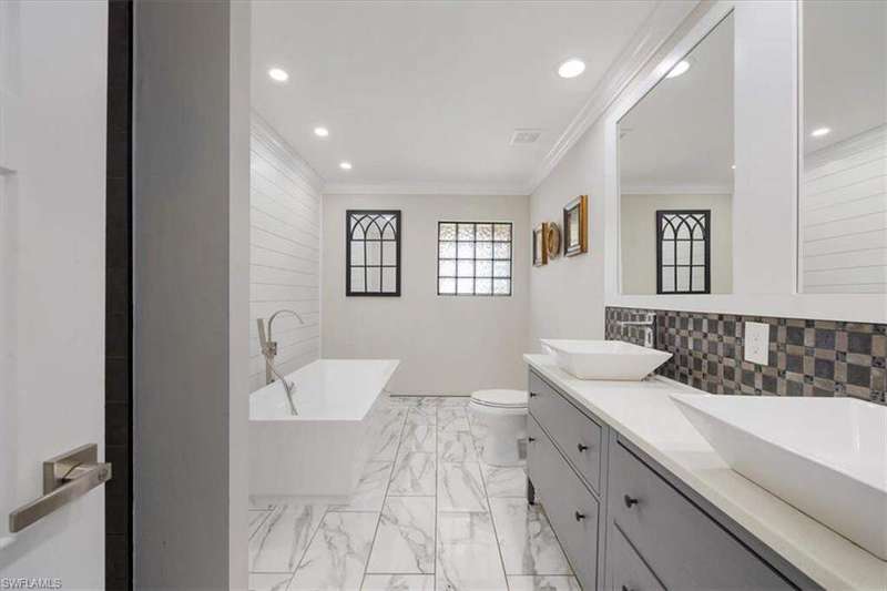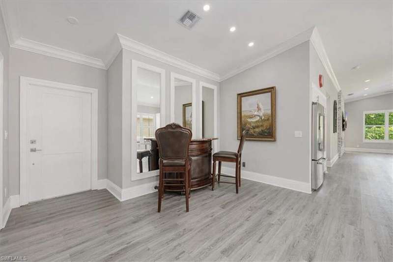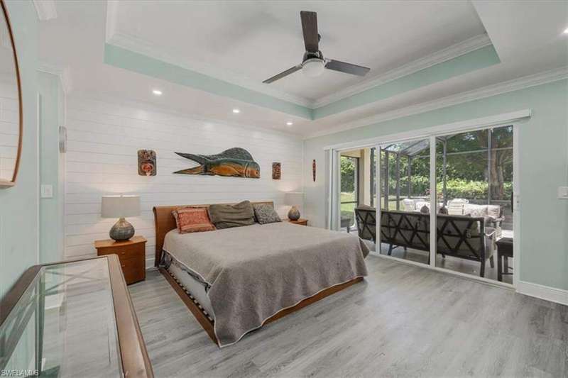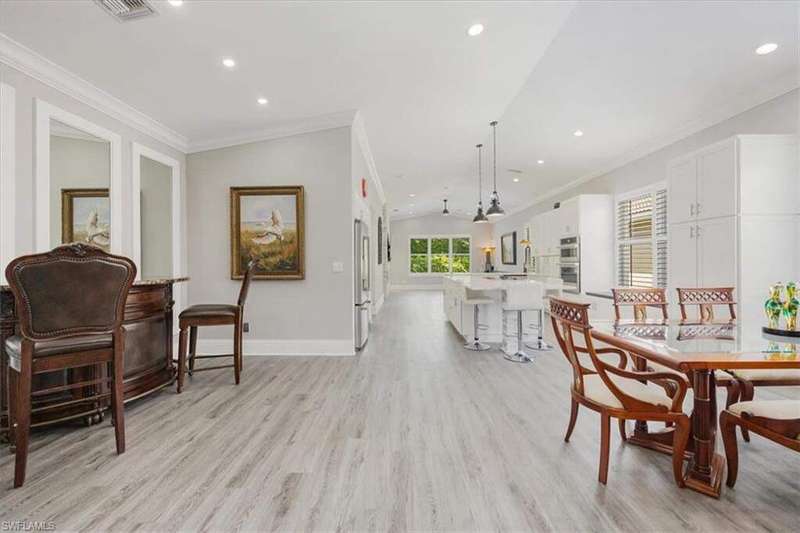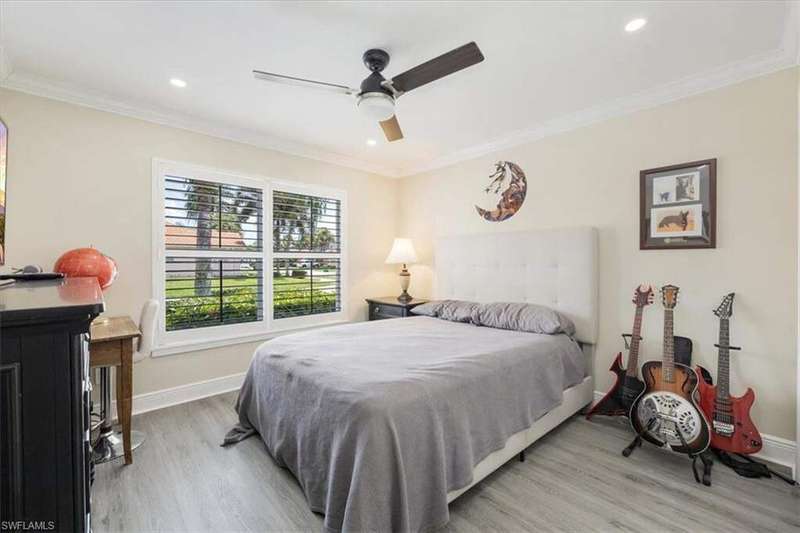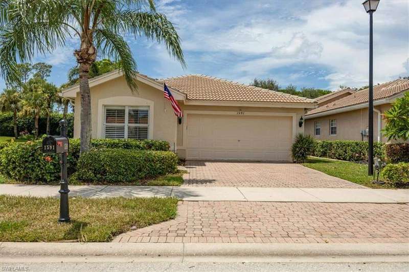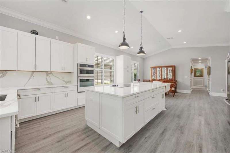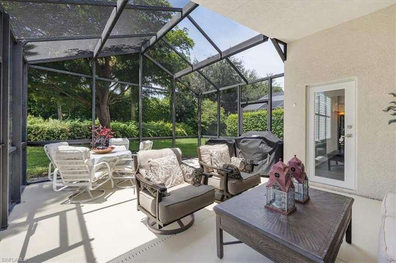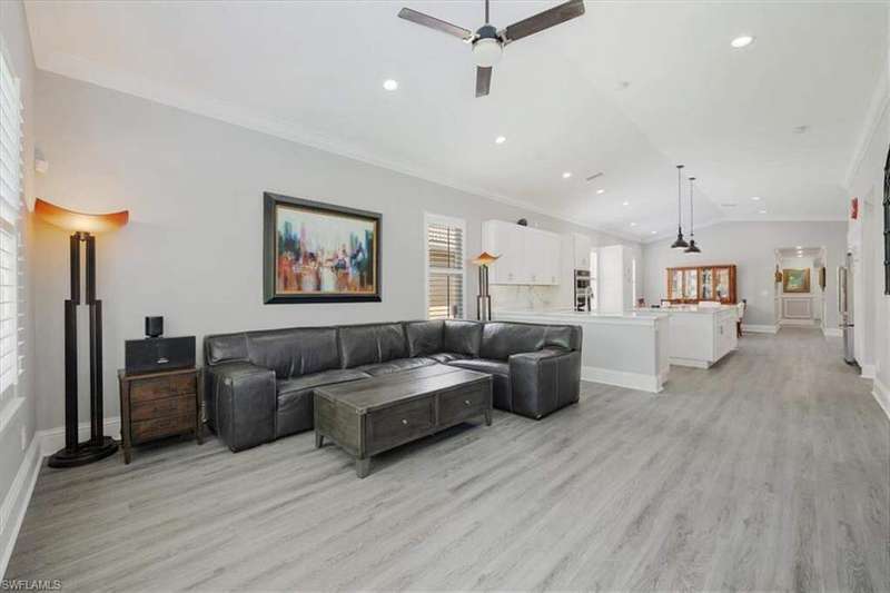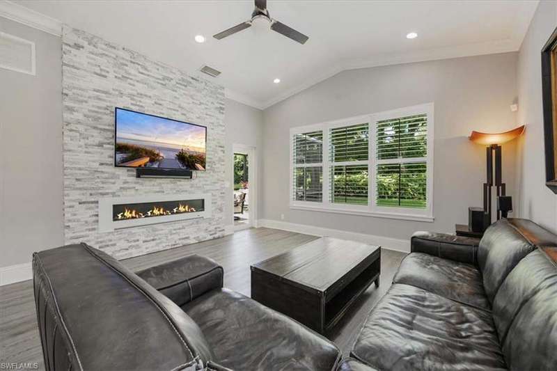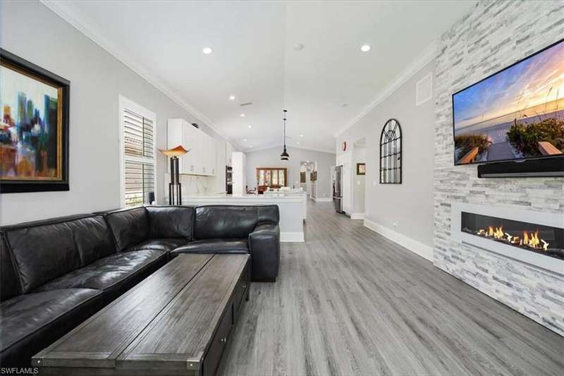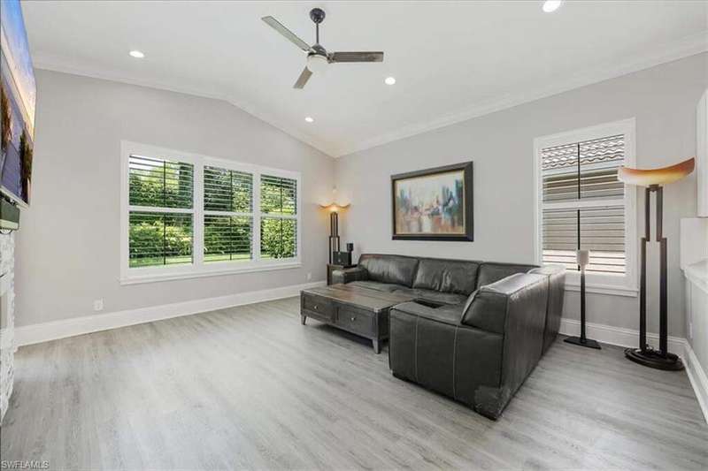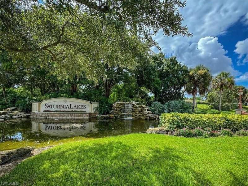 This beautifully updated 3BR + den, 2BA home sits on a private corner lot in the resort-style community of Saturnia Lakes. Vaulted ceilings, abundant natural light, and a desirable split floor plan. Luxury vinyl flooring in common areas and bedrooms. Tile in bathrooms. Recessed lighting, crown molding, and wood plantation shutters throughout. Renovated kitchen includes JennAir and other upscale appliances, white shaker cabinets, quartz counters, a large island and ample storage. Spacious primary suite offers a walk-in closet, private lanai access, and a reimagined en-suite bath with double vanity, separate shower and free-standing tub. Great room featuring stacked stone accent wall with fireplace. Screened extended lanai with custom lighting to enjoy the best of Florida living. Whole house generator ready. Saturnia Lakes amenities include pools, spa, sauna, fitness center, dance studio, tennis, playground, and more. Zoned for top-rated Collier County schools. Minutes from endless options for shopping and dining. Short drive to the white sand Gulf beaches. Easy drive to multiple airports.