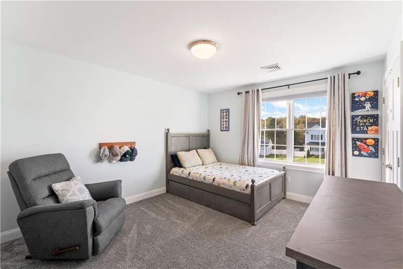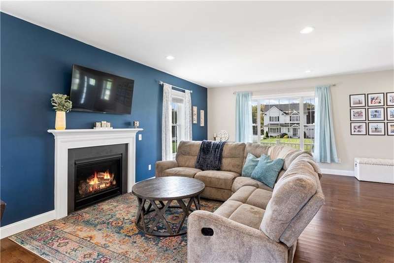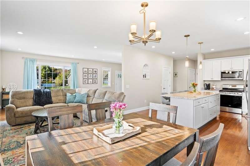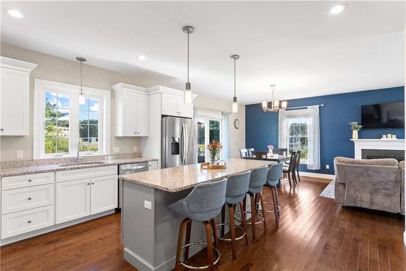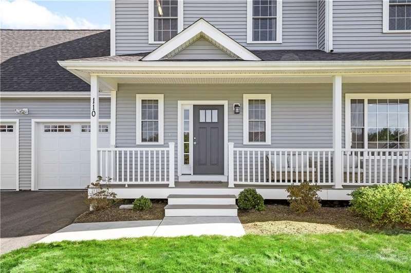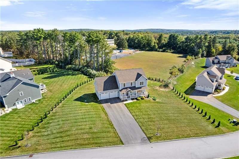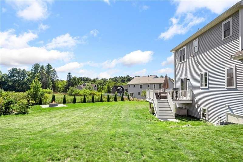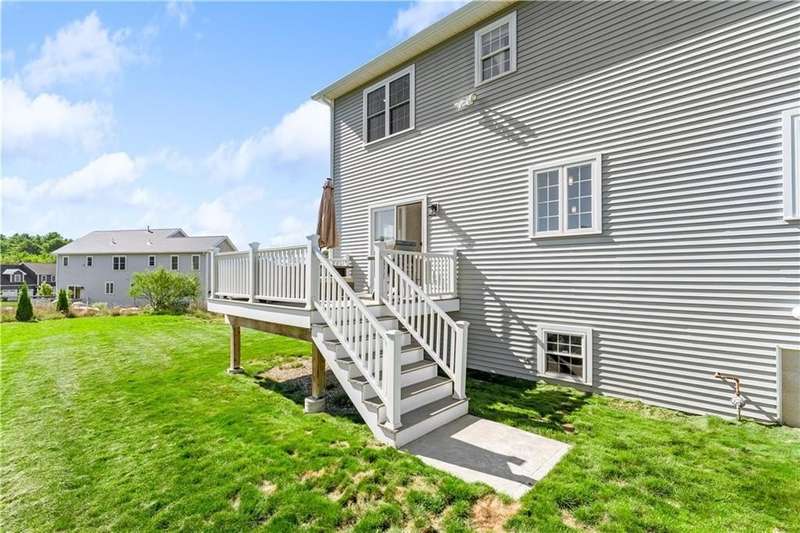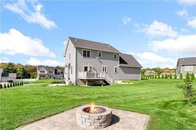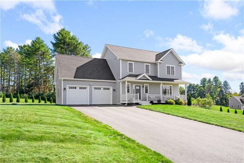 Located in Burrillville, right near Crystal Lake Golf Club, Steere Farm Estates was built to combine serene natural surroundings and tasteful modern living. This 3-bedroom, 2.5-bath home on a picturesque landscape, tended by built-in irrigation, begins with a covered front porch with low-maintenance composite decking. Step into the main level with hardwood floors throughout. A gas fireplace, picture window, and large sliders add pleasing light to the living area, dining area, and kitchen. A pantry closet, shaker cabinets, stainless appliances, stone counters, and a center island for informal dining add style and function. The railed rear deck lends more room to entertain with steps down to the sizable backyard and built-in fire pit. A mudroom, access to the attached 2-car garage, and a half bath complete the 1st floor. Upstairs, the owner’s suite has a walk-in closet and private bath with a dual-sink vanity and step-in shower. The remaining bedrooms sit near a convenient laundry room, dual-sink hall bath, and finished bonus space. The walkout basement is ready to be finished to suit your needs, while central A/C ensures comfort throughout this modern stunner. Discover Northern RI’s pristine lakes and protected forest areas for hiking, fishing, and swimming. Restaurants and the Assembly Theatre are nearby, along with local farms for fresh produce. The home is also less than 20 minutes from Bryant University.