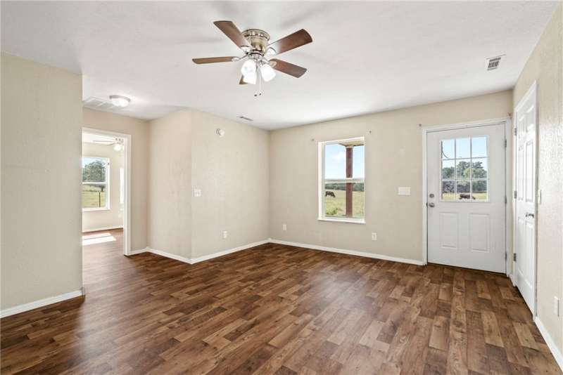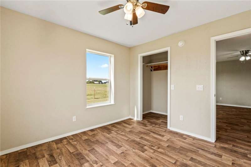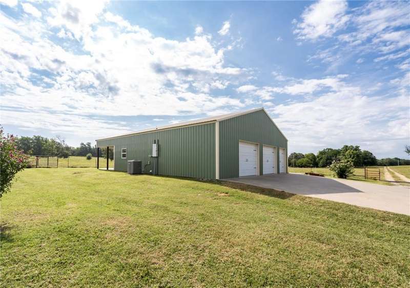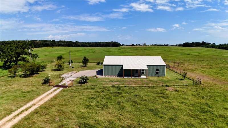 Country living just outside of town! 2bd, 2ba home with 1352sf sitting on 7.5 ac m/l. Metal exterior & roof. Open floor plan. Storm shelter accessible from the interior of the house. Huge storage/pantry area. Safe step walk-in tub in primary, shower in guest bath, both with bathroom safety bars. Covered front and back porches. 3-car oversized garage, large enough for workshop area. 2x6 walls, foam insulation with fiberglass in attic. Pasture land with a small patch of mature trees. Fenced & cross-fenced yard with cattle guards at the road & entering the yard. Less than 1/2 mile of dirt road. Built in 2017. Rural water & septic.