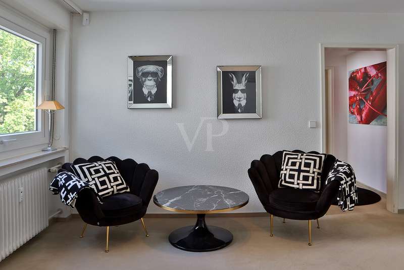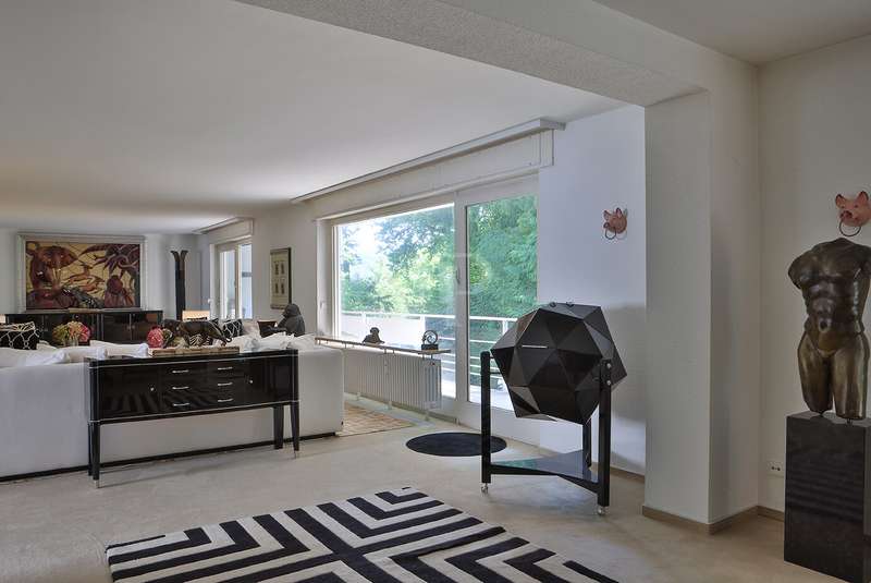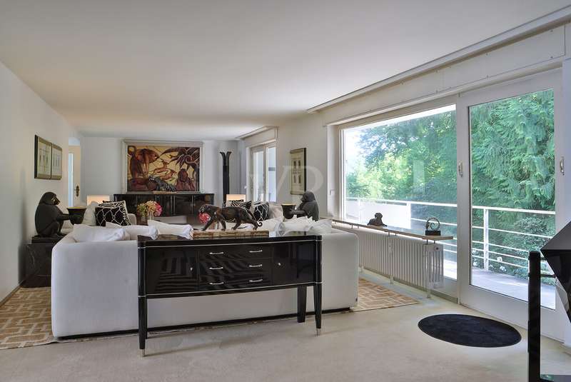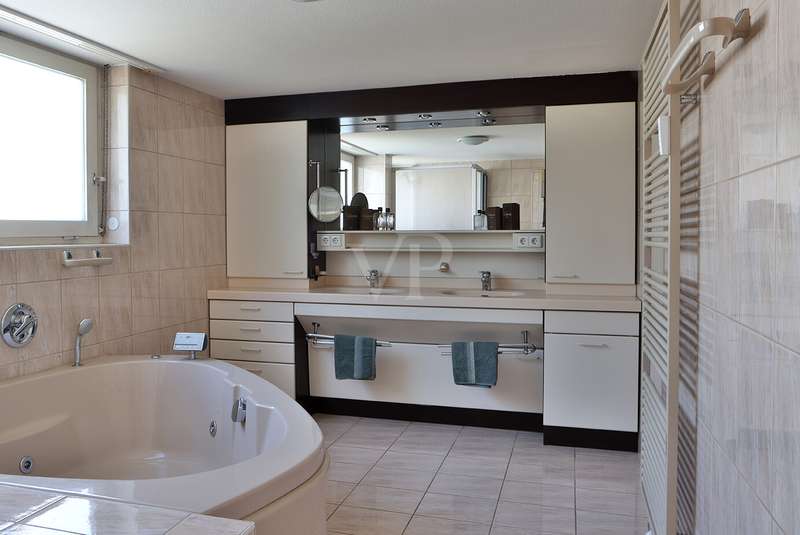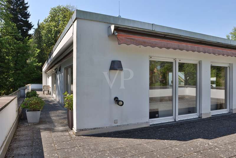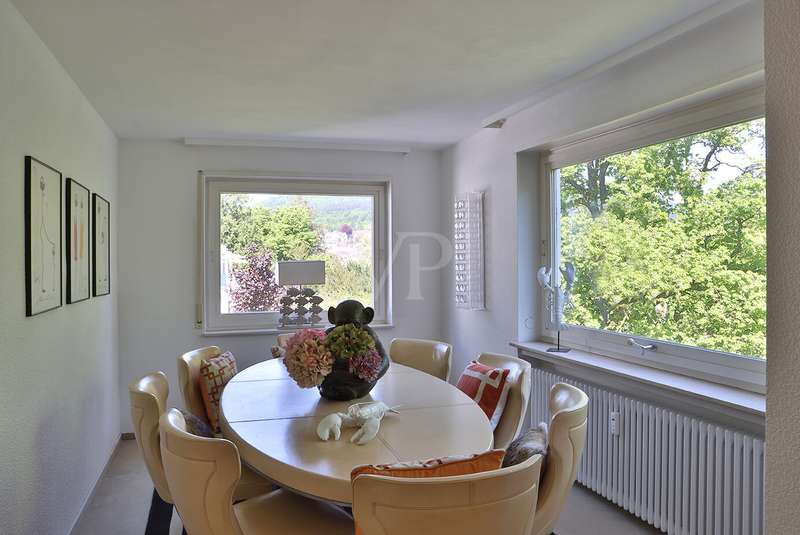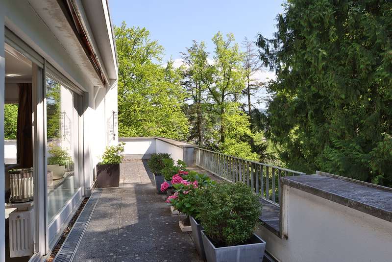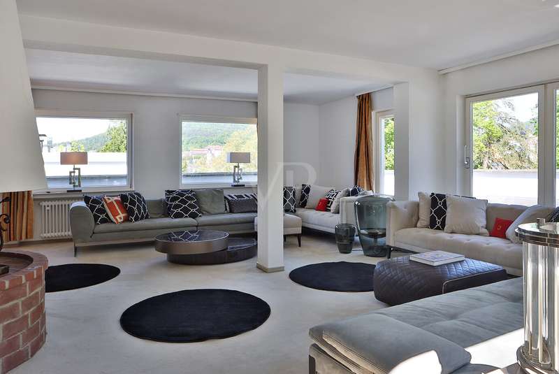 Penthouse with wrap-around terrace and castle view in prime location on Lichtentaler Allee This spacious penthouse extends over an impressive living space of approx. 381.8 m² and is the exclusive highlight of a well-kept residential building dating from 1960. Situated in a quiet prime residential area, this apartment combines high-quality fittings with a well thought-out room concept and magnificent views of the Old Palace, the New Palace and the surrounding Battert and Merkur landmarks. The 12 rooms of this property are spread over two levels and are directly accessible via their own exclusive elevator. This allows you to enjoy maximum comfort and absolute privacy - both at the entrance and within the penthouse. The spacious rooms offer plenty of design freedom and allow flexible use as living, working and guest areas. A special highlight is the large, wrap-around roof terrace, which surrounds almost all areas of the upper floor. Here you can enjoy a fantastic view - ideal for spending relaxing hours outdoors or receiving guests. The open fireplace in the living area lends the room a cozy atmosphere on cooler days. There are also two balconies to extend your private retreat. The partially floor-to-ceiling panoramic windows flood the penthouse with natural light and almost draw the striking surroundings into the living spaces. Inside, the interior impresses with its timeless elegance: high-quality carpets ensure a pleasant walking sensation, while the well-equipped fitted kitchen with Miele appliances meets the demands for functionality and quality. The open fireplace in the central living area lends the room a cozy atmosphere on cooler days. The four bedrooms offer sufficient privacy and comfort for family or guests. Three daylight bathrooms promise relaxing moments and enough space for individual morning routines. The impressive spiral staircase with decorative banisters, which elegantly connects the two levels of the penthouse, is particularly noteworthy. Partially electrically operated shutters provide comfort and can be controlled individually depending on the time of day or your wishes. The apartment is in a well-kept condition and also offers space for the implementation of other living concepts. The high quality of the fittings and the well thought-out overall concept make this property a rare opportunity for sophisticated living. Experience an exclusive symbiosis of a central, quiet residential location and modern living comfort. Arrange a viewing appointment and discover all the advantages of this impressive penthouse with exclusive elevator to the penthouse, large panoramic windows and spacious rooms.
