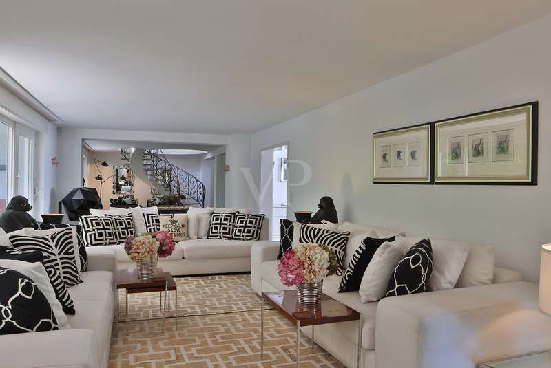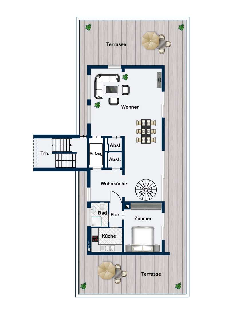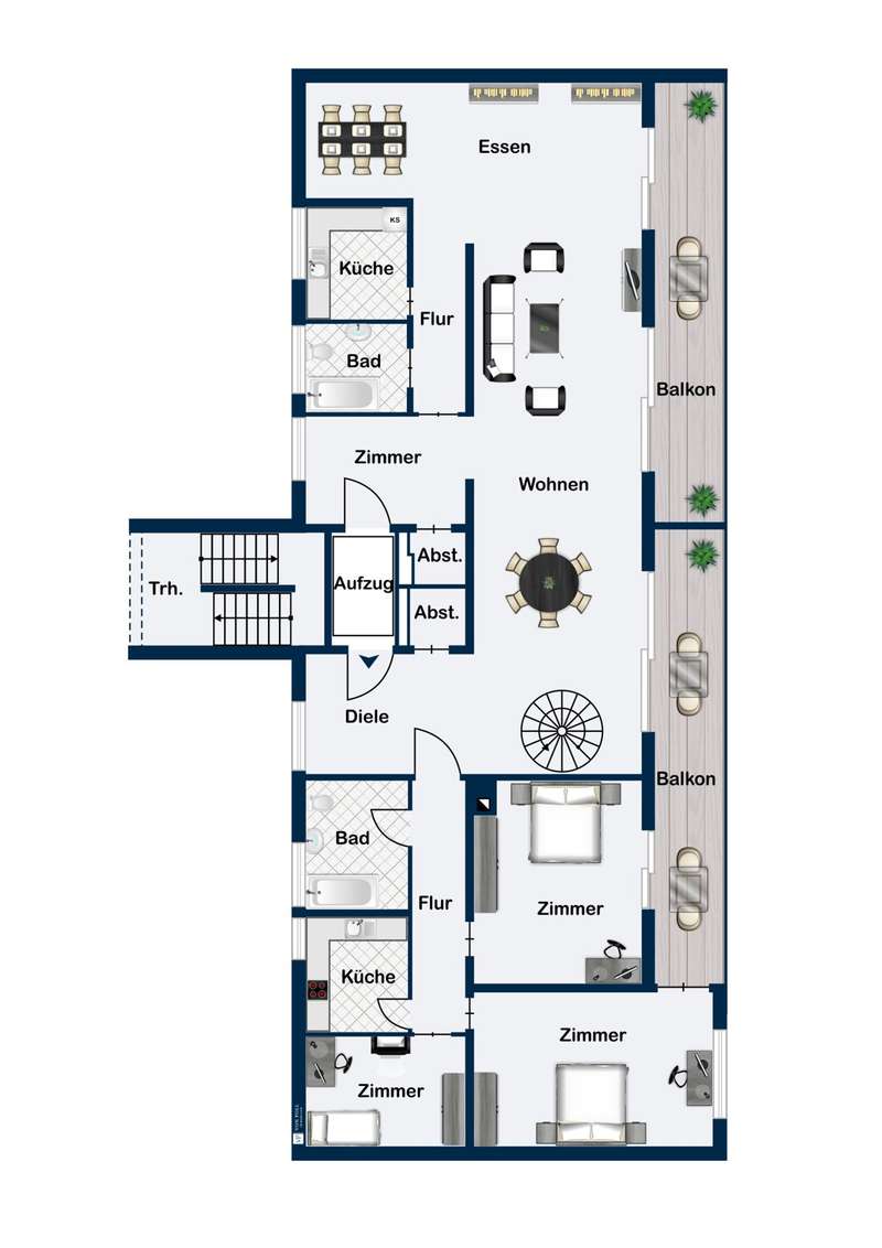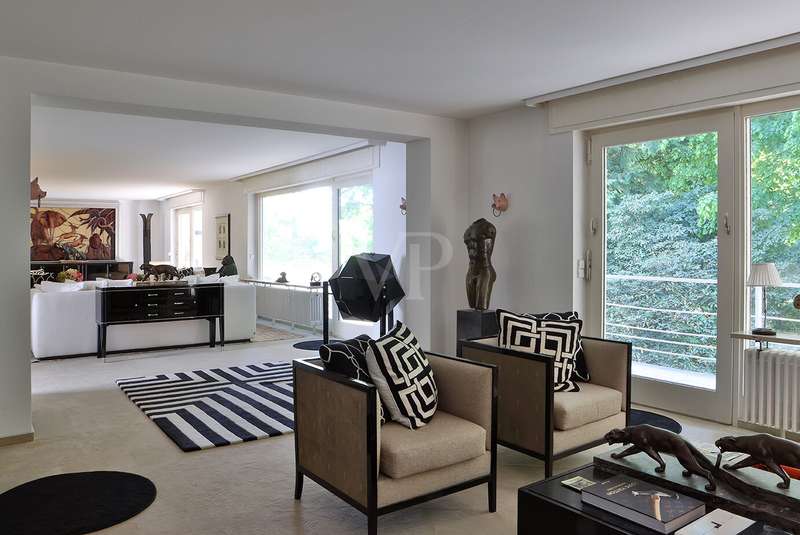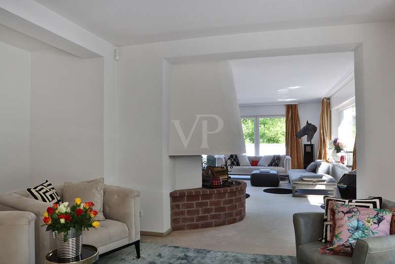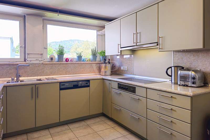 Penthouse with wrap-around terrace and castle view in prime location on Lichtentaler Allee This spacious penthouse extends over an impressive living space of approx. 381.8 m² and is the exclusive highlight of a well-kept residential building dating from 1960. Situated in a quiet prime residential area, this apartment combines high-quality fittings with a well thought-out room concept and magnificent views of the Old Palace, the New Palace and the surrounding Battert and Merkur landmarks. The 12 rooms of this property are spread over two levels and are directly accessible via their own exclusive elevator. This allows you to enjoy maximum comfort and absolute privacy - both at the entrance and within the penthouse. The spacious rooms offer plenty of design freedom and allow flexible use as living, working and guest areas. A special highlight is the large, wrap-around roof terrace, which surrounds almost all areas of the upper floor. Here you can enjoy a fantastic view - ideal for spending relaxing hours outdoors or receiving guests. The open fireplace in the living area lends the room a cozy atmosphere on cooler days. There are also two balconies to extend your private retreat. The partially floor-to-ceiling panoramic windows flood the penthouse with natural light and almost draw the striking surroundings into the living spaces. Inside, the interior impresses with its timeless elegance: high-quality carpets ensure a pleasant walking sensation, while the well-equipped fitted kitchen with Miele appliances meets the demands for functionality and quality. The open fireplace in the central living area lends the room a cozy atmosphere on cooler days. The four bedrooms offer sufficient privacy and comfort for family or guests. Three daylight bathrooms promise relaxing moments and enough space for individual morning routines. The impressive spiral staircase with decorative banisters, which elegantly connects the two levels of the penthouse, is particularly noteworthy. Partially electrically operated shutters provide comfort and can be controlled individually depending on the time of day or your wishes. The apartment is in a well-kept condition and also offers space for the implementation of other living concepts. The high quality of the fittings and the well thought-out overall concept make this property a rare opportunity for sophisticated living. Experience an exclusive symbiosis of a central, quiet residential location and modern living comfort. Arrange a viewing appointment and discover all the advantages of this impressive penthouse with exclusive elevator to the penthouse, large panoramic windows and spacious rooms.