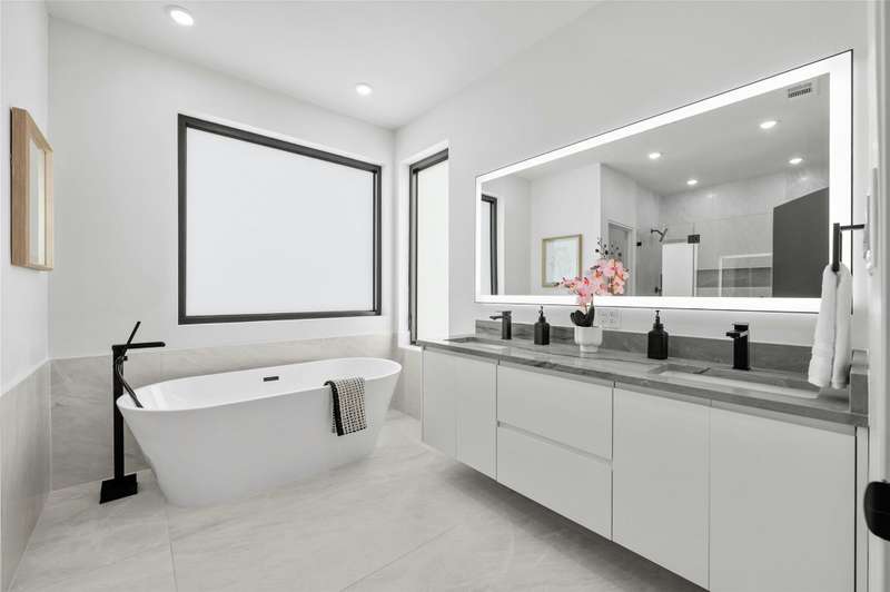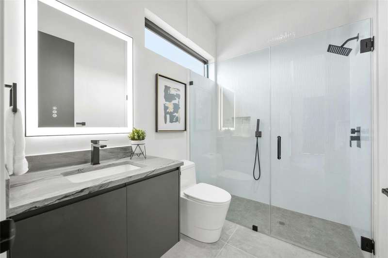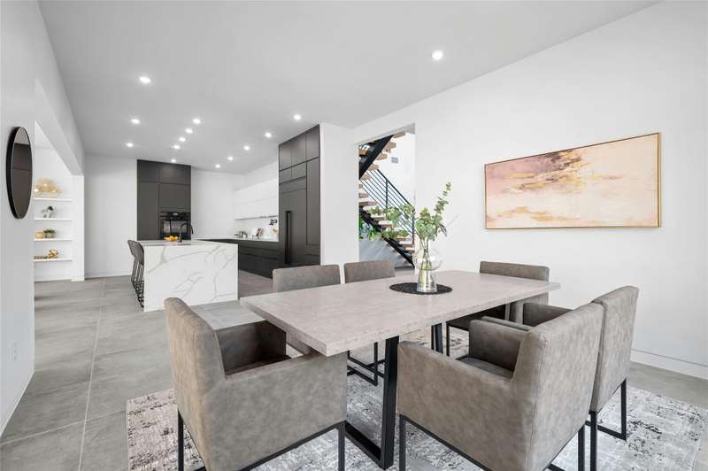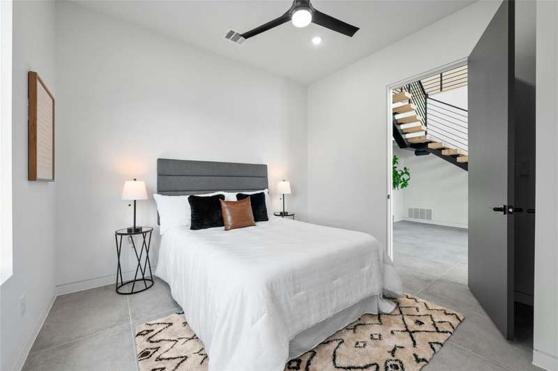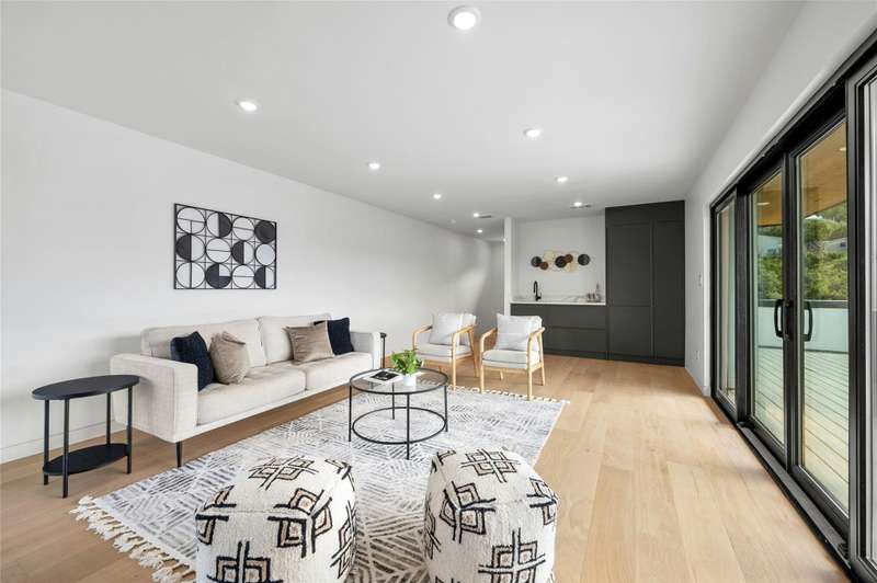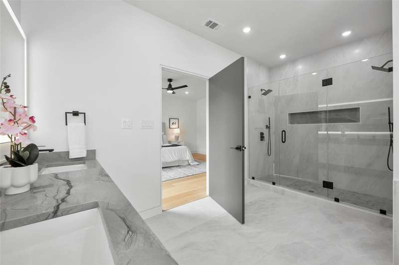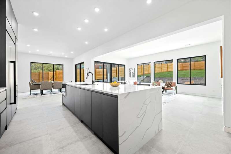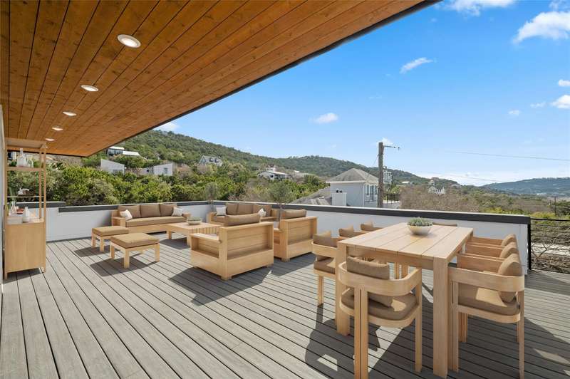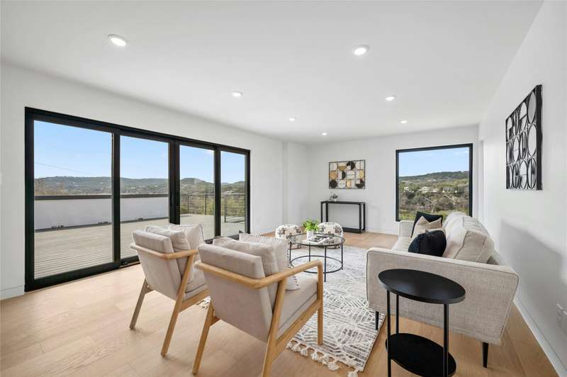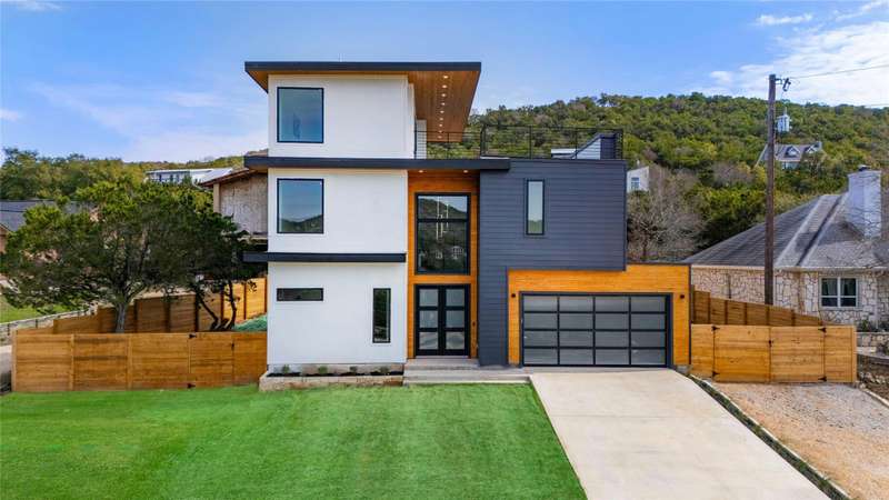 Incredible views, stellar entertaining spaces, lake access and on-site RV parking await in this tranquil setting at newly built 11205 Beach Rd. Set into the gently sloping hillside of a .434 acre lot, across from the neighborhood boat ramp, you get unparalleled hill country views from the second floor bedrooms, third floor media room, and expansive 732 square foot roof top deck. Soaring ceilings greet you as you enter the double front doors, the first floor opens to a graciously sized, open-concept kitchen, living, and dining room. The streamlined kitchen shines with its quartz waterfall island and countertops, routed, hardware-free European cabinets, built-in Jenn-Air fridge, under cabinet Jenn-Air drawer microwave, Frigidaire double wall oven, Frigidaire induction cooktop, inset pot-filler, and Bosch Dishwasher. The space is further elevated by flush baseboards, trimless doors, and shadow gap details. Double sliding doors extend the living area onto the patio and extended xeri-scaped yard beyond. Continue up the stone steps to the massive backyard, roast marshmallows over the fire pit, or cozy up to the fireplace inside. At the second floor, anchored by wide plank white oak floors, you will find the remaining 3 bedrooms, 3 baths and laundry room. The spacious primary bedroom, overlooking the back yard, features an incredibly serene primary bath including a free-standing tub, quartzite countertops, dual vanities, lighted anti-fogging vanity mirror, tiled walls, and dual shower heads in the glassed-in primary shower. The third floor is truly the property's crown jewel. An expansive media room with wet bar, built in refrigerator and freezer, and expansive finished deck with incredible Hill Country, sunset views is not to be missed. Bring your boat, your RV, and start living the good life at 11205 Beach Rd.
