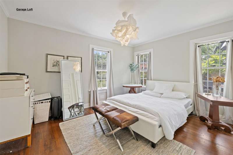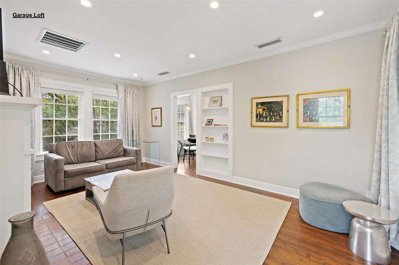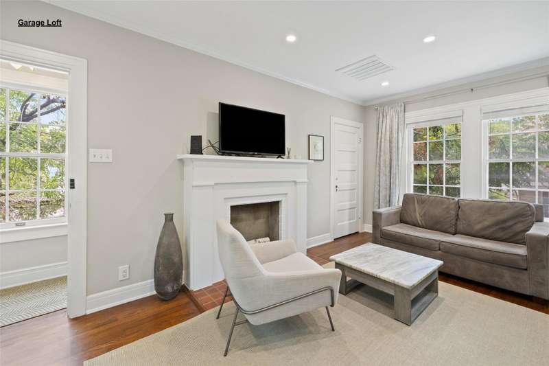 Architectural charm remains throughout, with sweeping staircases, wrought iron details, original wood flooring, and multiple fireplaces. The upstairs unit features a balcony overlooking the treetops, and the three-car garage includes additional space that offers storage or expansion potential.