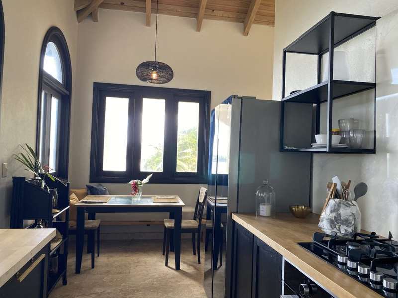 Each casita is thoughtfully designed with open-concept living areas, modern kitchens, and spacious bedrooms featuring en-suite bathrooms. The interiors combine comfort and island charm, with natural light streaming through large windows and doors that open to inviting terraces — ideal for relaxing or entertaining outdoors.