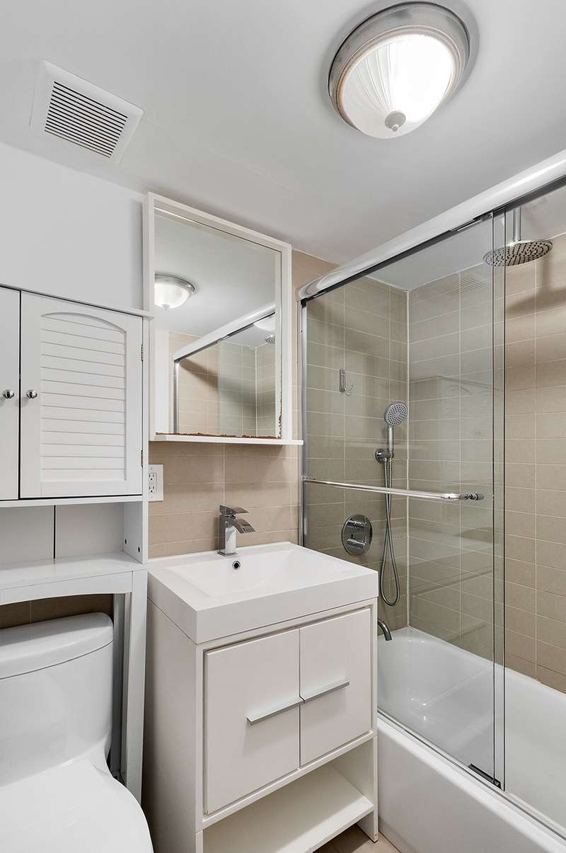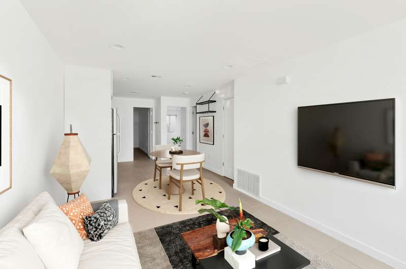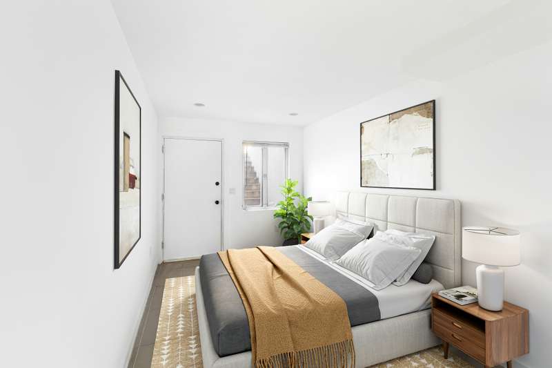 Nestled into the back of the apartment, are two bedrooms, each with full sized closets. The bathroom offers ample storage and there is an in-unit washer and dryer.