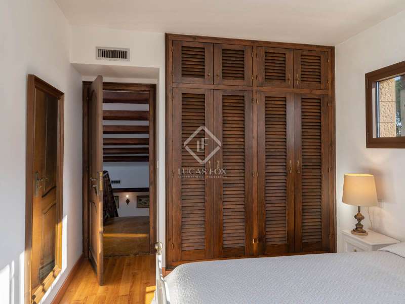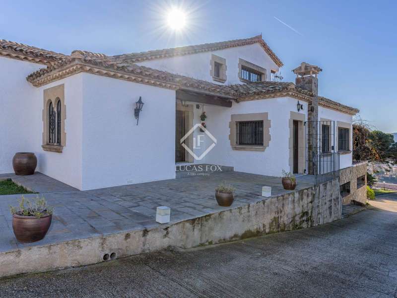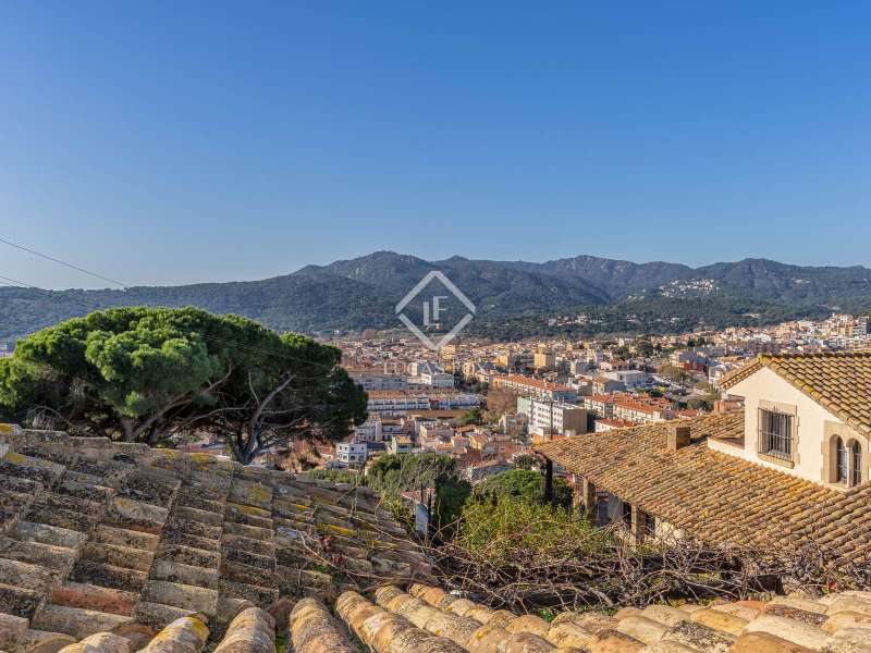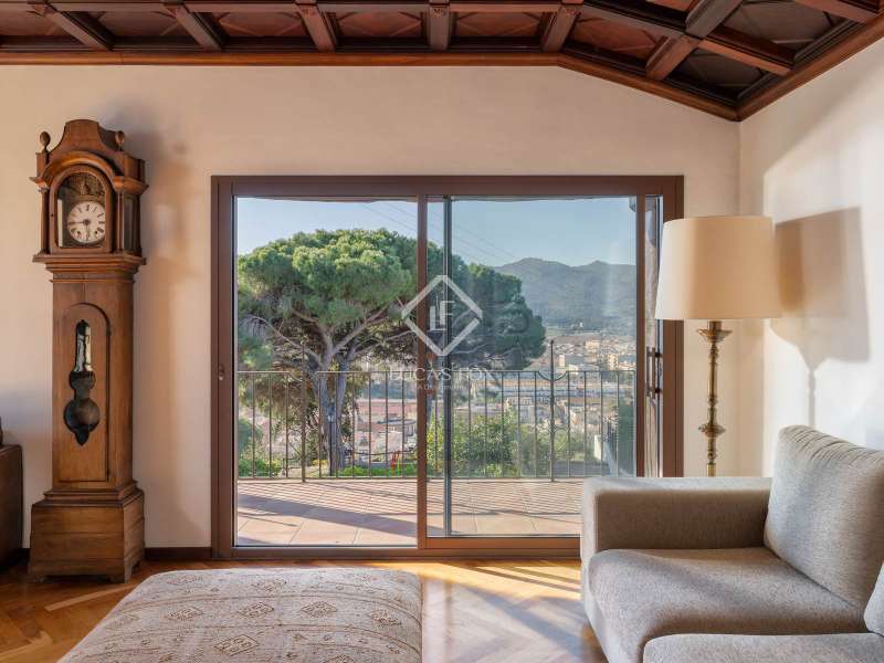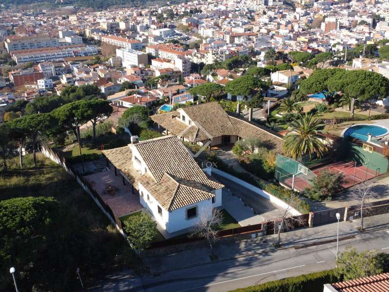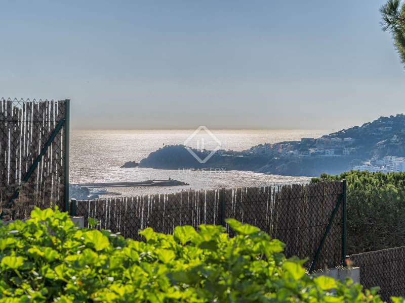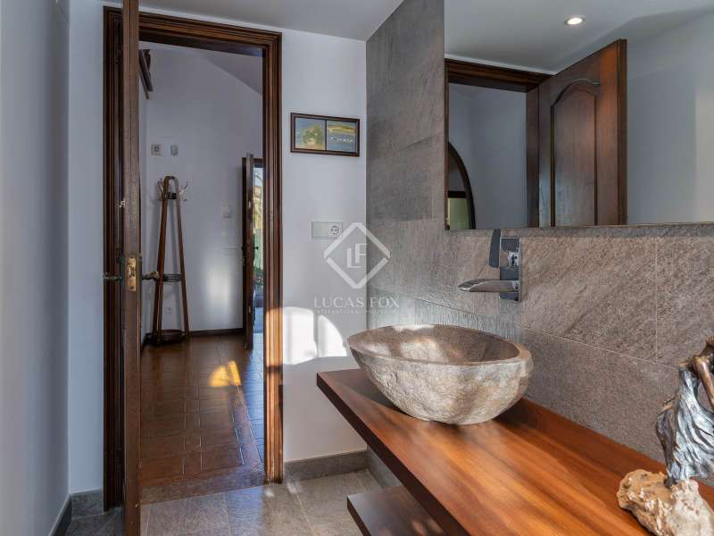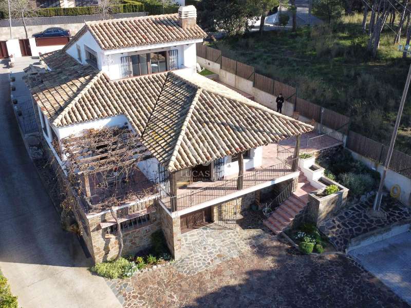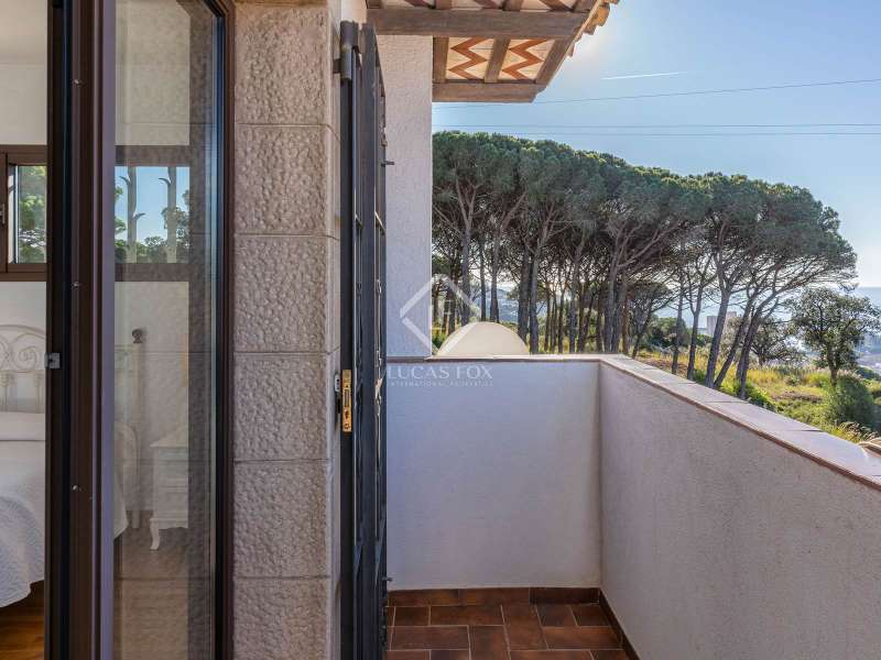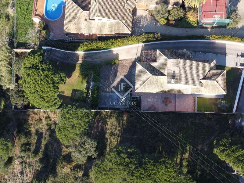 Lucas Fox presents Villa Mónica, a 359 m² house built on a 1,461 m² plot for sale located between Sant Feliu and S'Agaró, 5 minutes from Sant Pol beach. The property has a rustic style with its wooden beams and a modern touch with its large double-glazed windows and renovated bathrooms. The property is spread over three floors. We enter through the main door, and we find a large entrance hall with an arch. On this floor, there is a guest bathroom, a laundry room room, a single bedroom and a large kitchen with its marble countertop. The kitchen has plenty of storage space and is equipped with all appliances such as an oven, microwave, induction hobs and Neff gas hob and dishwasher. In addition, it has a double stone sink. The living-dining room is very spacious and elegant and has with wooden beams, a large fireplace and large windows by Technal to enjoy wonderful views of the sea and the mountains. It offers access to a terrace with its stone barbecue, perfect for summer dinners. From the living room we access another terrace with its pergola and views. We go up to the upper floor , where we access a double bedroom , a single bedroom and a double bathroom with its Italian shower. We continue up the stairs and access a single bedroom , a double bedroom and a full bathroom . From the rooms From the upper floor , we have access to a terrace with sea views. We go down to the lower floor by stairs from the kitchen. Here, there is a double bedroom or study, a shower room, a storage room, a wine cellar and a garage for three cars. The property is distinguished by its rustic style and high-quality finishes, such as natural wood floors and wood-coloured porcelain floors. The house has a gas central heating system, an alarm system and the bedrooms include built-in wardrobes. The bathrooms have been renovated and have Roca brand equipment. The large garden benefits from automatic irrigation and lighting system and has some majestic pine trees for shade in summer, some lemon trees and an olive tree. This property has a unique location overlooking the bay of Sant Feliu de Guíxols, an emblematic town on the Costa Brava, known for its markets, fine dining restaurants, shops, monastery and beach. Please do not hesitate to contact us to visit this beautiful property or request more information.