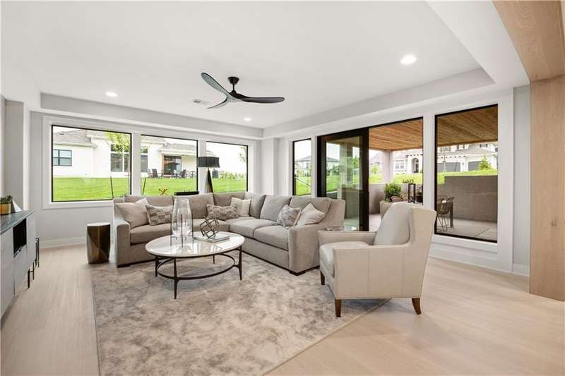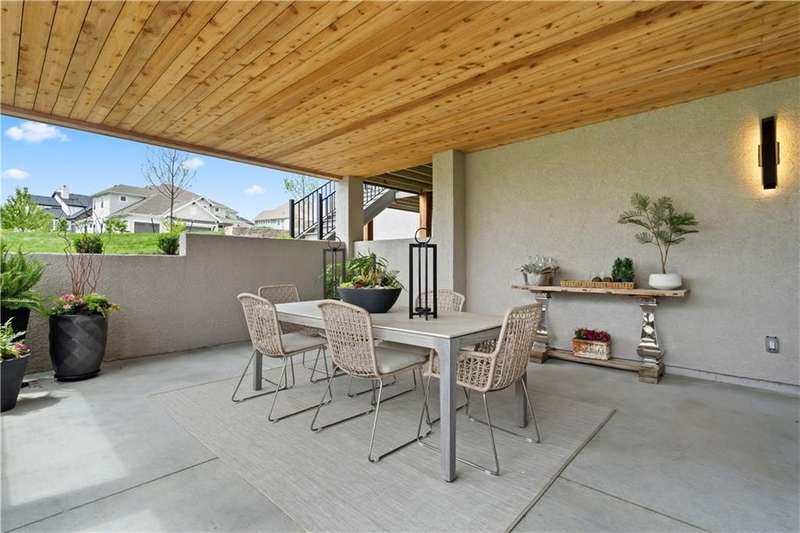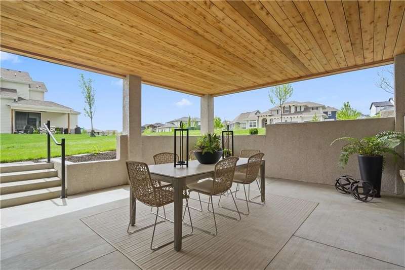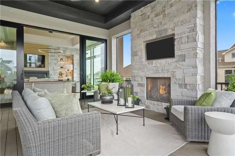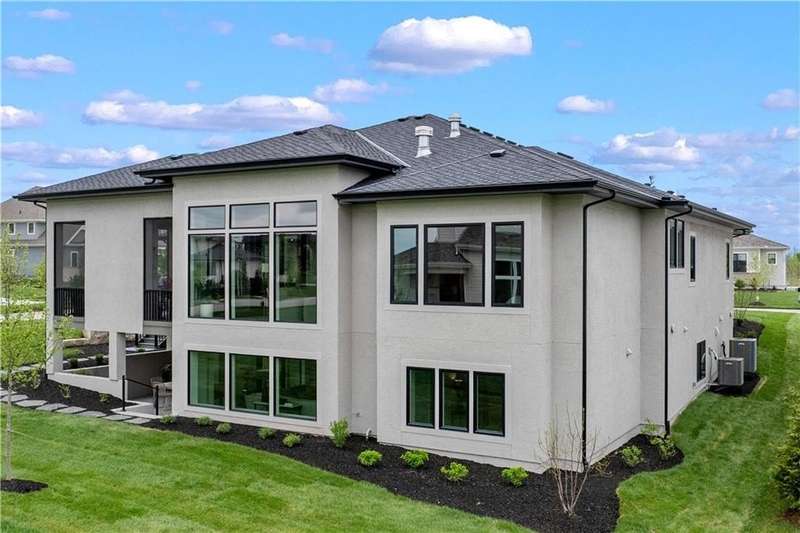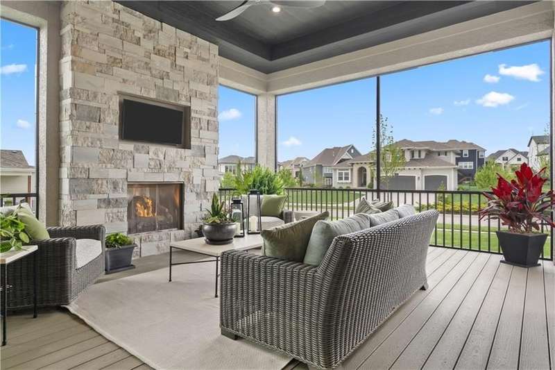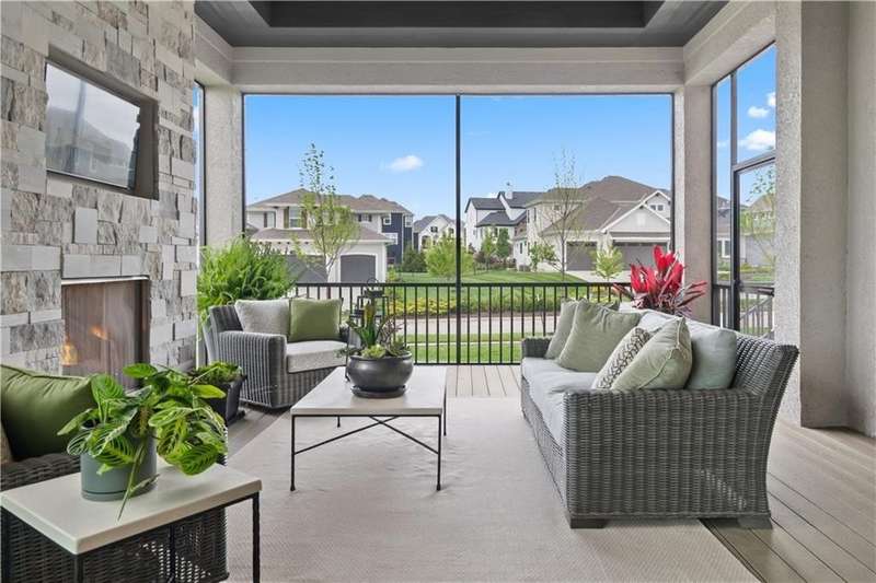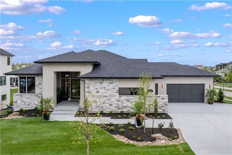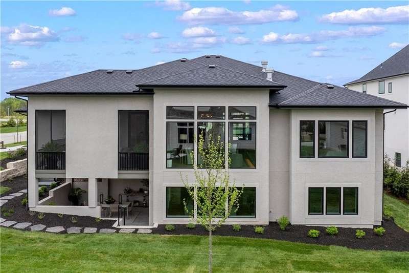MODEL HOME FOR SALE! The sought after Willis Custom Homes Clydesdale REVERSE on lot 49 with a split 4 car garage and rare circle driveway is ready for move in! This perfect corner walkout lot features high end finishes and plenty upgraded features in a spacious main floor master suite REVERSE floor plan with dramatic high ceilings and over 5000 square feet of finished space. This unique plan features an upstairs bar as you enter, spacious kitchen with large island, prep style kitchen pantry. New modern fireplace feature wall and plenty of windows for natural light. There is a full finished basement with luxury vinyl tile flooring, large recreational room with wet bar and three bedrooms/fitness/craft rooms in the lower level. Enjoy two outdoor spaces with a screened in lanai and grill deck on the main level and a lower level walkout covered patio. This beautiful brand new home is located in Century Farms, an upscale new home community located in South Overland Park. Close to 159th NEW shopping center and easy access to Highway 69 with new 167th street on ramp. BLUE VALLEY SCHOOLS. Come join the fun in Century Farms with a large resort style pool with slide, farmhouse style club house for parties and neighborhood events, two pickleball courts, fitness room, reading loft, firepit, kids play area, wild flower walkways, sports field and community garden. This MODEL HOME is NOW FOR SALE!