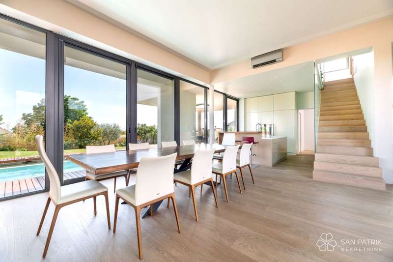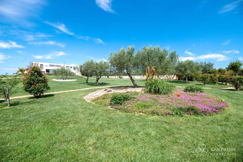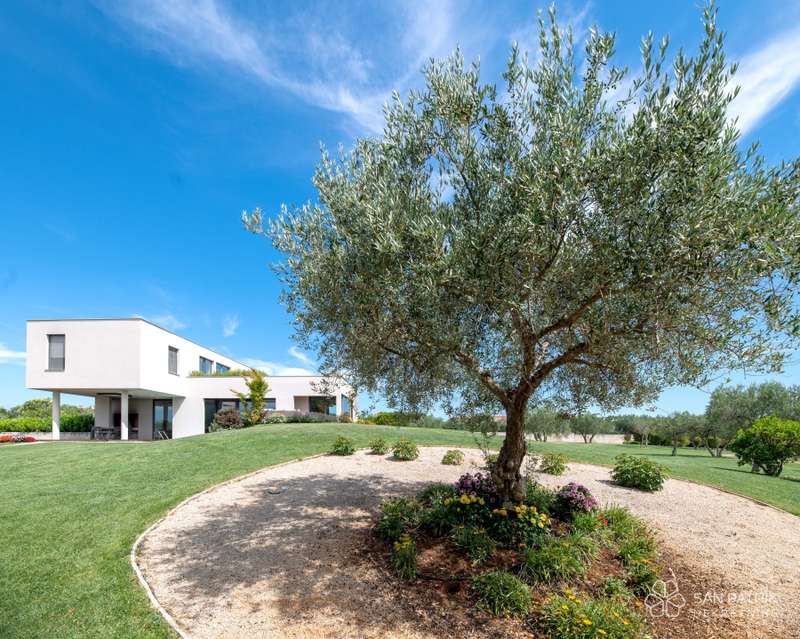 Nestled in a tranquil setting with breathtaking views of nearby olive groves on a plot of 5,000 m2,, this luxurious villa is situated just 500 meters from the sea in Umag, a charming town on the Istrian coast that captivates with its allure, diversity, and richness. This meticulously designed villa synthesizes the uniqueness of the entire region, offering a different Mediterranean experience.