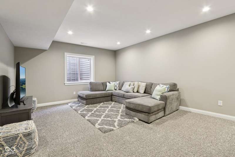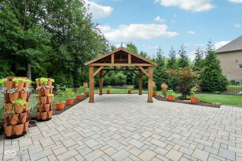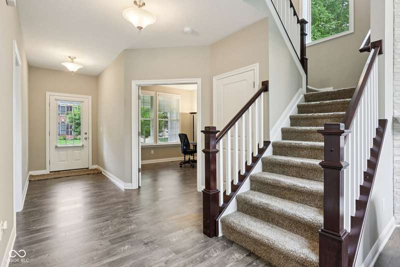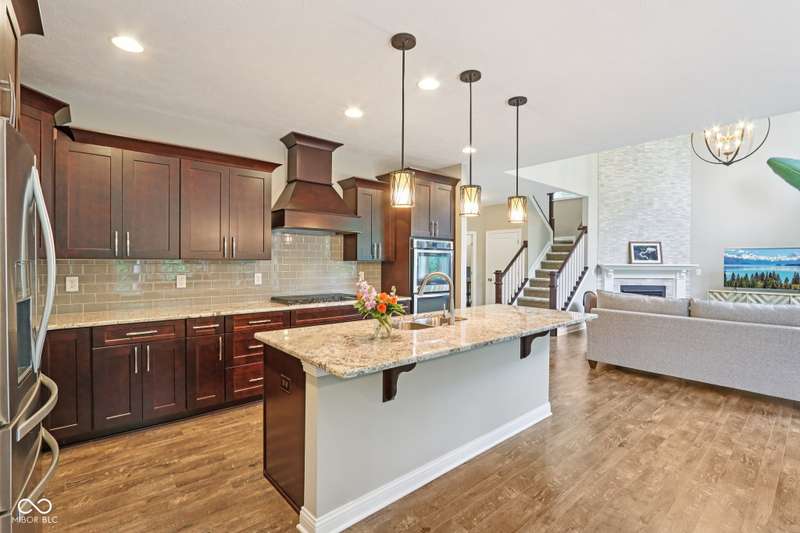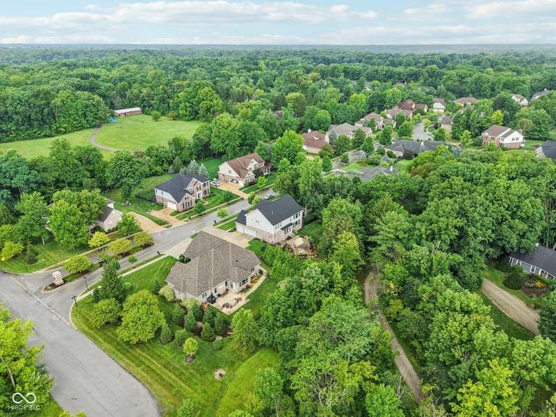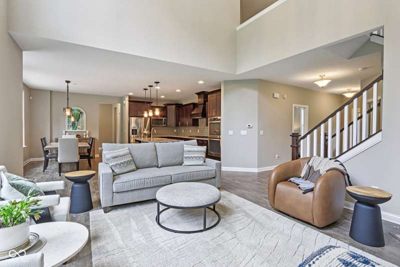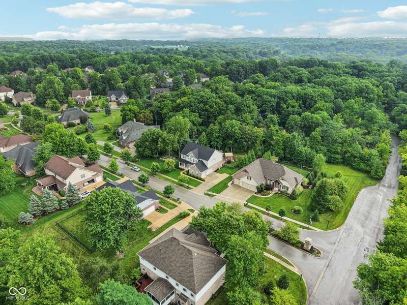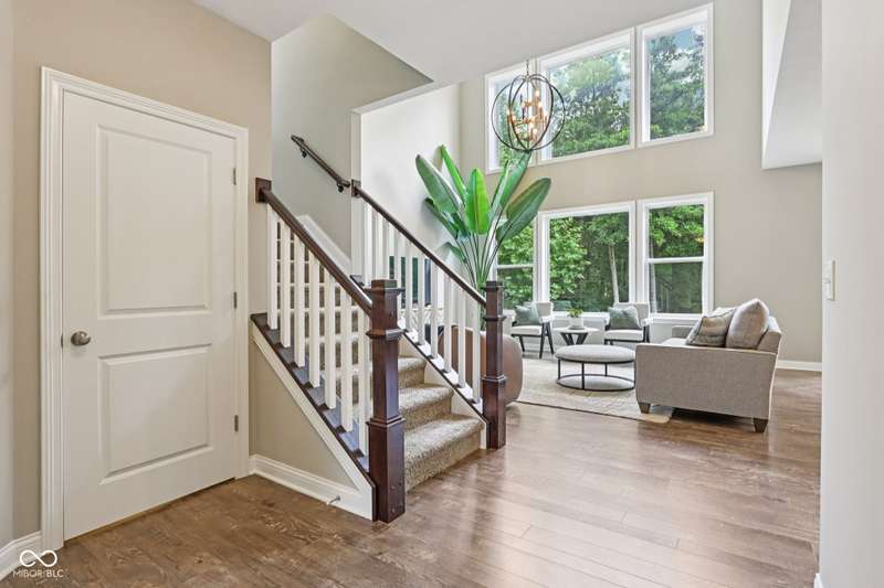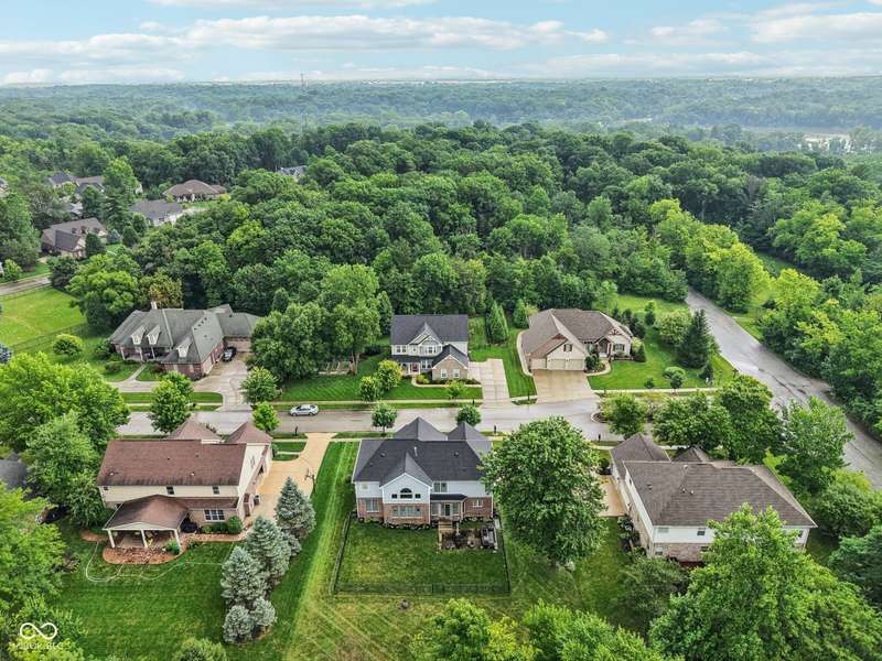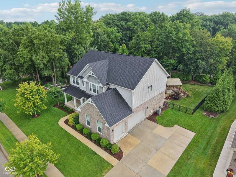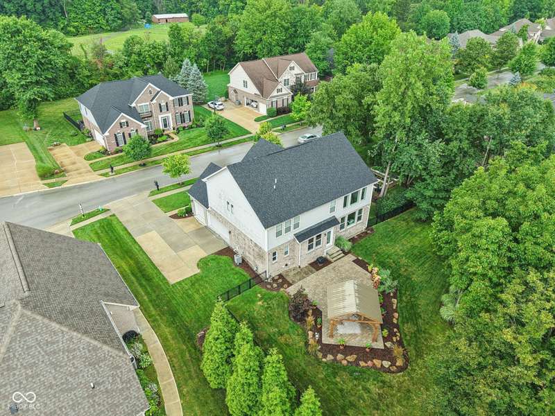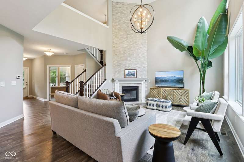 Welcome to where upgraded living meets natural beauty. Nestled near Scott Starling Nature Sanctuary and the Eagle Crest Trailhead, this home offers peaceful surroundings within walking distance to wooded trails, wildlife, and serene green space. Inside, the light-filled, open-concept layout is anchored by a soaring two-story great room with a dramatic stacked-stone gas fireplace and added windows that bring the outside in. The custom kitchen features an oversized island, upgraded cabinetry, exterior-vented hood, granite countertops, and stainless appliances-perfect for everyday meals or entertaining. The main level includes a bedroom with private en-suite, flexible office space, and a drop zone/mudroom off the spacious 3-car garage. Upstairs you'll find four additional bedrooms, including a luxurious primary suite overlooking the beautifully landscaped, fully fenced backyard. The primary bath includes a soaking tub, a walk-in shower with seat ledge, comfort-height vanities, and dual walk-in closets. The custom finished basement is a showstopper with a stylish coffee and beverage bar, a large family/TV room, an expansive workout space, and a full bathroom- ideal for daily routines and weekend hosting. Enjoy evenings under the pergola, relax in a hammock nestled between mature trees, or explore nearby Eagle Creek Park. With neighborhood amenities including a pool, playground, and social events, this home truly offers the best of both indoor comfort and outdoor connection.
