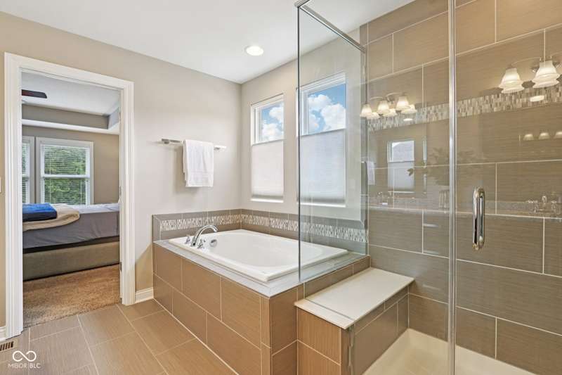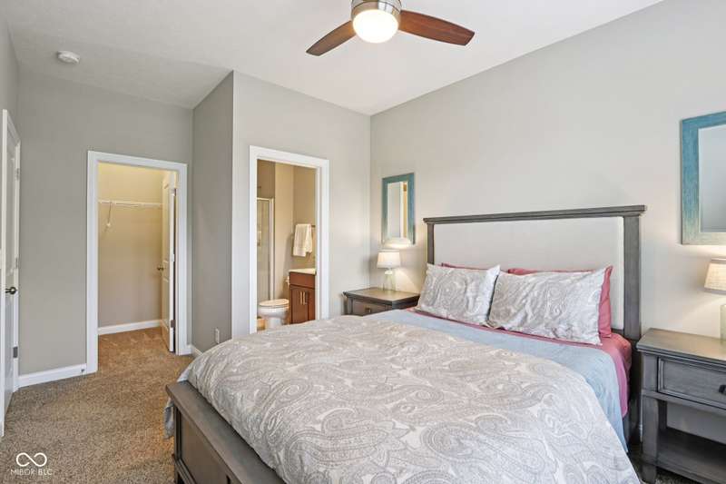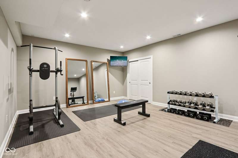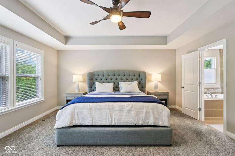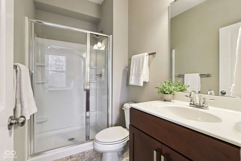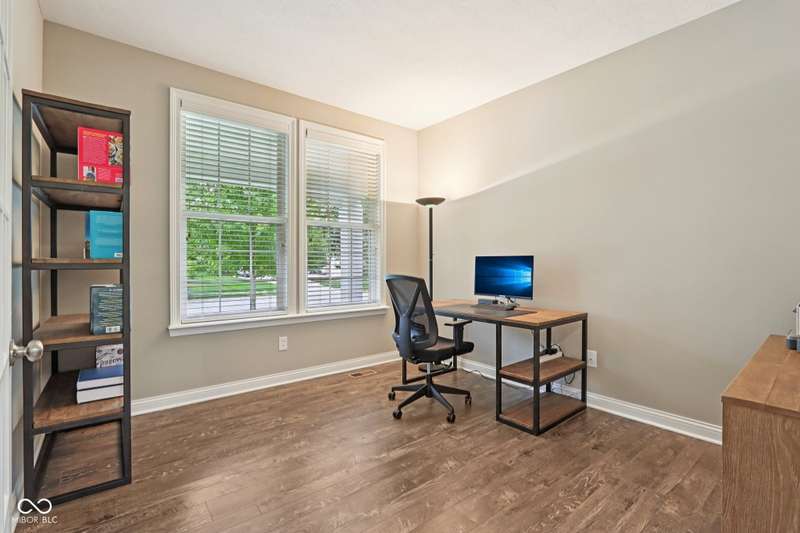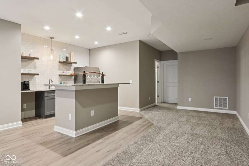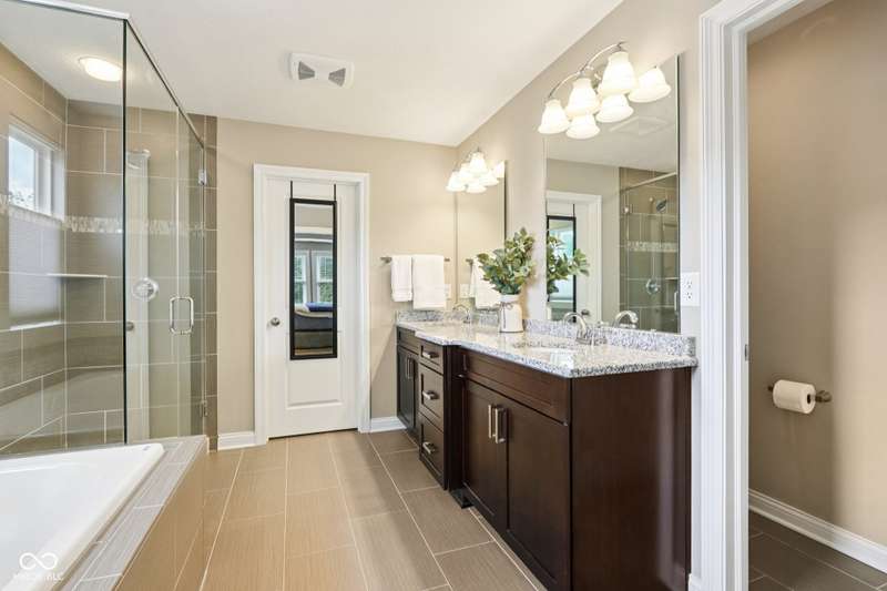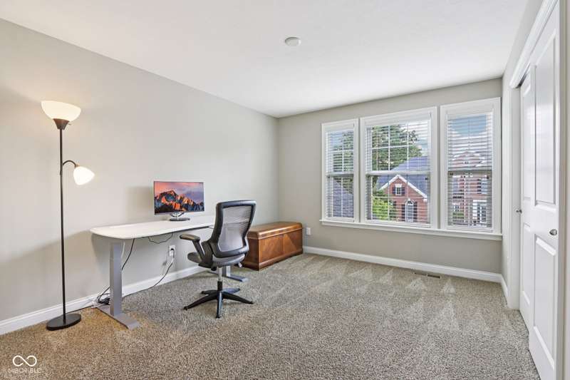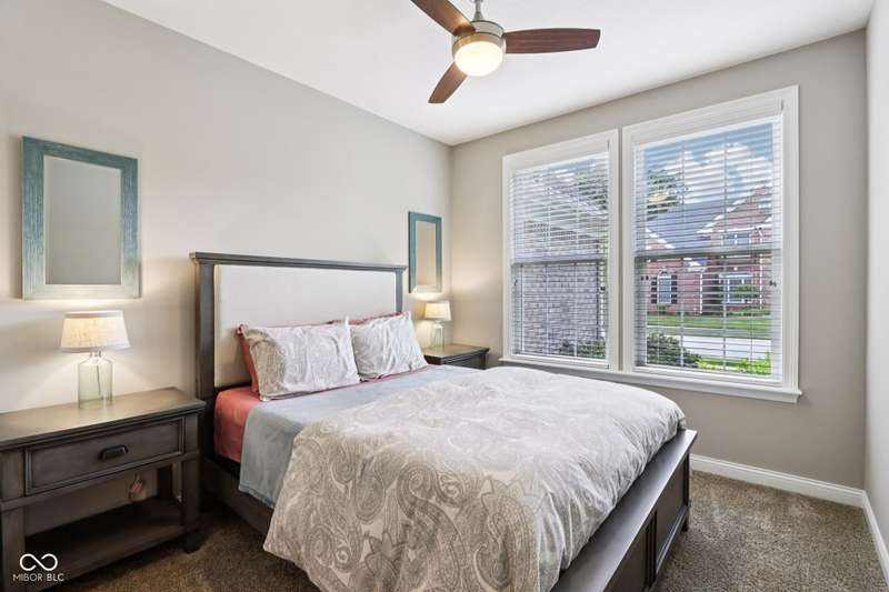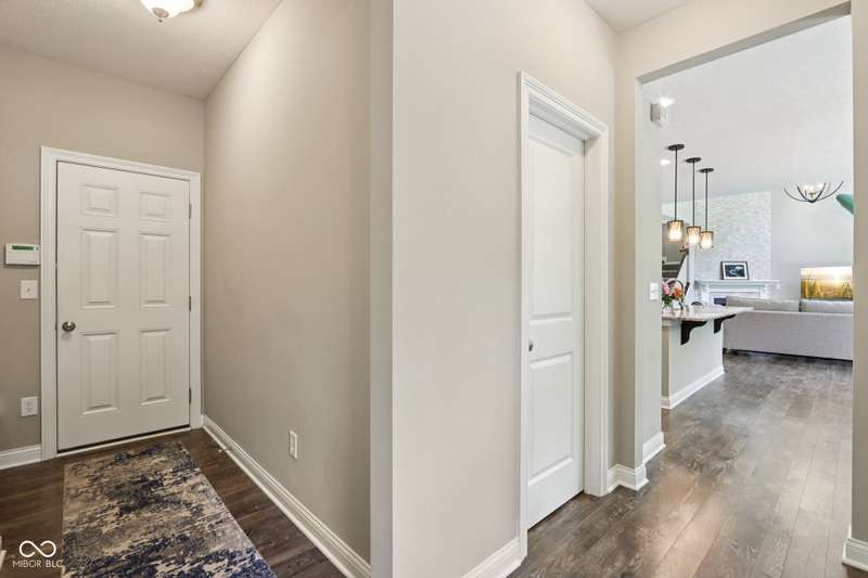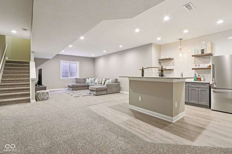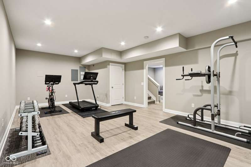 Welcome to where upgraded living meets natural beauty. Nestled near Scott Starling Nature Sanctuary and the Eagle Crest Trailhead, this home offers peaceful surroundings within walking distance to wooded trails, wildlife, and serene green space. Inside, the light-filled, open-concept layout is anchored by a soaring two-story great room with a dramatic stacked-stone gas fireplace and added windows that bring the outside in. The custom kitchen features an oversized island, upgraded cabinetry, exterior-vented hood, granite countertops, and stainless appliances-perfect for everyday meals or entertaining. The main level includes a bedroom with private en-suite, flexible office space, and a drop zone/mudroom off the spacious 3-car garage. Upstairs you'll find four additional bedrooms, including a luxurious primary suite overlooking the beautifully landscaped, fully fenced backyard. The primary bath includes a soaking tub, a walk-in shower with seat ledge, comfort-height vanities, and dual walk-in closets. The custom finished basement is a showstopper with a stylish coffee and beverage bar, a large family/TV room, an expansive workout space, and a full bathroom- ideal for daily routines and weekend hosting. Enjoy evenings under the pergola, relax in a hammock nestled between mature trees, or explore nearby Eagle Creek Park. With neighborhood amenities including a pool, playground, and social events, this home truly offers the best of both indoor comfort and outdoor connection.