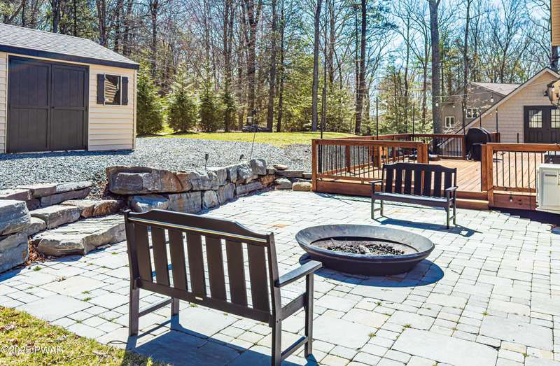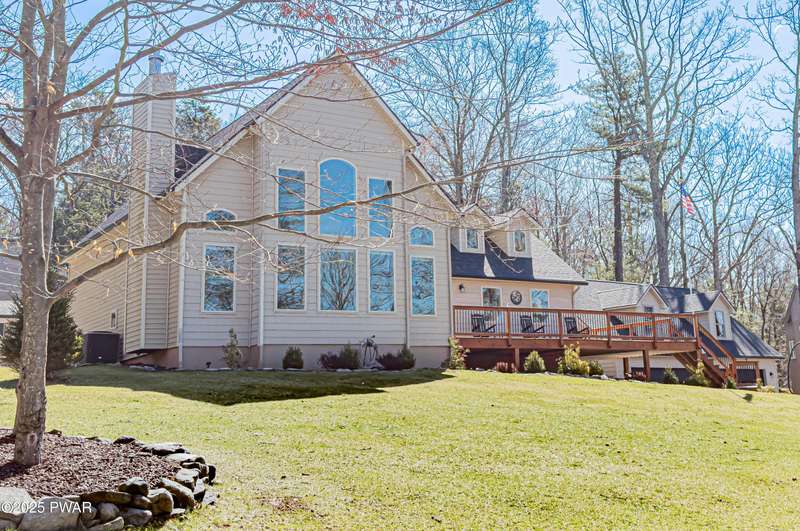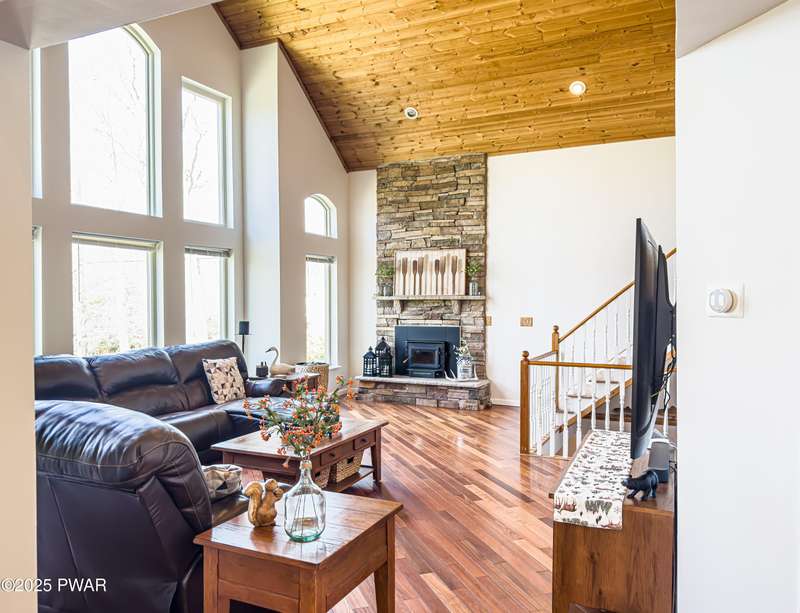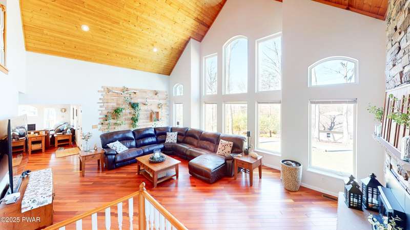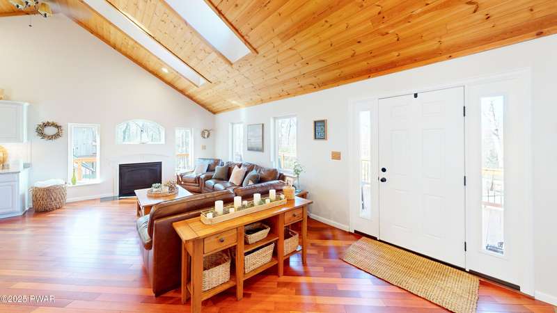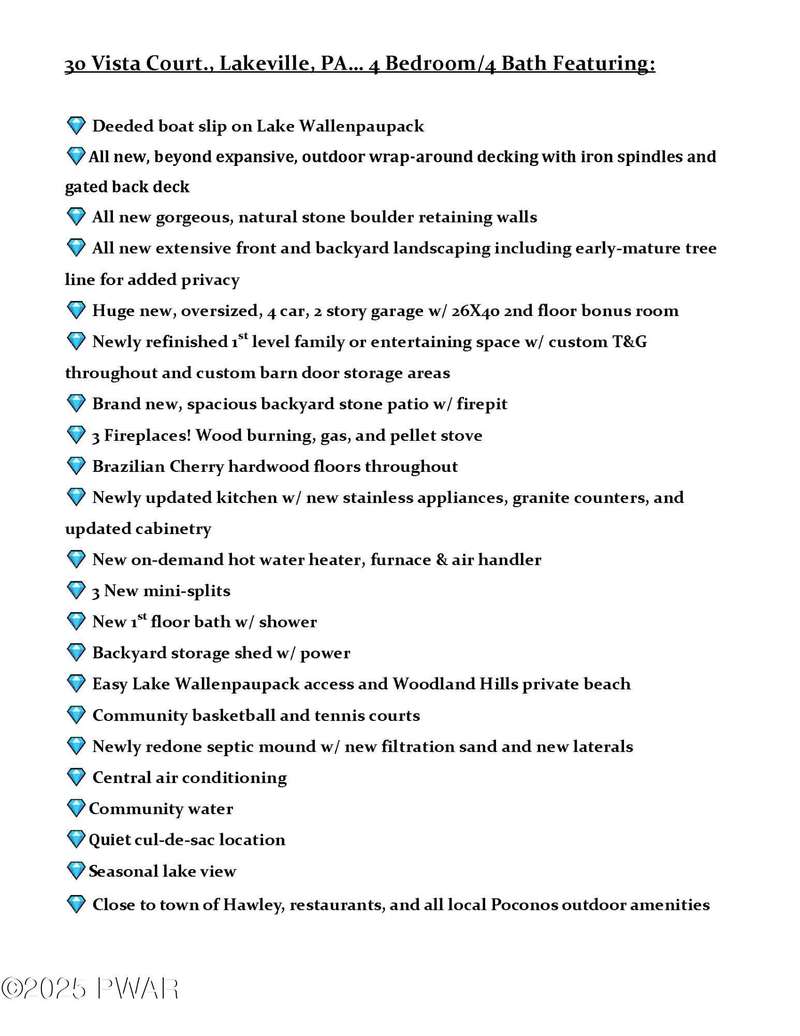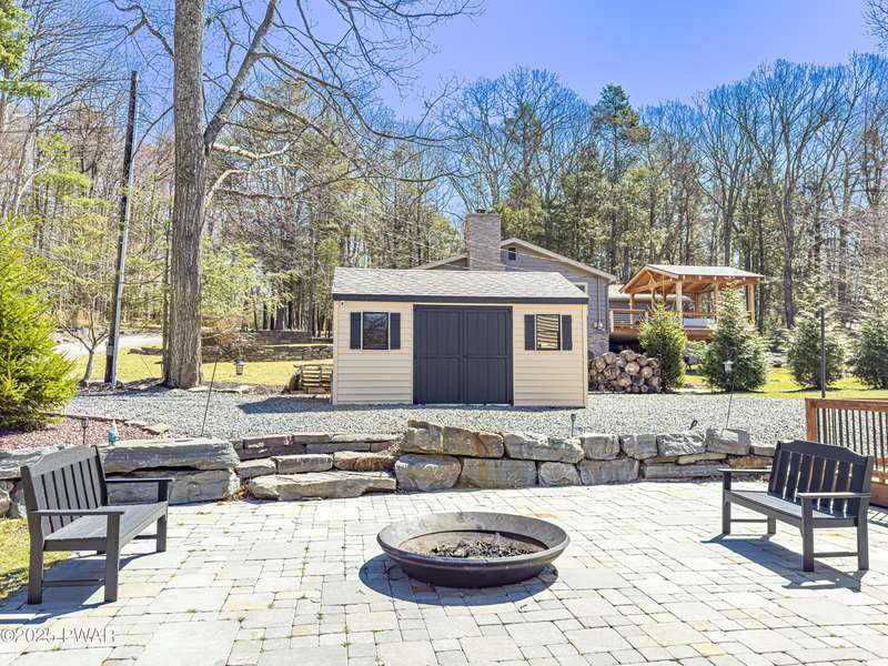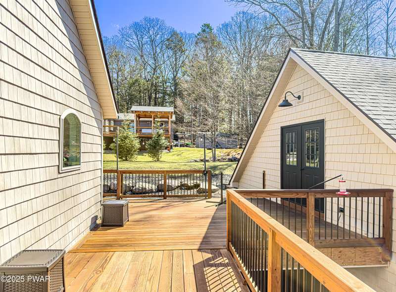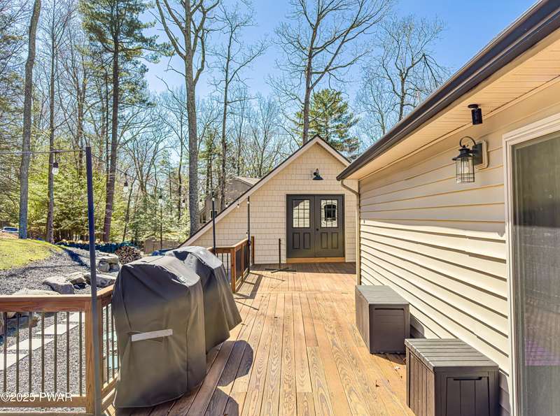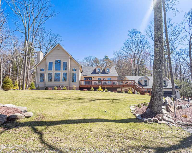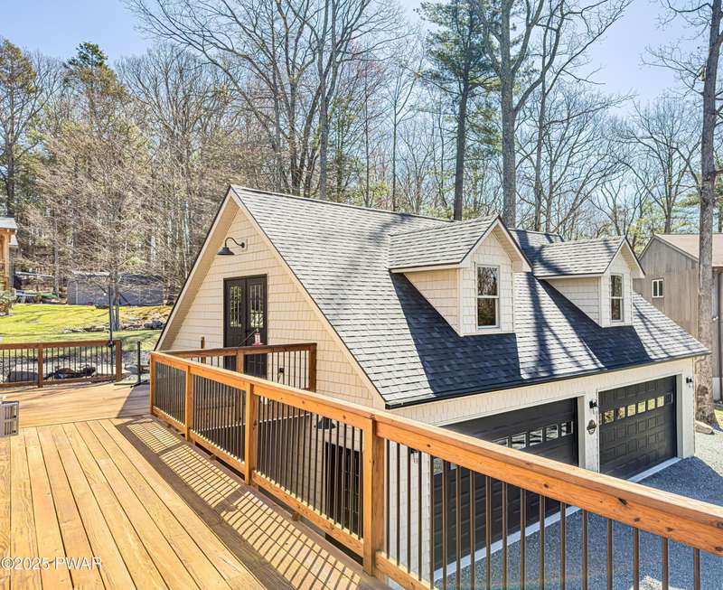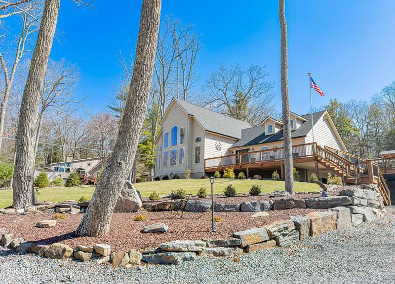STUNNING LAKE WALLENPAUPACK ''LAKE LIFE'' DREAM HOME READY TO CHECK ALL YOUR BOXES! With a coveted DEEDED BOAT SLIP, this more than impressive lake house is perfectly located in one of this lake's MOST desired, exclusive neighborhood of Woodland Hills, featuring its pristine private beach & all lakeside amenities. This home is a SUPER STUNNER from the moment you pull up... Thoughtfully designed & meticulously maintained, every feature you could possibly desire has been incorporated throughout this very special & spacious retreat! 4200+ SQ.FT. of living space w/ 4-5 BEDROOMS, 4 baths, soaring vaulted ceilings, floor to ceiling windows to further enhance the already light & bright ambiance of the open floor plan, Brazilian cherry HDWD floors throughout, beautifully inviting eat-in kitchen w/ PLENTY of space for family & friends w/ extra large dining area, kitchen island w/ storage, PLUS cozy sitting/living rm w/ shared fireplace. Breathtaking great room to accommodate any gathering or event w/ floor to ceiling stone REAL WOOD fireplace (ready to be easily converted if desired). Multiple lower level living, sleeping, & entertainment areas featuring a GORGEOUS & spacious family rm, all newly redone w/ beautiful custom T&G throughout, & custom barn door storage areas, lower level bath w/ shower, & walk out access. Outside features incl. beyond ample parking & storage w/ a large, gently sloped private driveway & HUGE oversized 4 car, 2 story garage w/ 26X40 2nd floor open area that's level to the deck area for easy access & ready to be finished into whatever addt'l space you wish. Corner lot on a quiet cul-de-sac road w/ lush yet low maintenance all new landscaping, newly upgraded wrap-around decking w/ wrought iron rail system, extended entertaining space on the brand new stone patio w/ firepit & surrounded by natural stone boulders w/ views to the addt'l storage shed which can be used to enjoy fireside movies & sports outdoors!