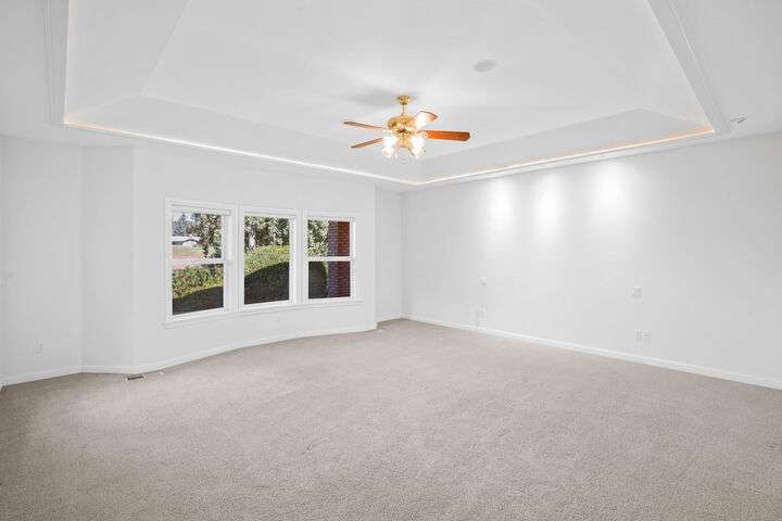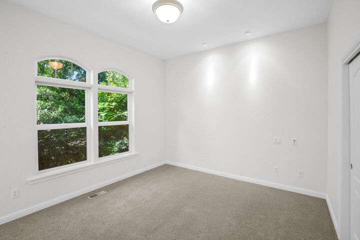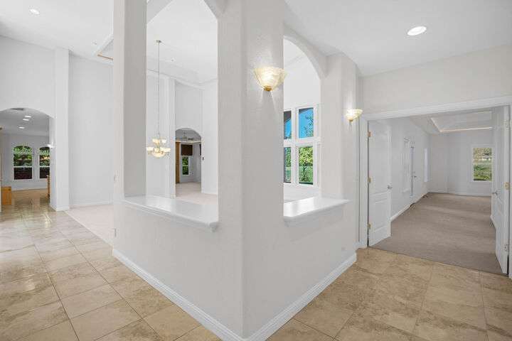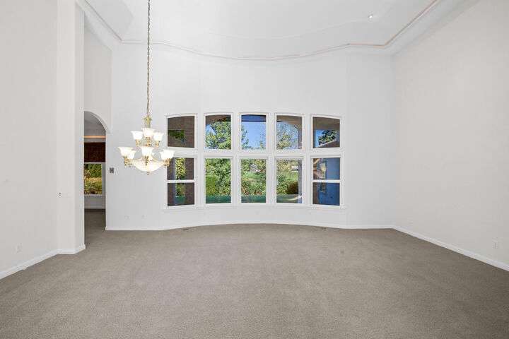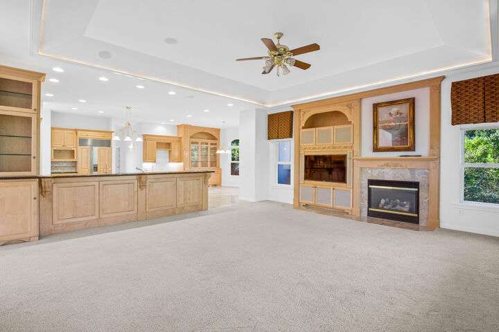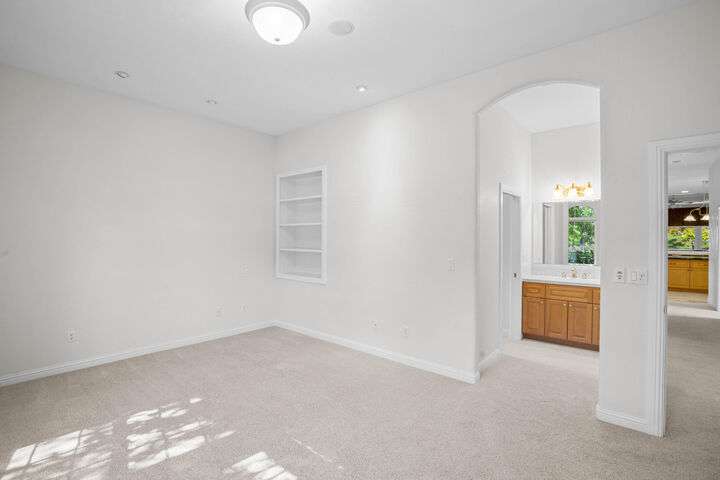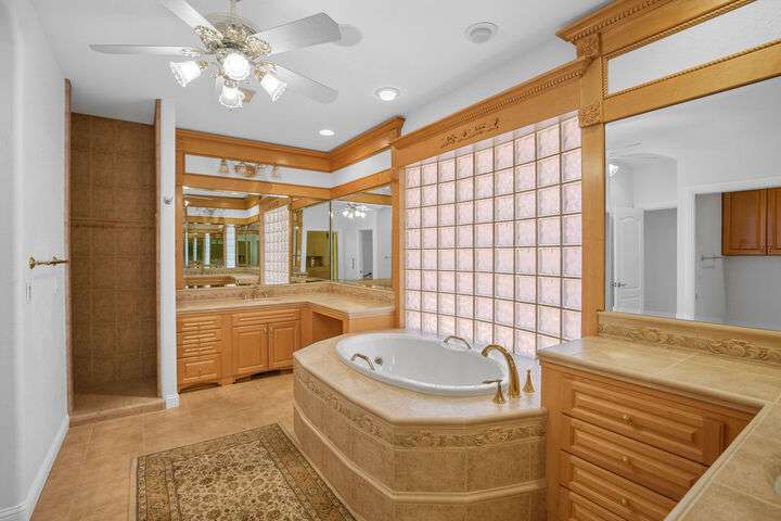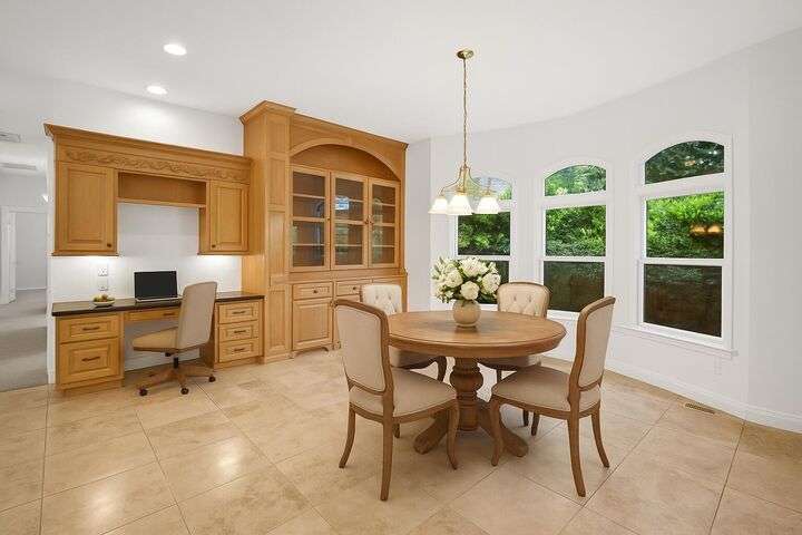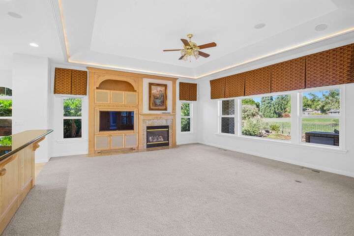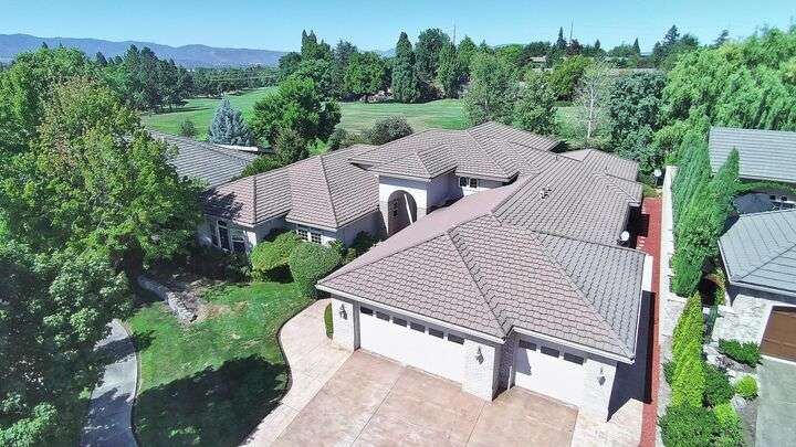Tucked behind the gates of the prestigious Island Pointe community, a one-of-a-kind opportunity awaits—this custom-built masterpiece has had only one owner. Perched on the 12th tee of Rogue Valley Country Club, the 4,118 sqft single-level home was designed for both comfort and grandeur. Step inside to be impressed with soaring ceilings, a dramatic wall of windows, cozy gas fireplace, and built-in TV—an entertainer's dream. The heart of the home, a chef's kitchen, is equipped with granite counters, double ovens, a warming drawer, and thoughtful pull-out cabinetry. The luxurious main suite offers a spa-like escape with jetted tub, walk-in tile shower, dual vanities, and a grand closet. A second primary suite on the opposite wing creates ideal flexibility for multigenerational living. With 5 bedrooms, 4 bathrooms (3 with heated floors), a 4-car garage, remote patio awning, and more, this exquisite home offers luxury living with breathtaking golf course view.