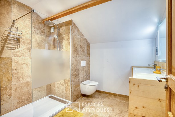 The entire hamlet has several stone houses, renovated and to be renovated. A wooden drying shed, transformed into a 70 sqm house, offers a bedroom with an office, an open kitchen and a bright living room. A first semi-detached house of 88 sqm, fully restored, includes two bedrooms and a kitchen open to the dining room and living room.