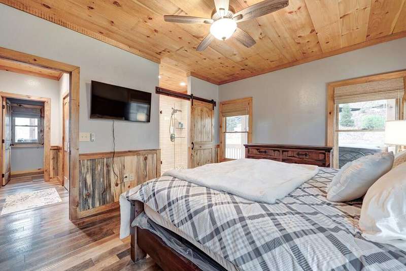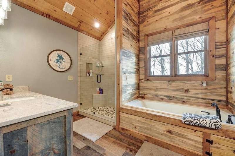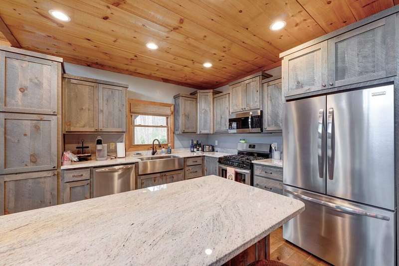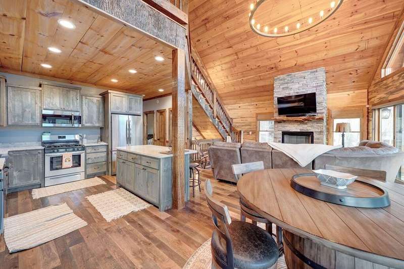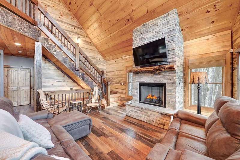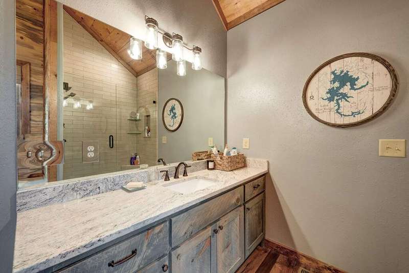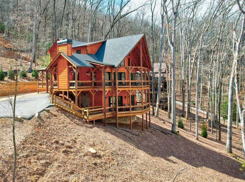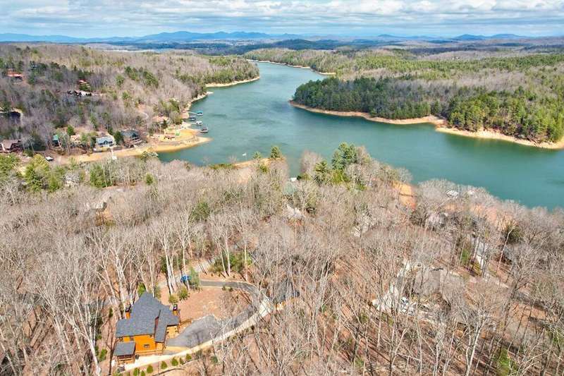 This stunning prow-front cabin features a window wall that brings the outdoors inside. The cabin offers a spacious Garage and multiple outdoor living areas, including a Party Porch with a wood-burning Fireplace, a Hot Tub porch, wraparound decks, and a generator. The direct access to Lake Blue Ridge is ideal for kayaking and paddle boarding. The great room boasts a majestic stone fireplace with a cedar mantel that seamlessly flows into the dining area: the kitchen has granite countertops, custom cabinetry, and stainless-steel appliances. The cabin showcases beautiful "Blue Buggy" tongue-and-groove (T&G) interior walls, bark accents, tiled showers, and granite countertops. The terrace level includes a family room featuring a wet bar, pool table, and rocked fireplace. Each level has a spacious bedroom with a full bath and an additional half bath on the main floor. The laundry is conveniently located on the main level, and ample storage space ensures you have room for all your gear and belongings. The cabin is situated in an established neighborhood with all-paved access, this cabin is just a short walk from the Necowa Cove community access. You can take advantage of the nearby Aska Trail System for hiking, mountain biking, and immersing yourself in nature while only ten minutes away from downtown Blue Ridge. Public boat launch and the Toccoa River are just minutes away. Fully furnished and offering seasonal views of the mountains and shimmering light off of the lake, this cabin is the perfect getaway. Short-term rentals are allowed.